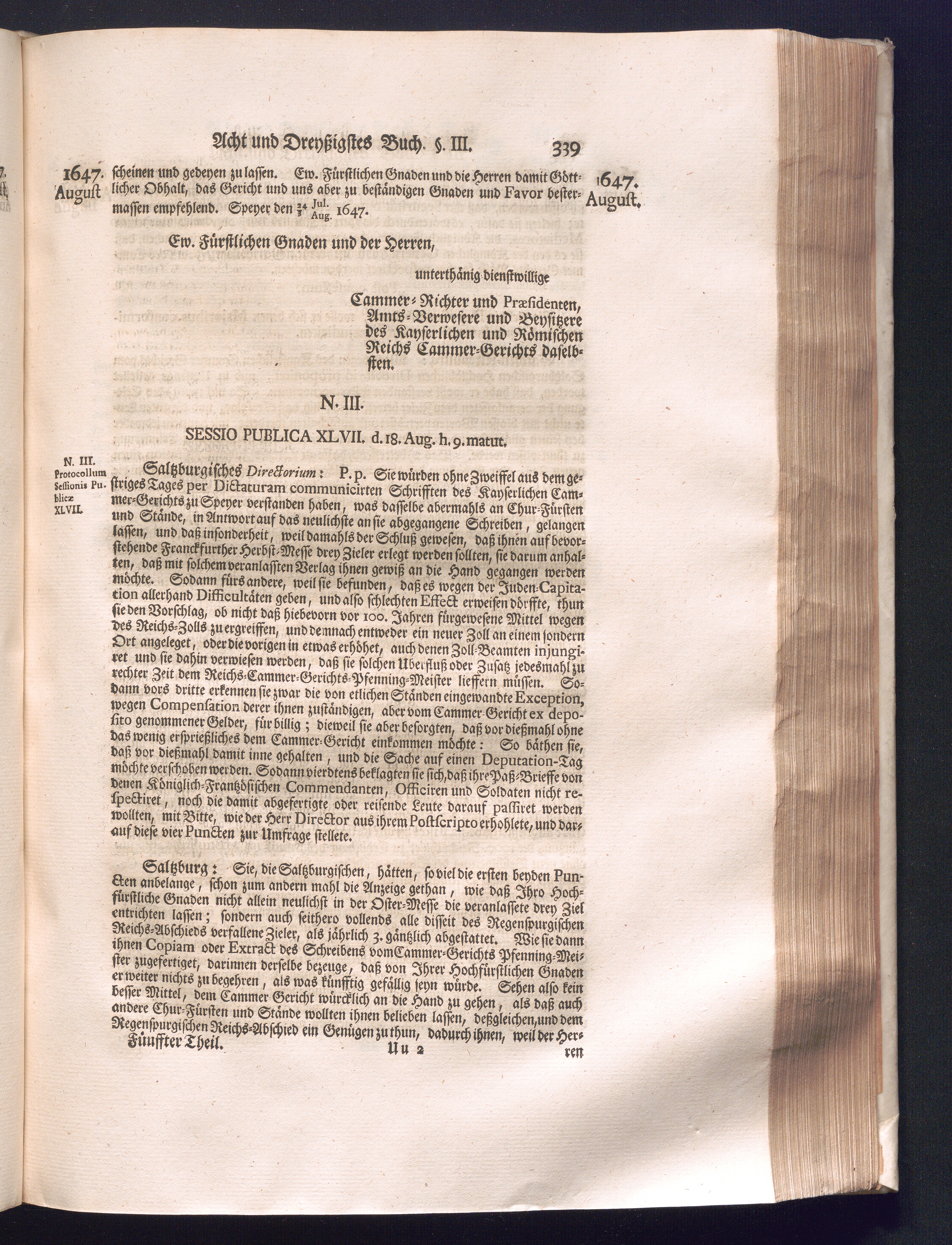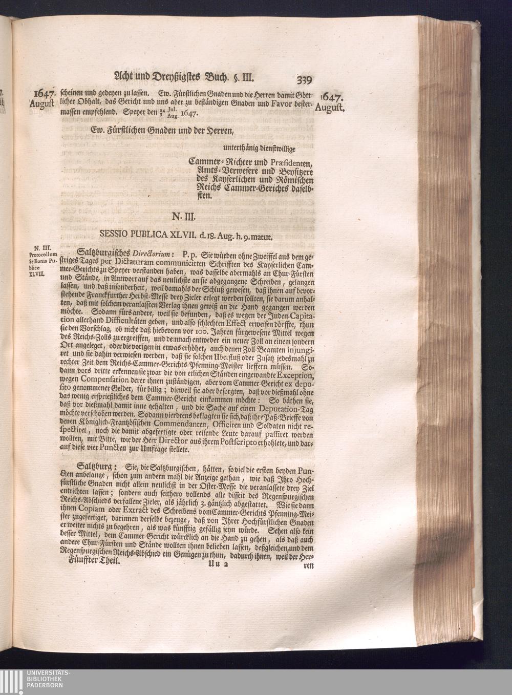 Fünffter Theil (1735) Worinnen enthalten, was vom Schluß des Jahrs 1647. biß in den Monath Junium des Jahrs 1648. zwischen Jhro Römisch-Kayserlichen Majestät, dann den Beyden Cronen Franckreich und Schweden, ingleichen des Heiligen Römischen Reichs Chur-Fürsten, Fürsten und Ständen, zu Oßnabrück und Münster gehandelt worden