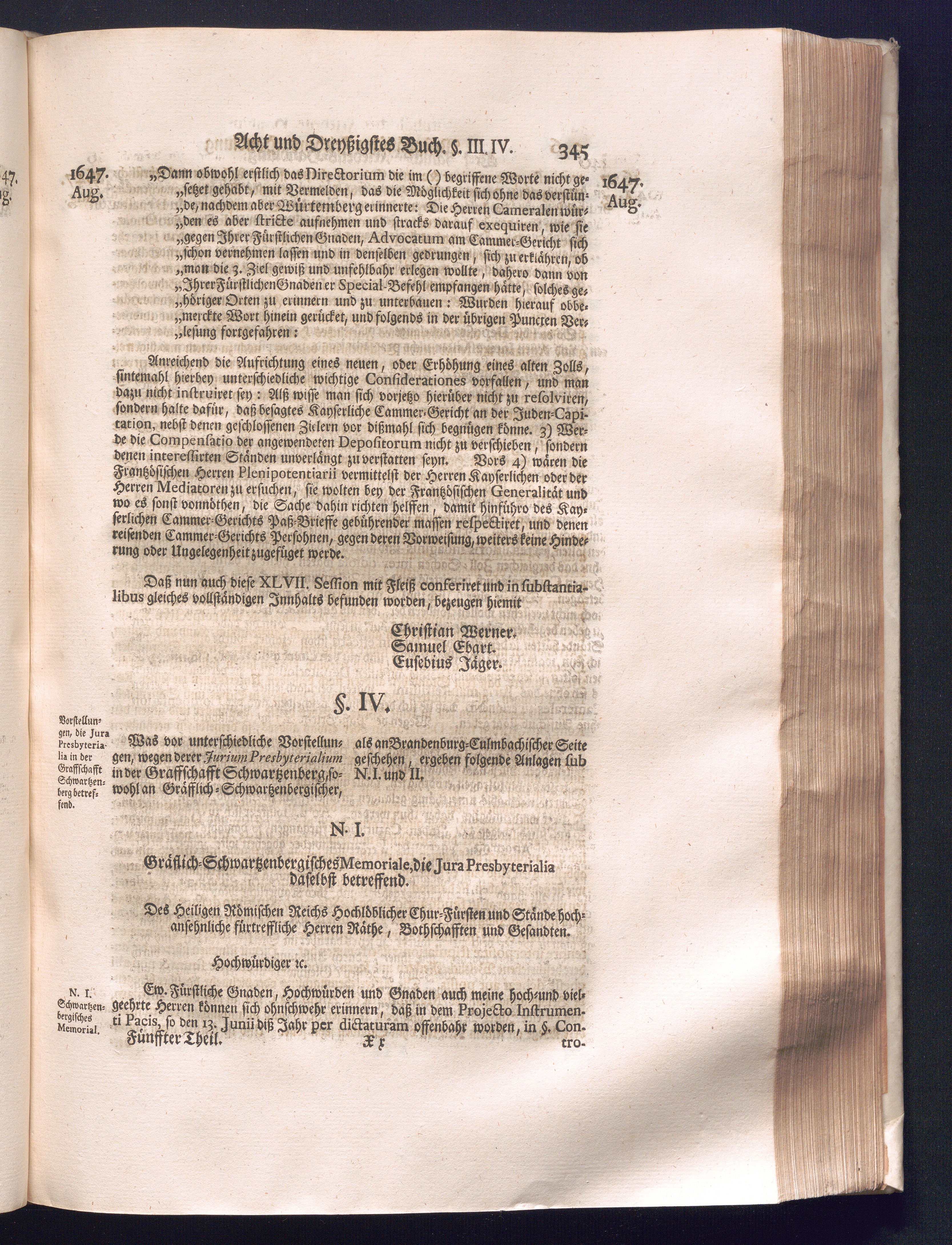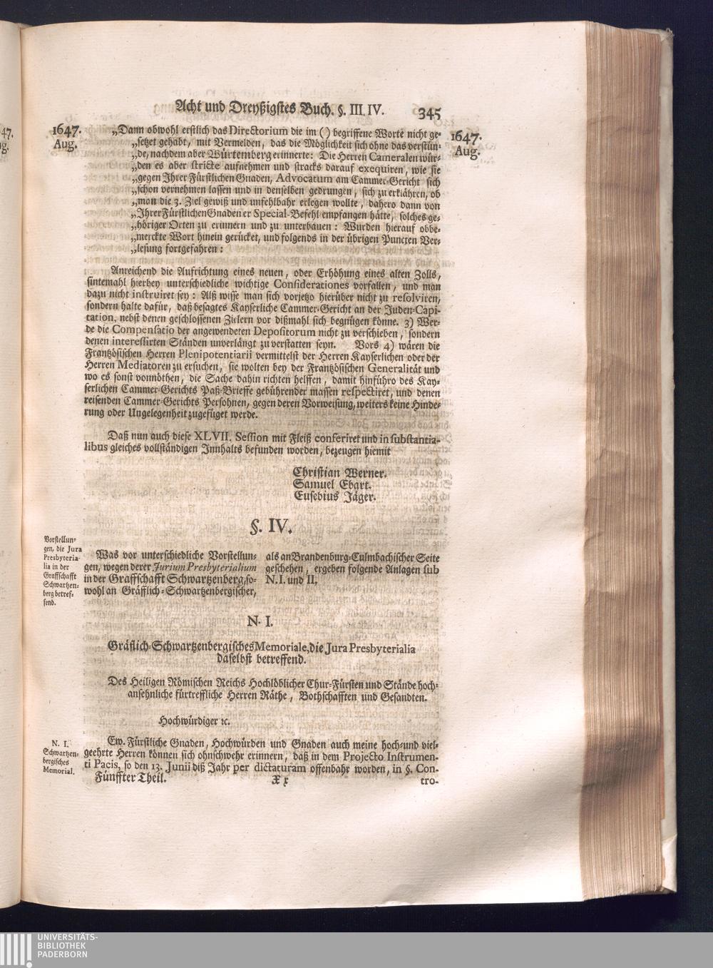 Fünffter Theil (1735) Worinnen enthalten, was vom Schluß des Jahrs 1647. biß in den Monath Junium des Jahrs 1648. zwischen Jhro Römisch-Kayserlichen Majestät, dann den Beyden Cronen Franckreich und Schweden, ingleichen des Heiligen Römischen Reichs Chur-Fürsten, Fürsten und Ständen, zu Oßnabrück und Münster gehandelt worden