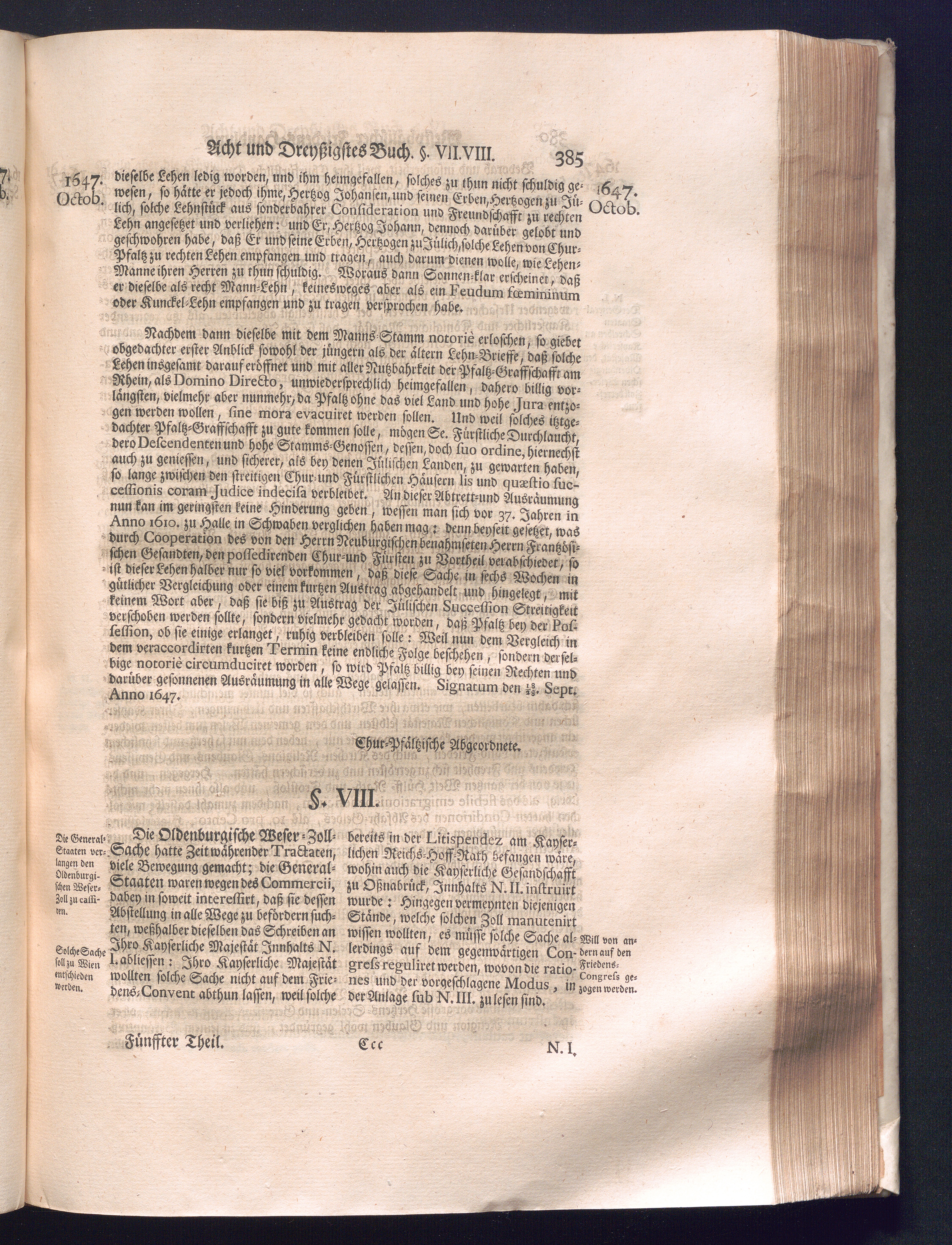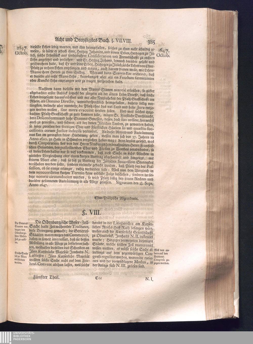 Fünffter Theil (1735) Worinnen enthalten, was vom Schluß des Jahrs 1647. biß in den Monath Junium des Jahrs 1648. zwischen Jhro Römisch-Kayserlichen Majestät, dann den Beyden Cronen Franckreich und Schweden, ingleichen des Heiligen Römischen Reichs Chur-Fürsten, Fürsten und Ständen, zu Oßnabrück und Münster gehandelt worden
