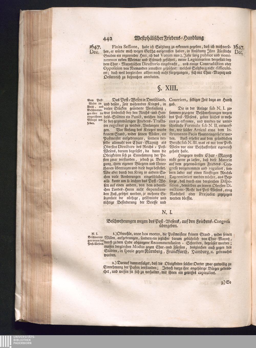 Fünffter Theil (1735) Worinnen enthalten, was vom Schluß des Jahrs 1647. biß in den Monath Junium des Jahrs 1648. zwischen Jhro Römisch-Kayserlichen Majestät, dann den Beyden Cronen Franckreich und Schweden, ingleichen des Heiligen Römischen Reichs Chur-Fürsten, Fürsten und Ständen, zu Oßnabrück und Münster gehandelt worden