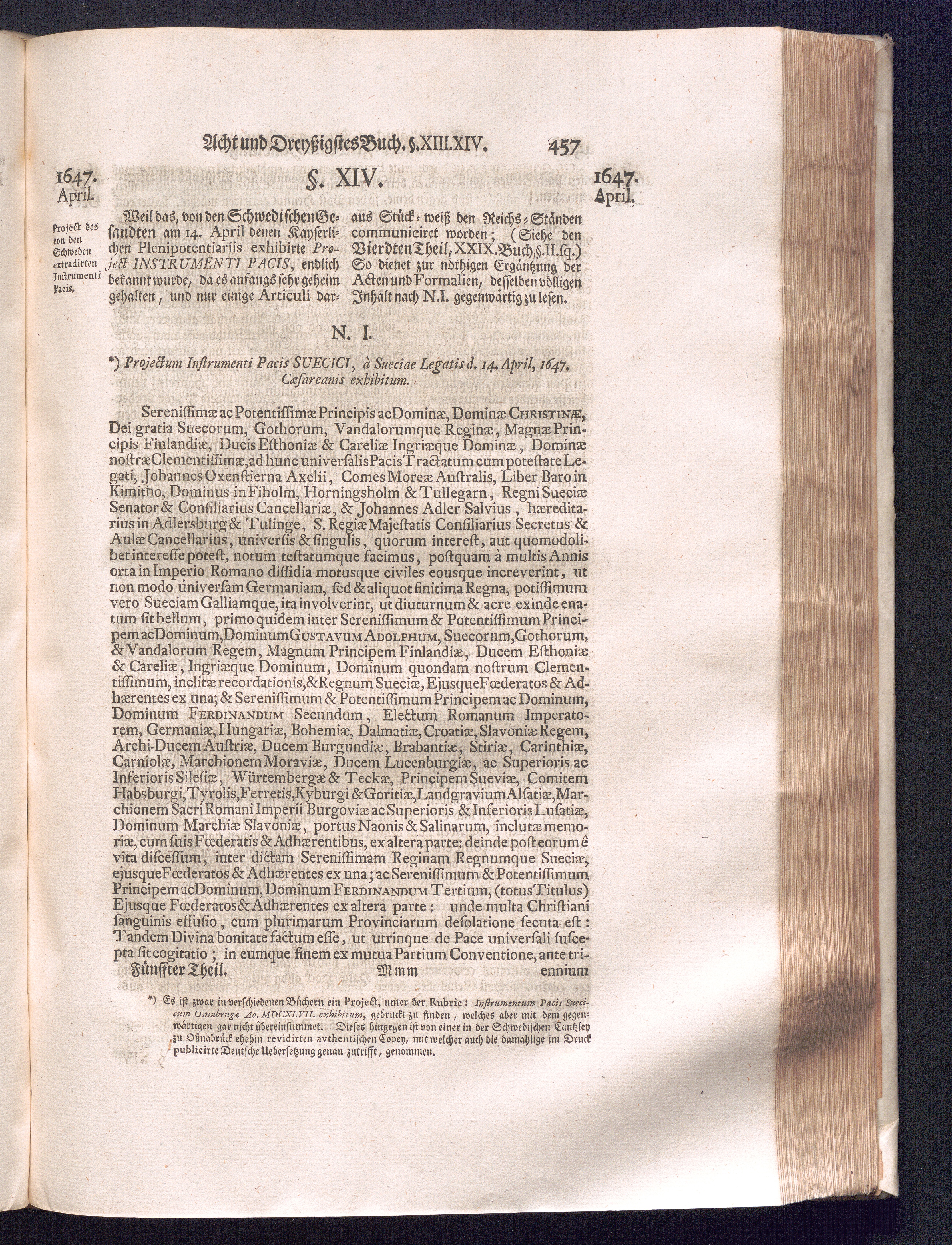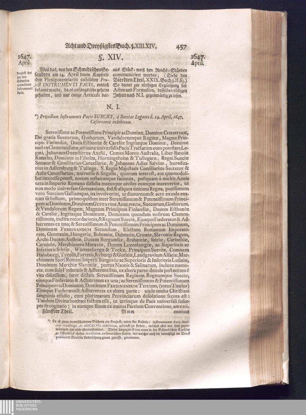 Fünffter Theil (1735) Worinnen enthalten, was vom Schluß des Jahrs 1647. biß in den Monath Junium des Jahrs 1648. zwischen Jhro Römisch-Kayserlichen Majestät, dann den Beyden Cronen Franckreich und Schweden, ingleichen des Heiligen Römischen Reichs Chur-Fürsten, Fürsten und Ständen, zu Oßnabrück und Münster gehandelt worden