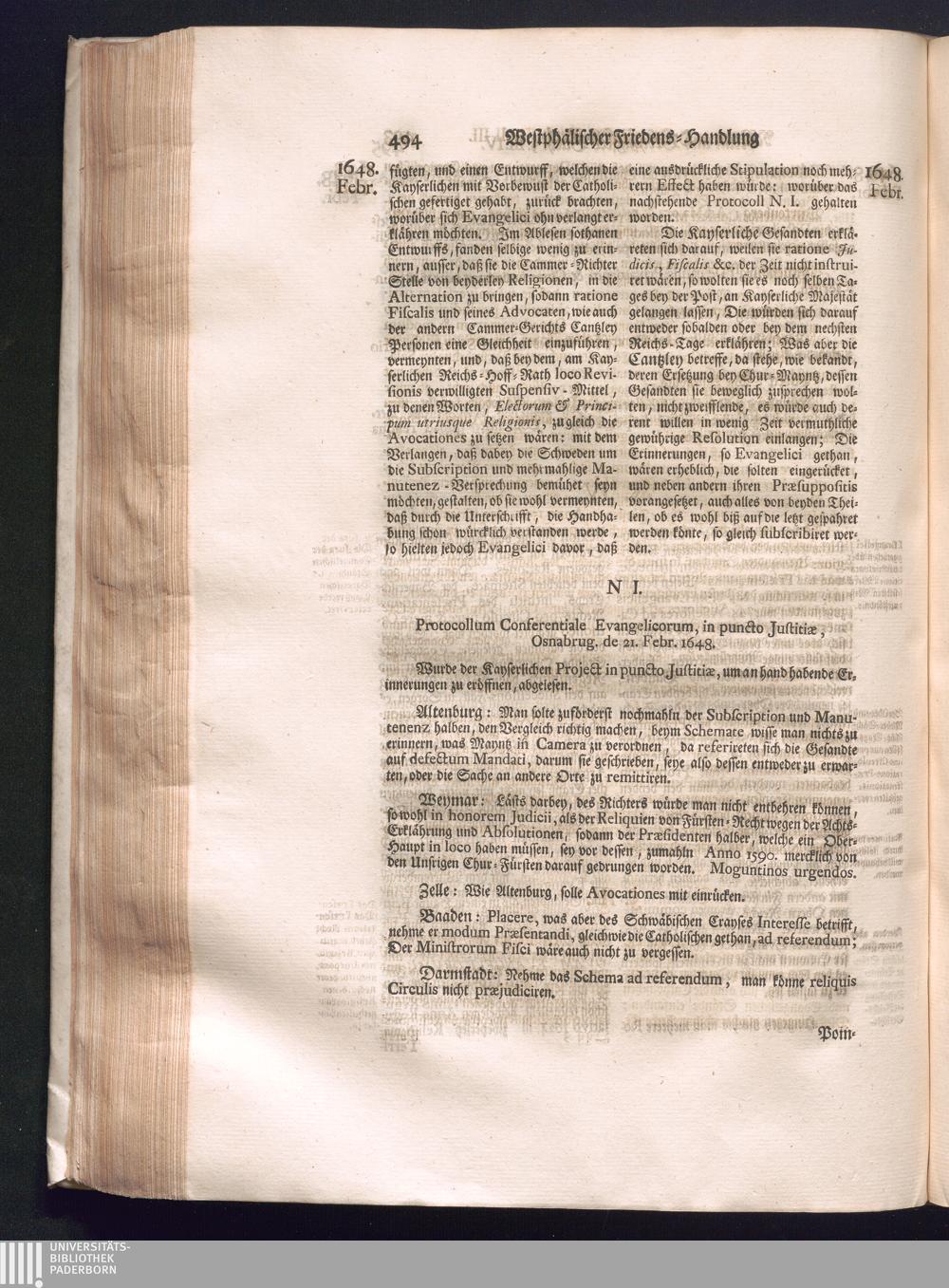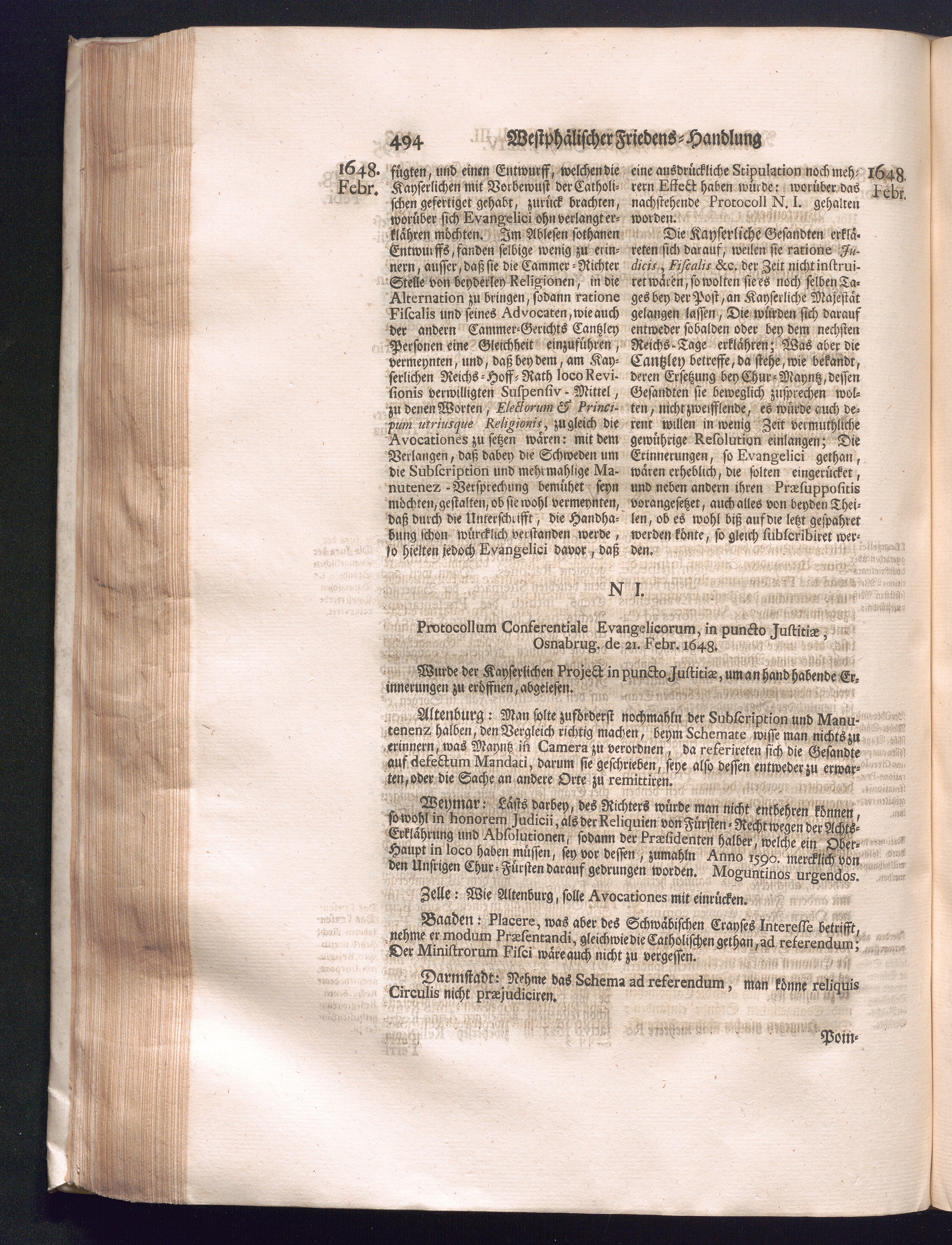 Fünffter Theil (1735) Worinnen enthalten, was vom Schluß des Jahrs 1647. biß in den Monath Junium des Jahrs 1648. zwischen Jhro Römisch-Kayserlichen Majestät, dann den Beyden Cronen Franckreich und Schweden, ingleichen des Heiligen Römischen Reichs Chur-Fürsten, Fürsten und Ständen, zu Oßnabrück und Münster gehandelt worden