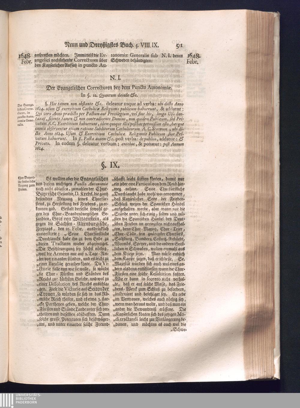 Fünffter Theil (1735) Worinnen enthalten, was vom Schluß des Jahrs 1647. biß in den Monath Junium des Jahrs 1648. zwischen Jhro Römisch-Kayserlichen Majestät, dann den Beyden Cronen Franckreich und Schweden, ingleichen des Heiligen Römischen Reichs Chur-Fürsten, Fürsten und Ständen, zu Oßnabrück und Münster gehandelt worden