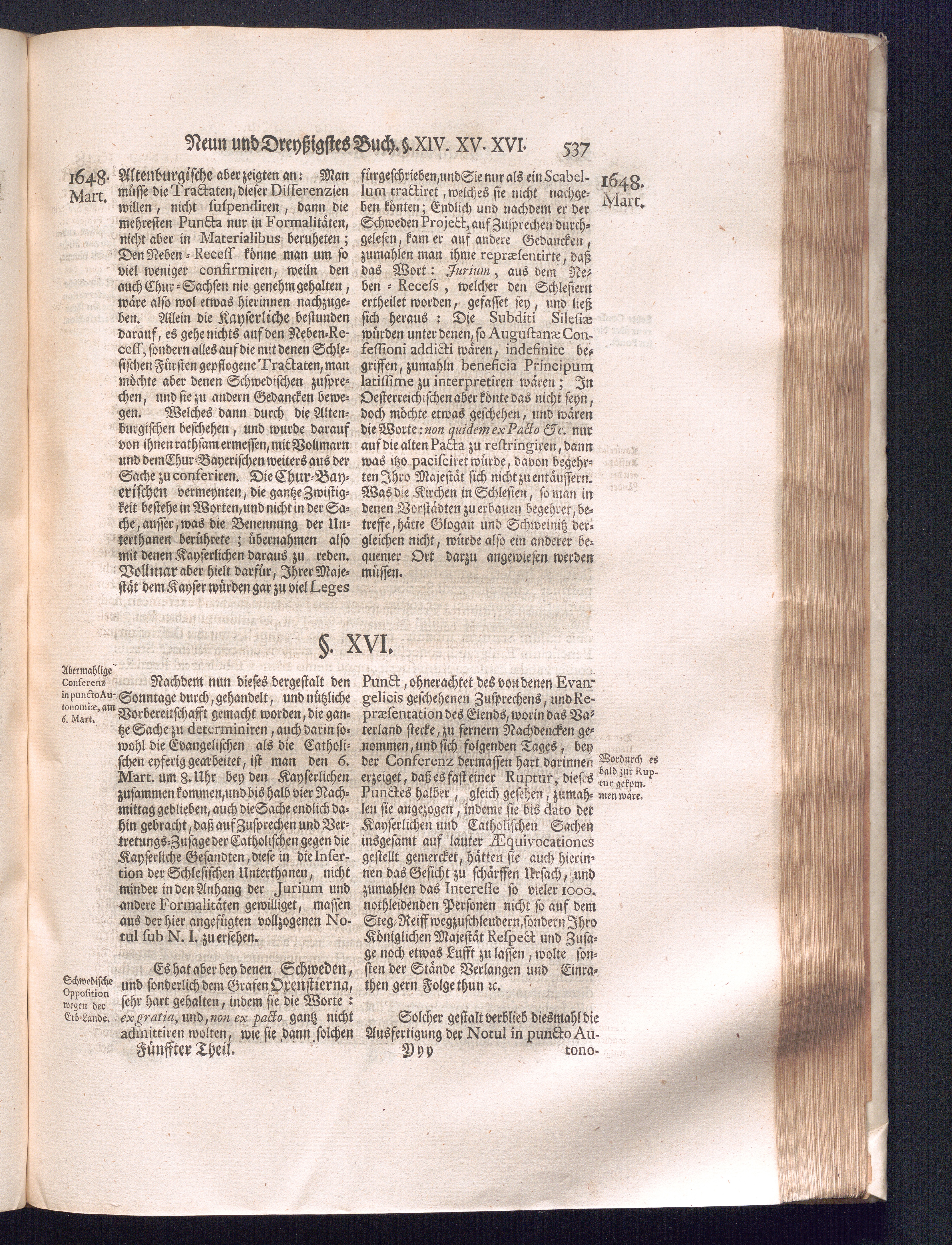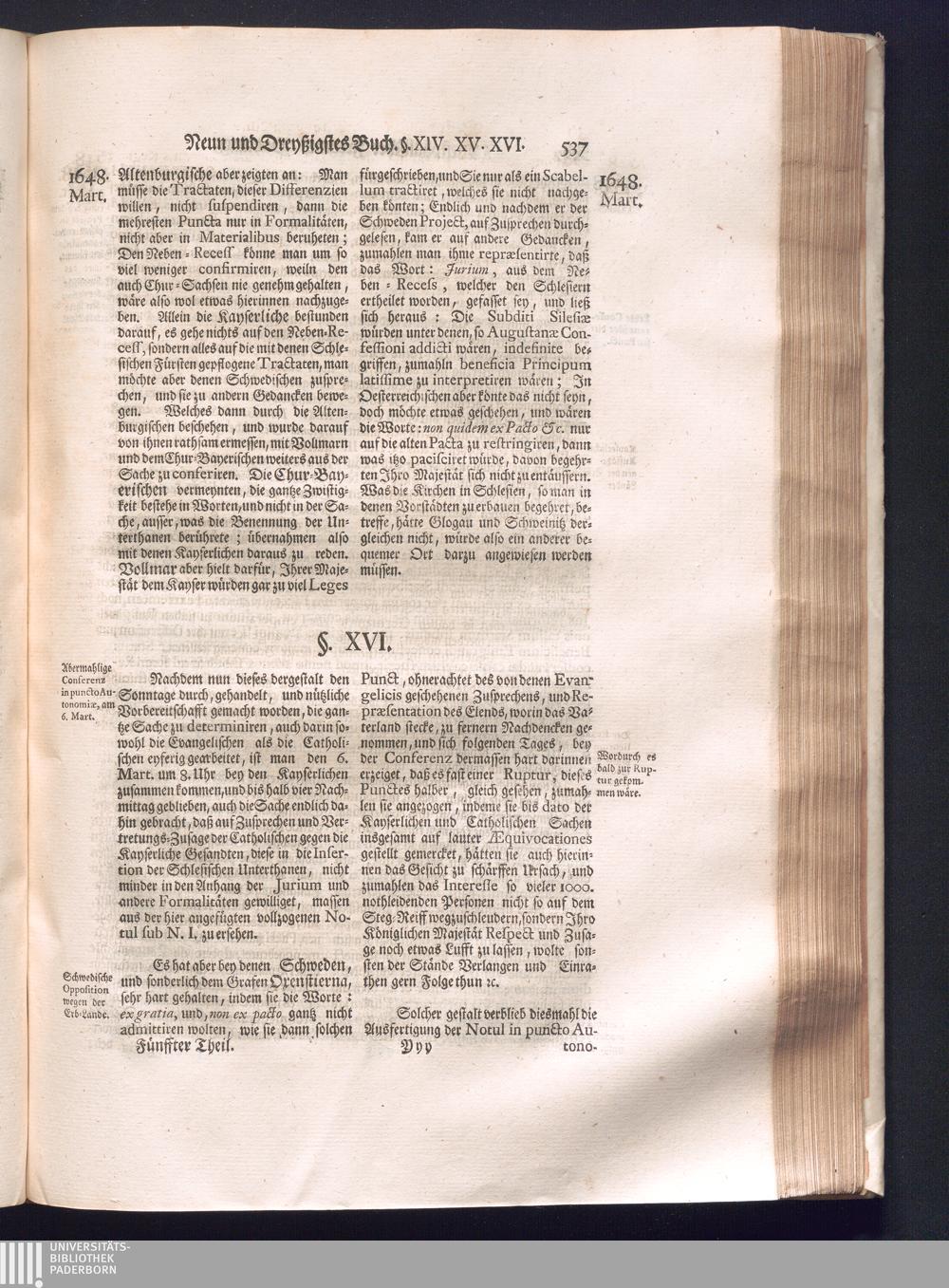 Fünffter Theil (1735) Worinnen enthalten, was vom Schluß des Jahrs 1647. biß in den Monath Junium des Jahrs 1648. zwischen Jhro Römisch-Kayserlichen Majestät, dann den Beyden Cronen Franckreich und Schweden, ingleichen des Heiligen Römischen Reichs Chur-Fürsten, Fürsten und Ständen, zu Oßnabrück und Münster gehandelt worden