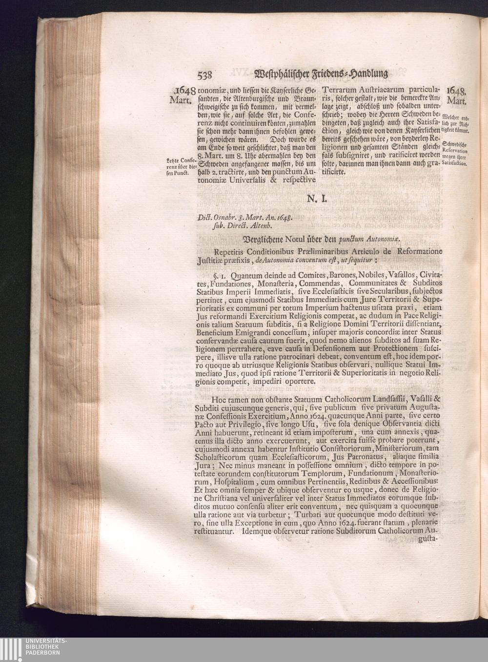 Fünffter Theil (1735) Worinnen enthalten, was vom Schluß des Jahrs 1647. biß in den Monath Junium des Jahrs 1648. zwischen Jhro Römisch-Kayserlichen Majestät, dann den Beyden Cronen Franckreich und Schweden, ingleichen des Heiligen Römischen Reichs Chur-Fürsten, Fürsten und Ständen, zu Oßnabrück und Münster gehandelt worden