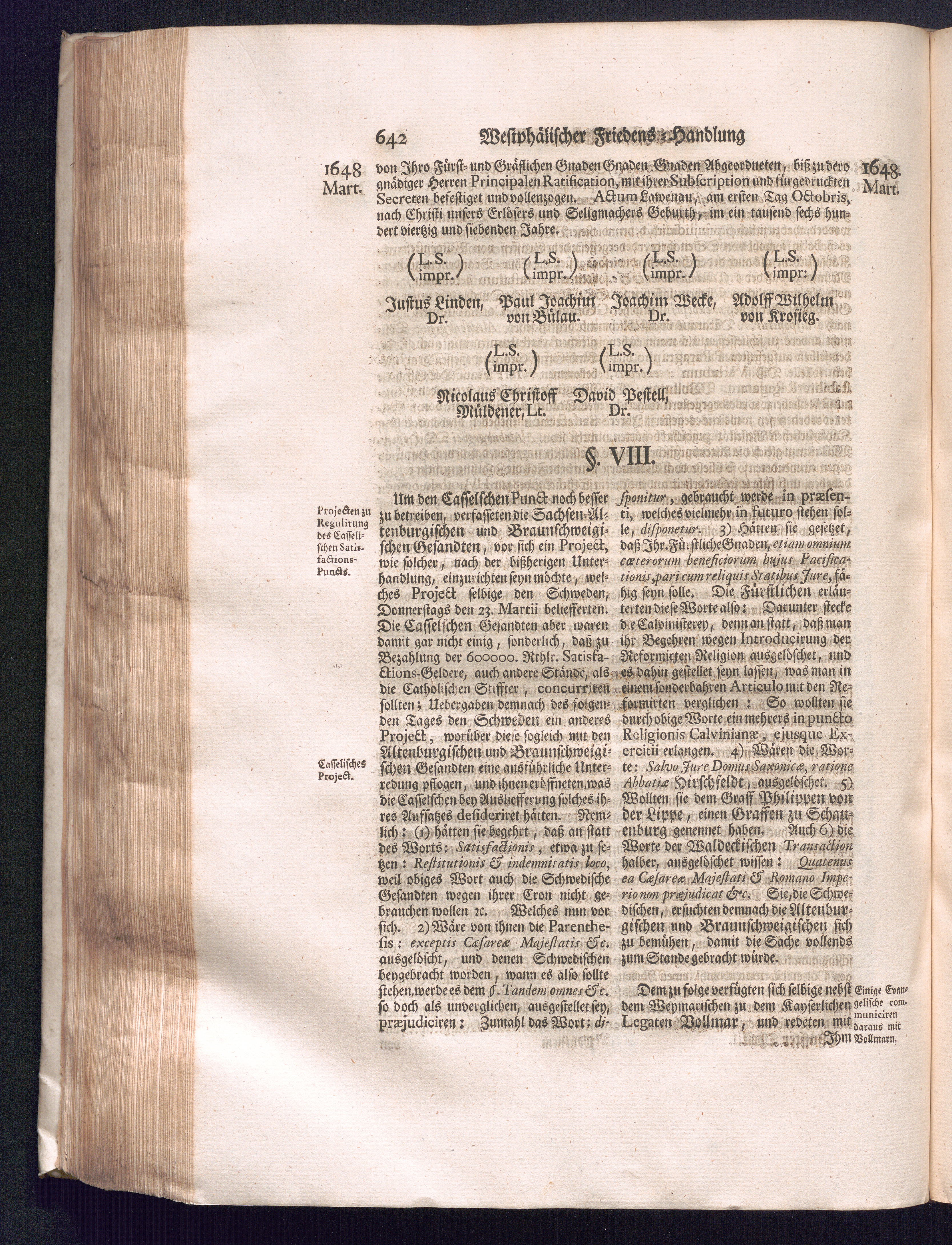 Fünffter Theil (1735) Worinnen enthalten, was vom Schluß des Jahrs 1647. biß in den Monath Junium des Jahrs 1648. zwischen Jhro Römisch-Kayserlichen Majestät, dann den Beyden Cronen Franckreich und Schweden, ingleichen des Heiligen Römischen Reichs Chur-Fürsten, Fürsten und Ständen, zu Oßnabrück und Münster gehandelt worden