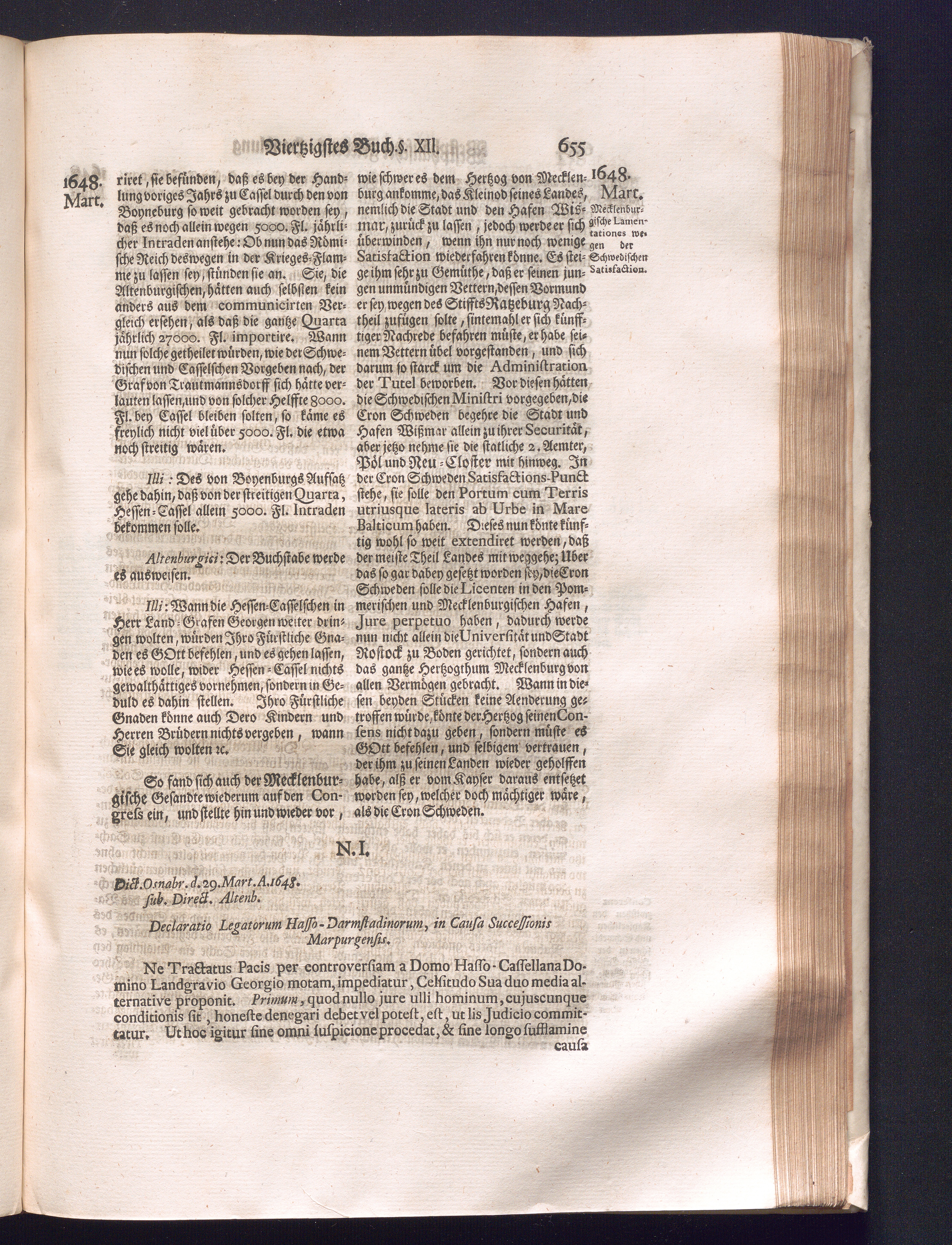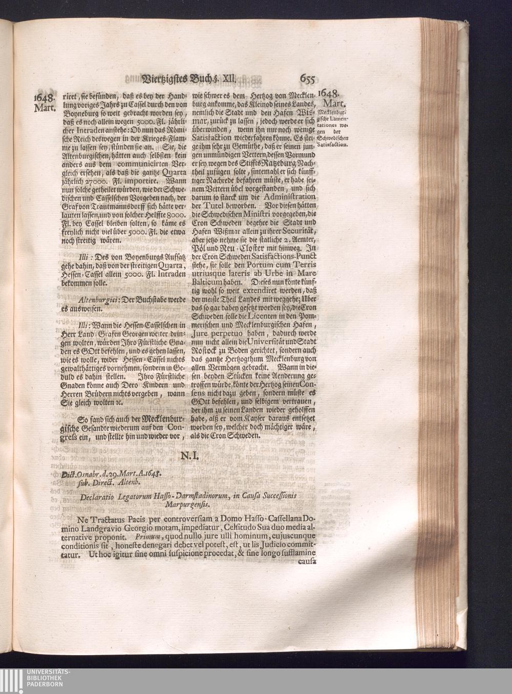 Fünffter Theil (1735) Worinnen enthalten, was vom Schluß des Jahrs 1647. biß in den Monath Junium des Jahrs 1648. zwischen Jhro Römisch-Kayserlichen Majestät, dann den Beyden Cronen Franckreich und Schweden, ingleichen des Heiligen Römischen Reichs Chur-Fürsten, Fürsten und Ständen, zu Oßnabrück und Münster gehandelt worden
