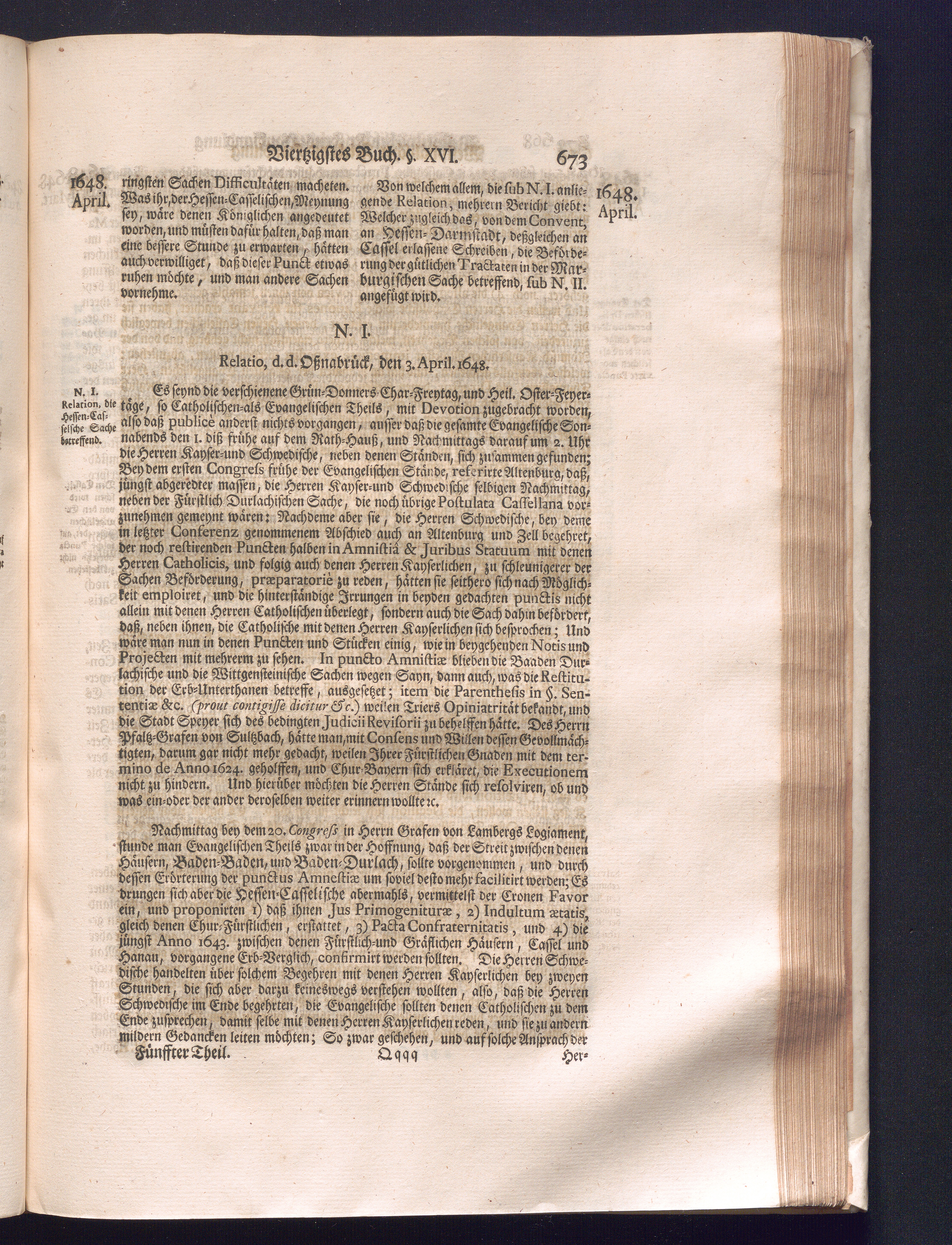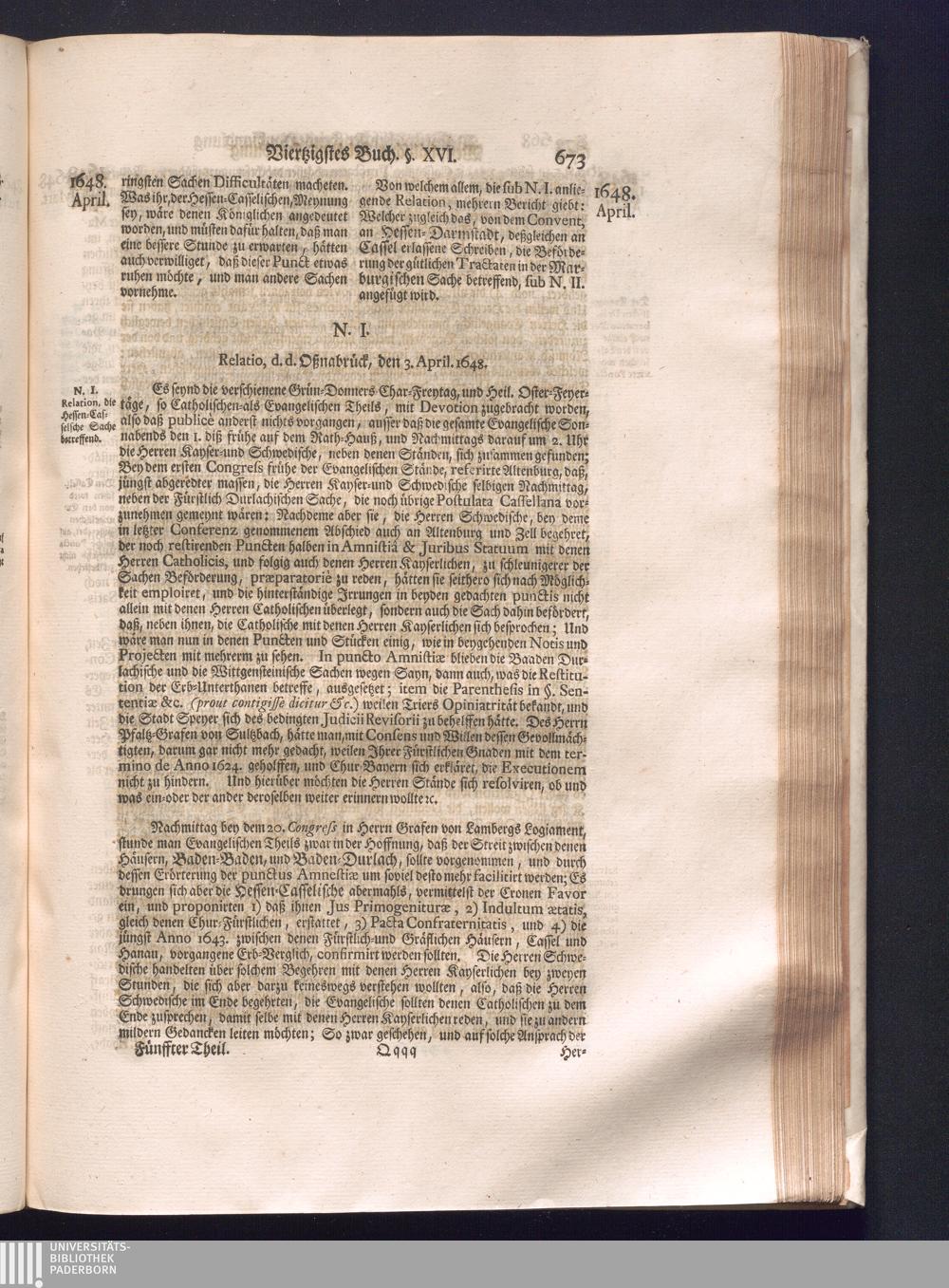 Fünffter Theil (1735) Worinnen enthalten, was vom Schluß des Jahrs 1647. biß in den Monath Junium des Jahrs 1648. zwischen Jhro Römisch-Kayserlichen Majestät, dann den Beyden Cronen Franckreich und Schweden, ingleichen des Heiligen Römischen Reichs Chur-Fürsten, Fürsten und Ständen, zu Oßnabrück und Münster gehandelt worden