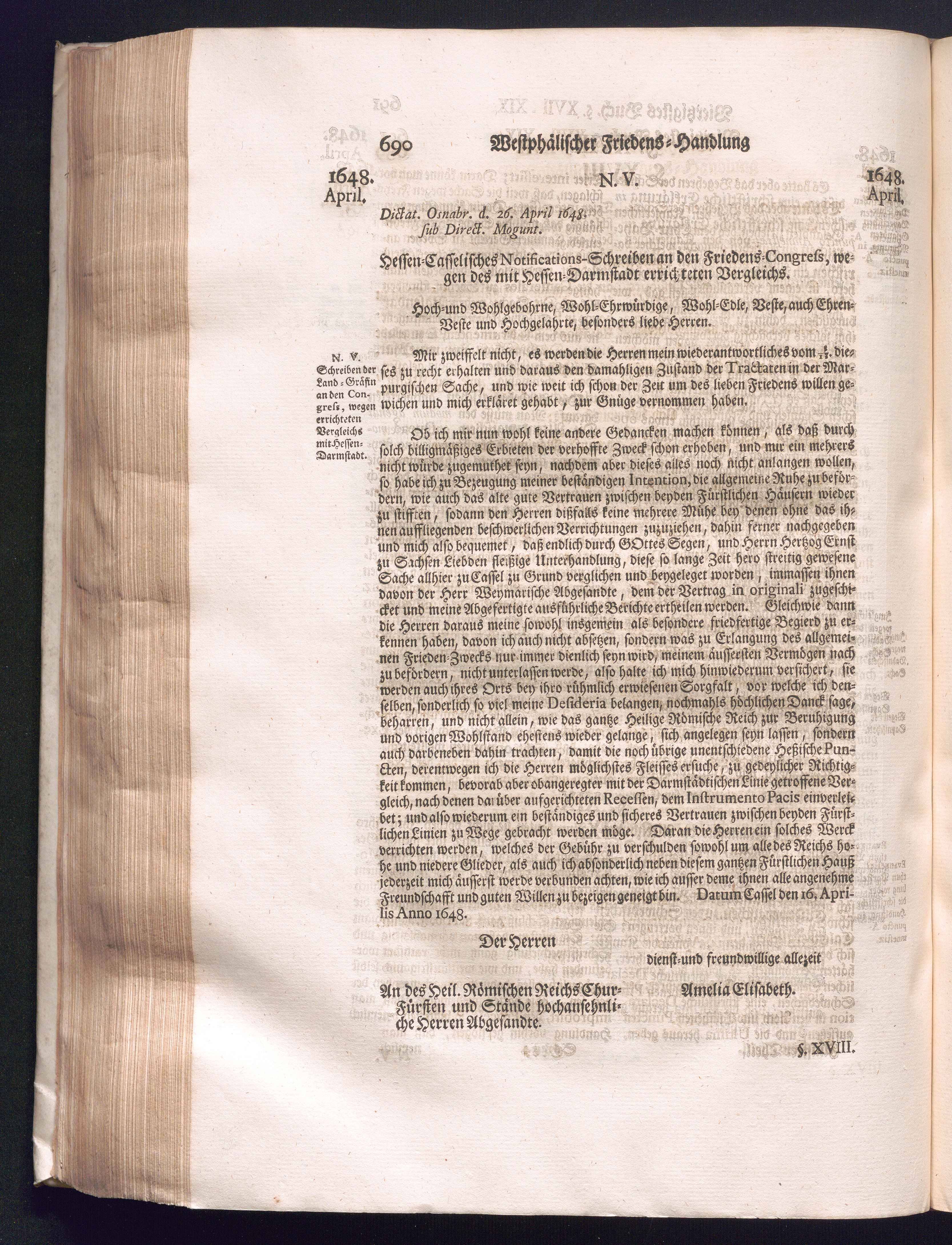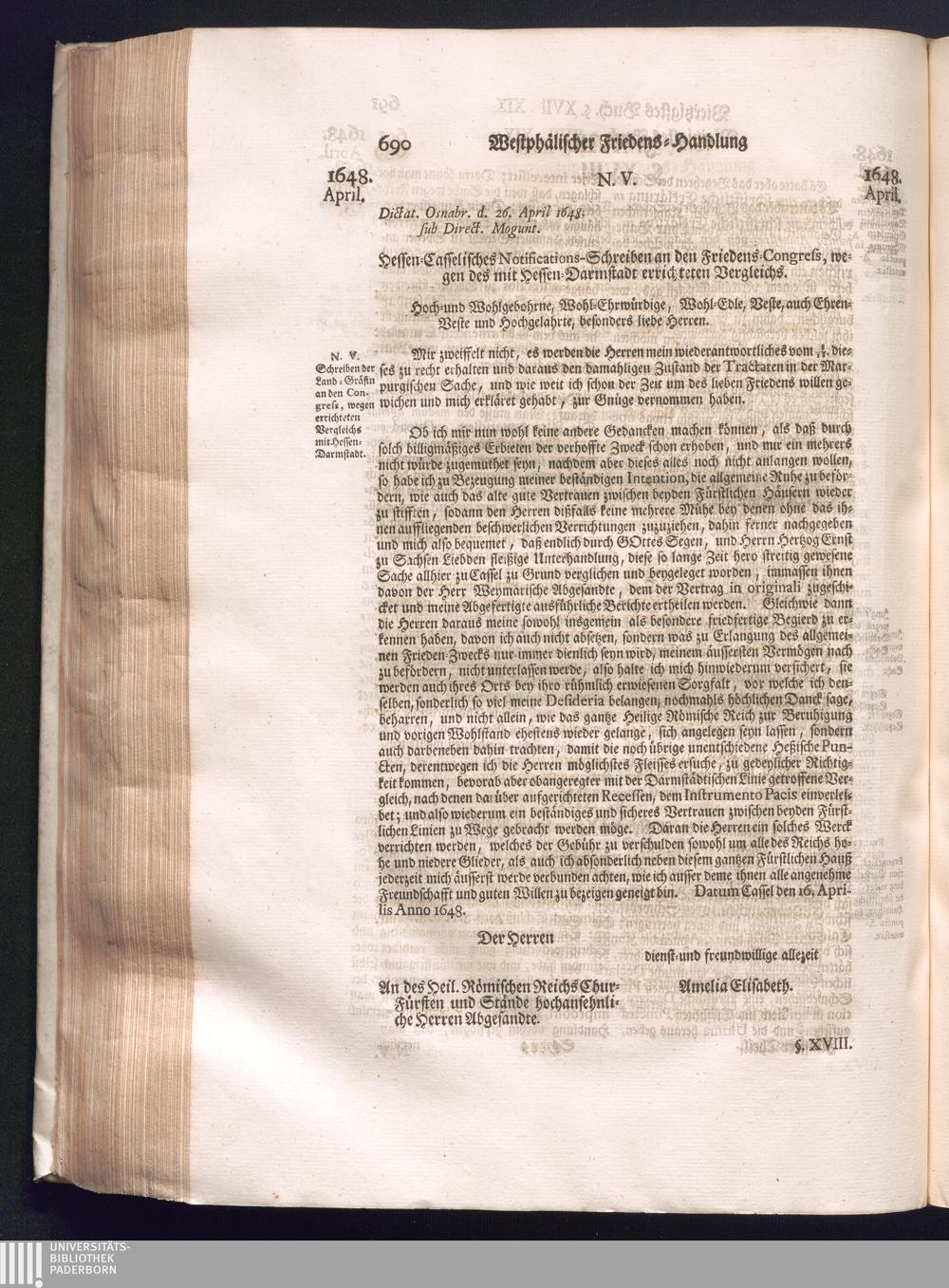 Fünffter Theil (1735) Worinnen enthalten, was vom Schluß des Jahrs 1647. biß in den Monath Junium des Jahrs 1648. zwischen Jhro Römisch-Kayserlichen Majestät, dann den Beyden Cronen Franckreich und Schweden, ingleichen des Heiligen Römischen Reichs Chur-Fürsten, Fürsten und Ständen, zu Oßnabrück und Münster gehandelt worden