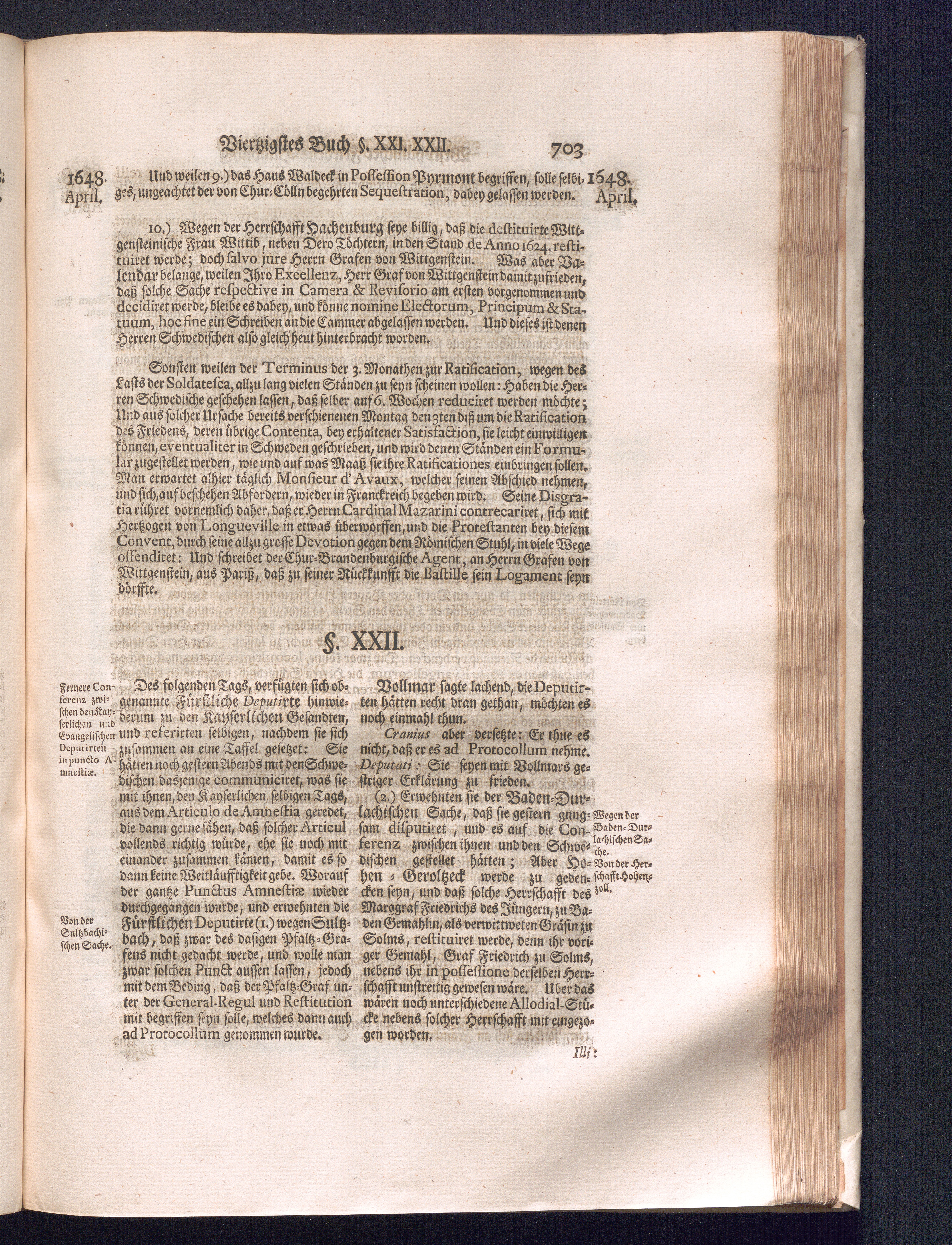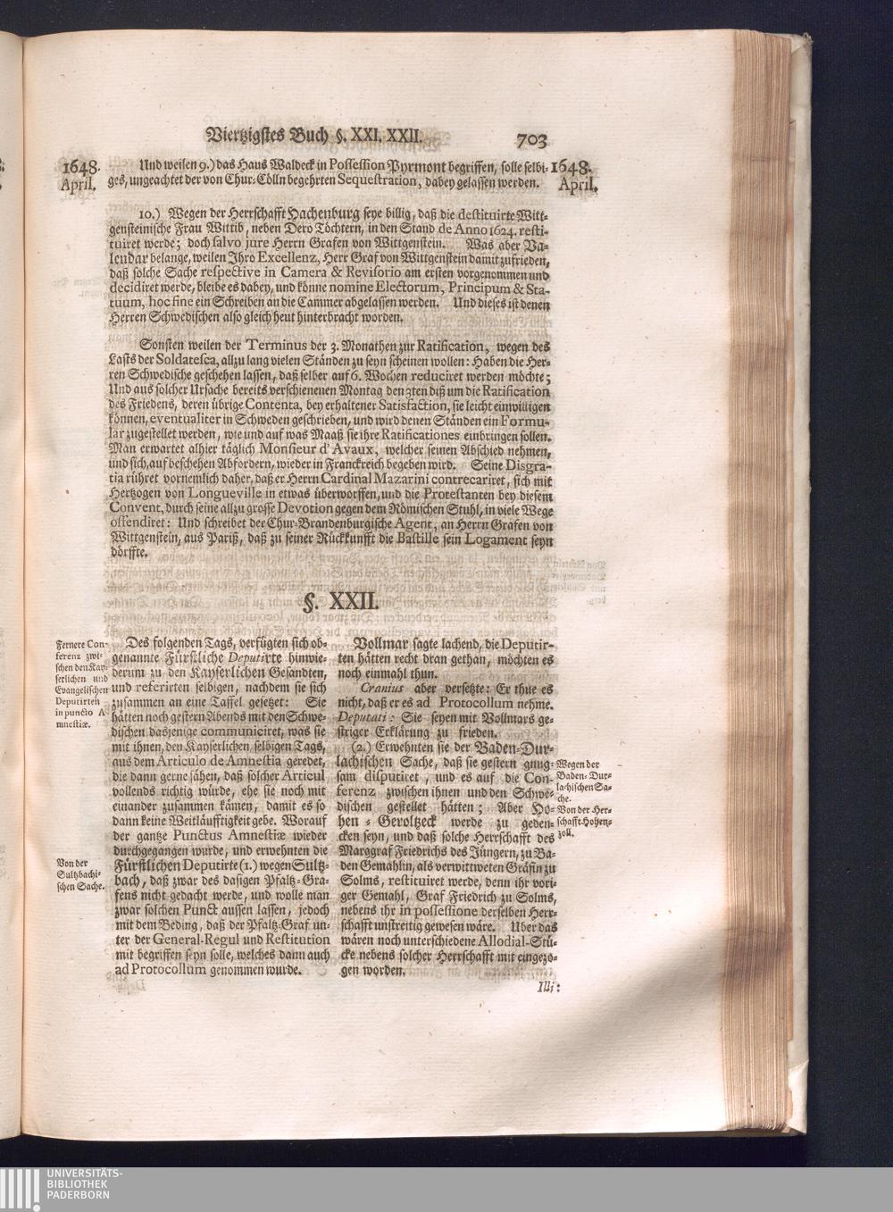 Fünffter Theil (1735) Worinnen enthalten, was vom Schluß des Jahrs 1647. biß in den Monath Junium des Jahrs 1648. zwischen Jhro Römisch-Kayserlichen Majestät, dann den Beyden Cronen Franckreich und Schweden, ingleichen des Heiligen Römischen Reichs Chur-Fürsten, Fürsten und Ständen, zu Oßnabrück und Münster gehandelt worden