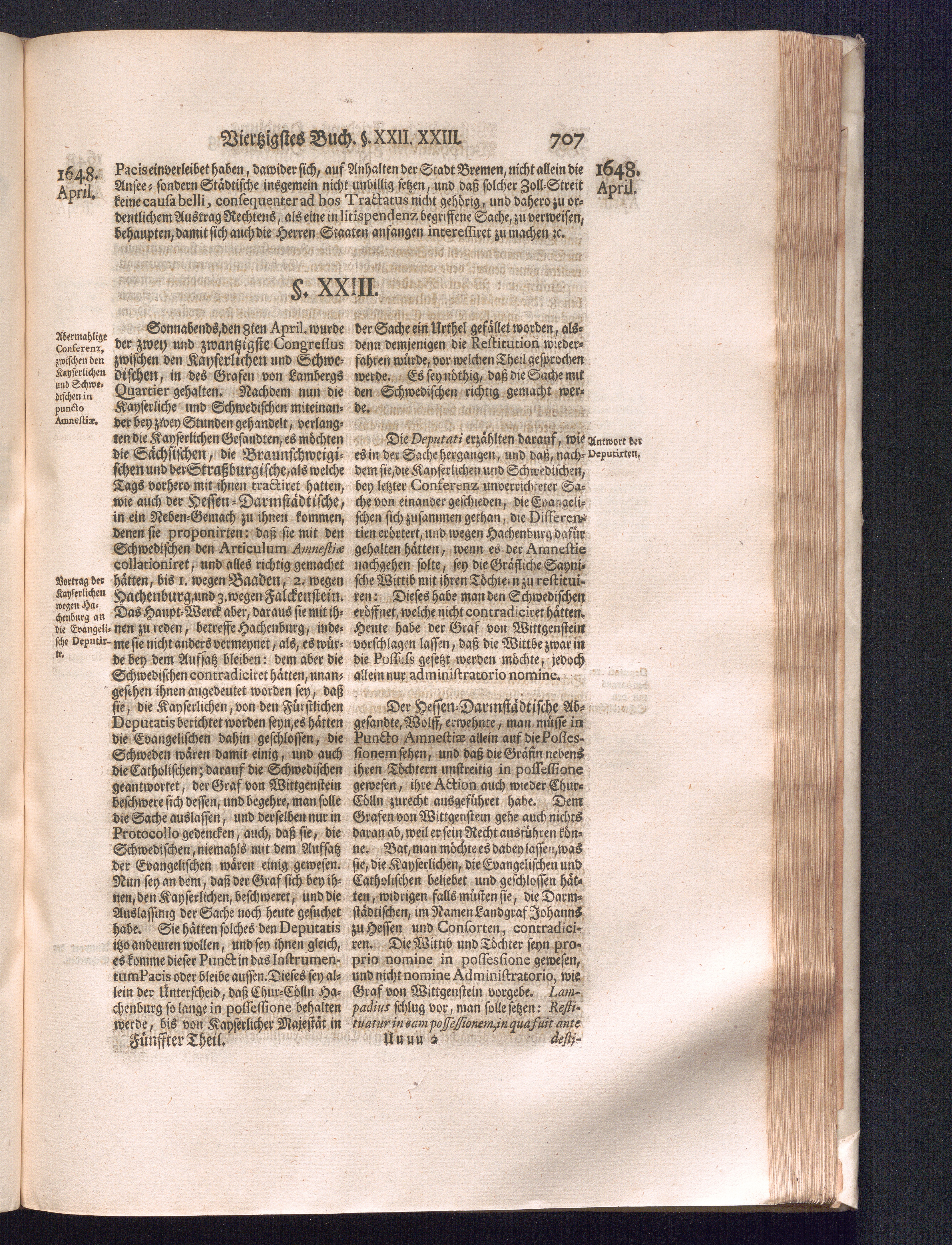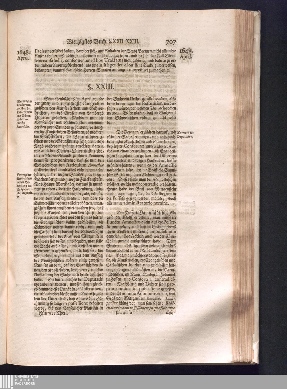 Fünffter Theil (1735) Worinnen enthalten, was vom Schluß des Jahrs 1647. biß in den Monath Junium des Jahrs 1648. zwischen Jhro Römisch-Kayserlichen Majestät, dann den Beyden Cronen Franckreich und Schweden, ingleichen des Heiligen Römischen Reichs Chur-Fürsten, Fürsten und Ständen, zu Oßnabrück und Münster gehandelt worden