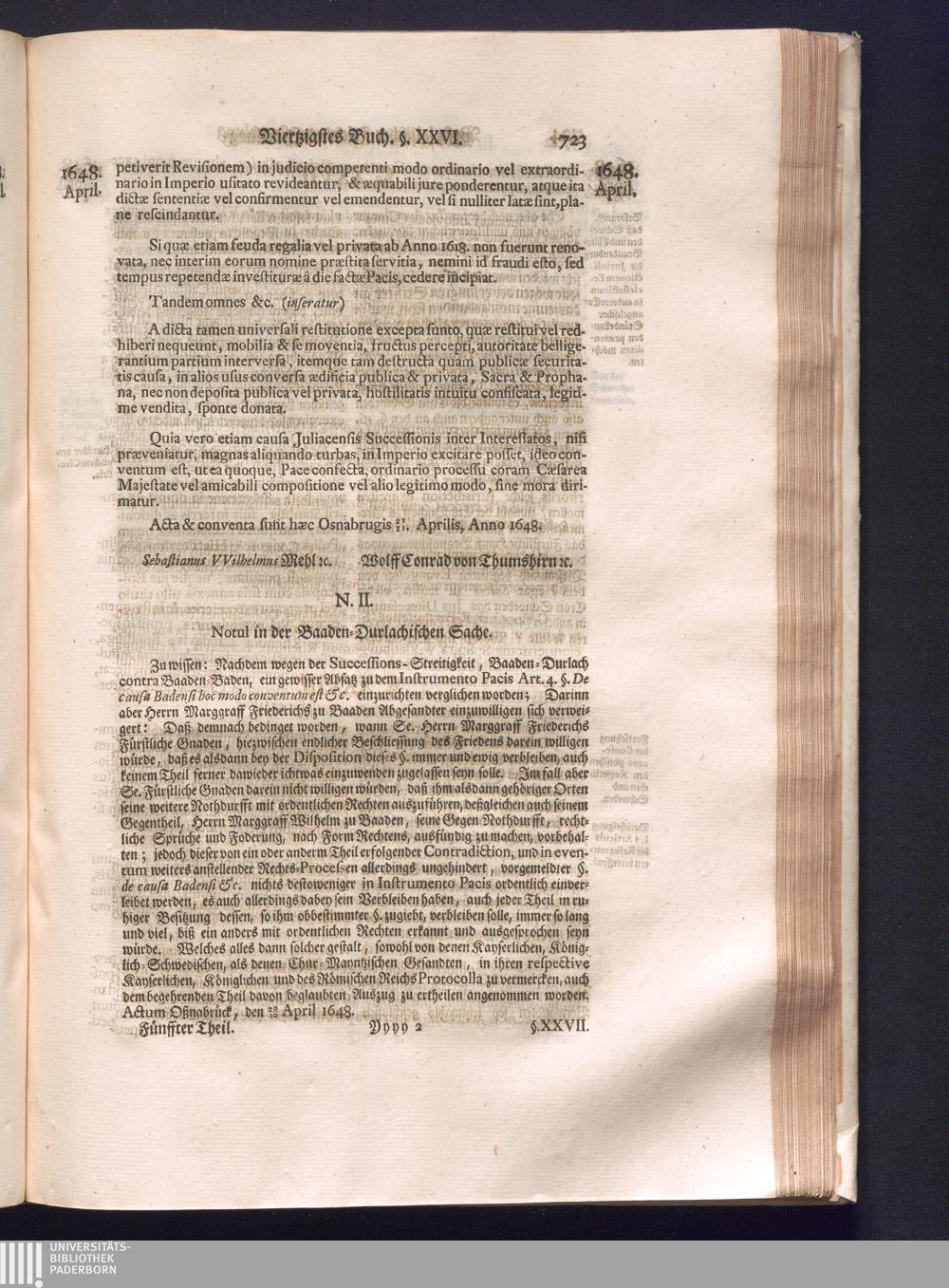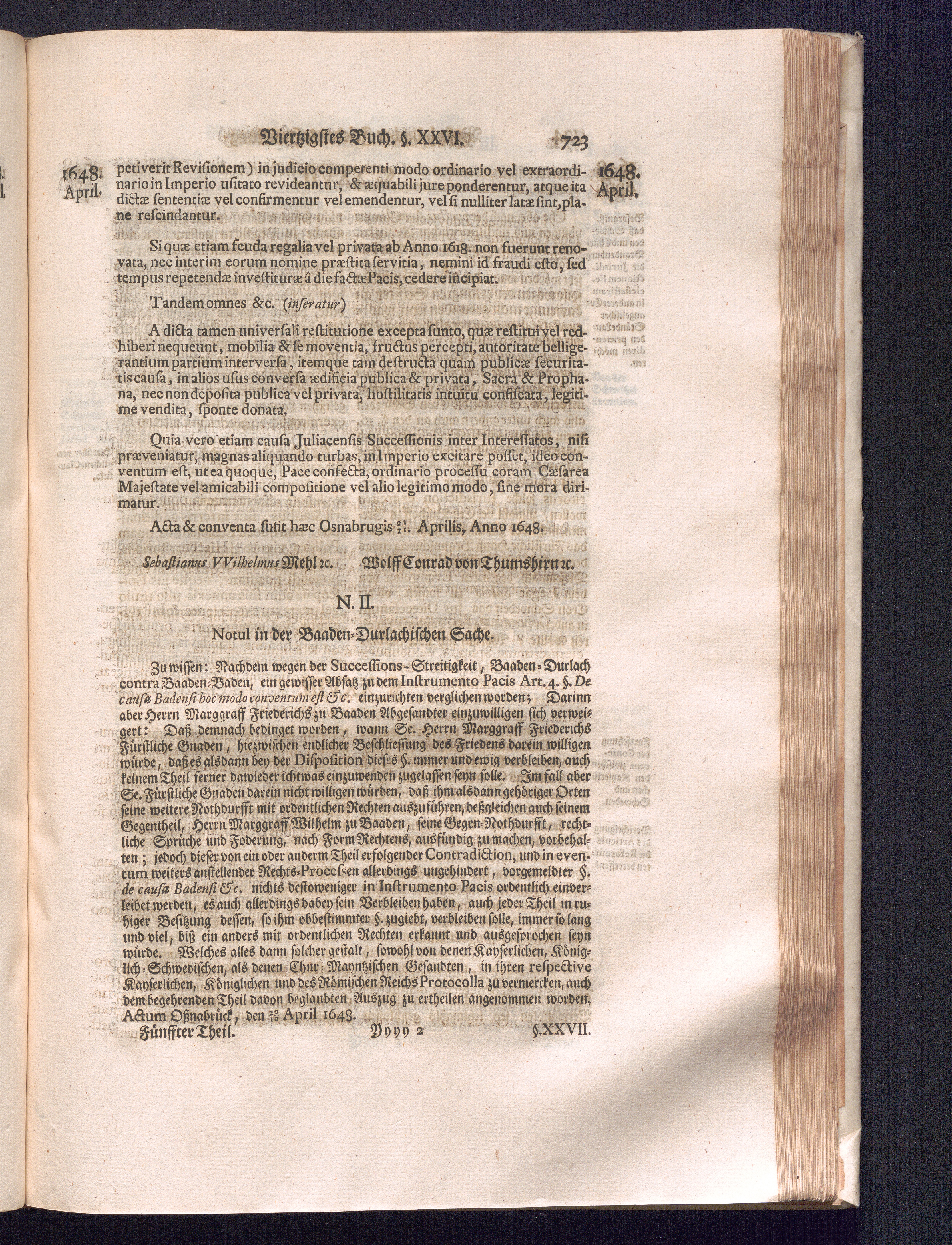 Fünffter Theil (1735) Worinnen enthalten, was vom Schluß des Jahrs 1647. biß in den Monath Junium des Jahrs 1648. zwischen Jhro Römisch-Kayserlichen Majestät, dann den Beyden Cronen Franckreich und Schweden, ingleichen des Heiligen Römischen Reichs Chur-Fürsten, Fürsten und Ständen, zu Oßnabrück und Münster gehandelt worden