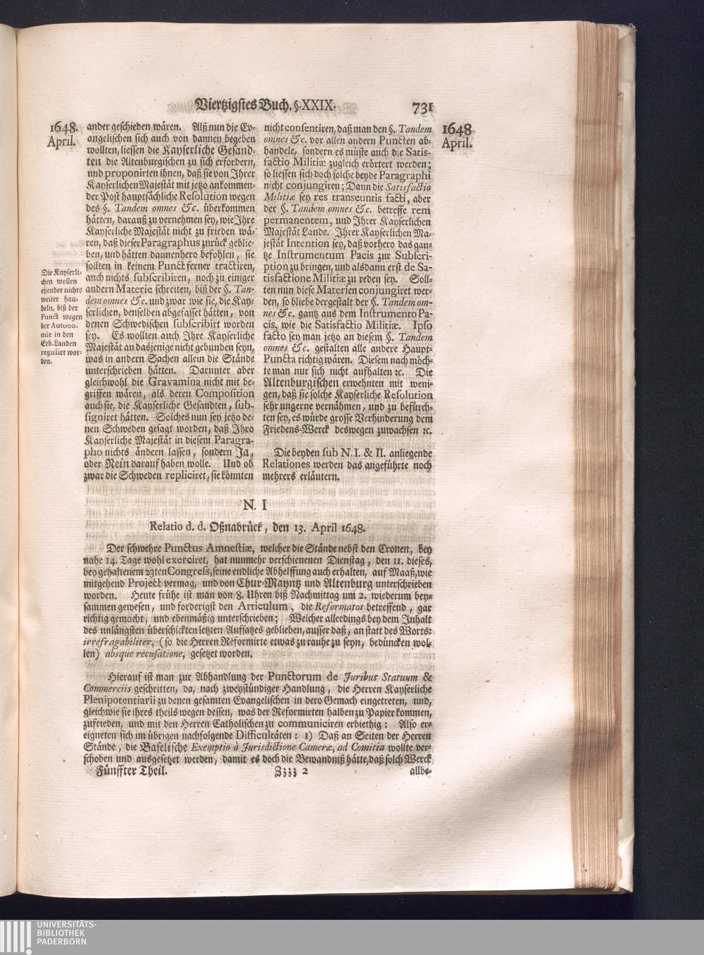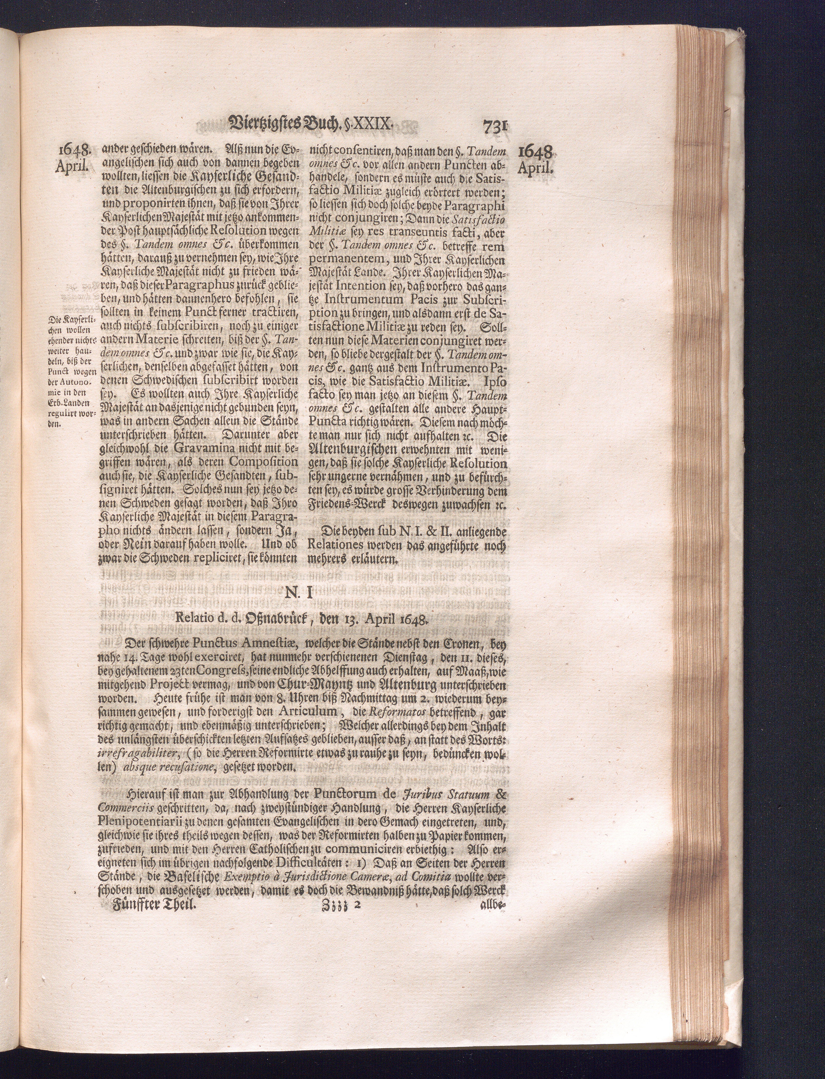 Fünffter Theil (1735) Worinnen enthalten, was vom Schluß des Jahrs 1647. biß in den Monath Junium des Jahrs 1648. zwischen Jhro Römisch-Kayserlichen Majestät, dann den Beyden Cronen Franckreich und Schweden, ingleichen des Heiligen Römischen Reichs Chur-Fürsten, Fürsten und Ständen, zu Oßnabrück und Münster gehandelt worden