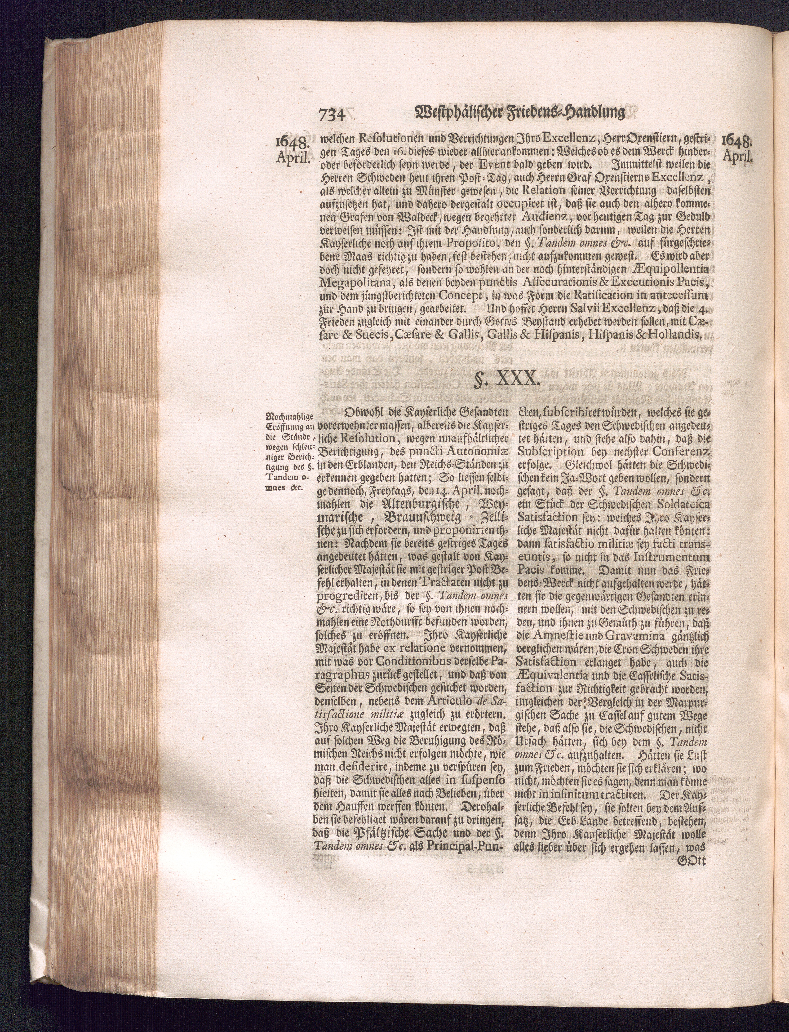 Fünffter Theil (1735) Worinnen enthalten, was vom Schluß des Jahrs 1647. biß in den Monath Junium des Jahrs 1648. zwischen Jhro Römisch-Kayserlichen Majestät, dann den Beyden Cronen Franckreich und Schweden, ingleichen des Heiligen Römischen Reichs Chur-Fürsten, Fürsten und Ständen, zu Oßnabrück und Münster gehandelt worden