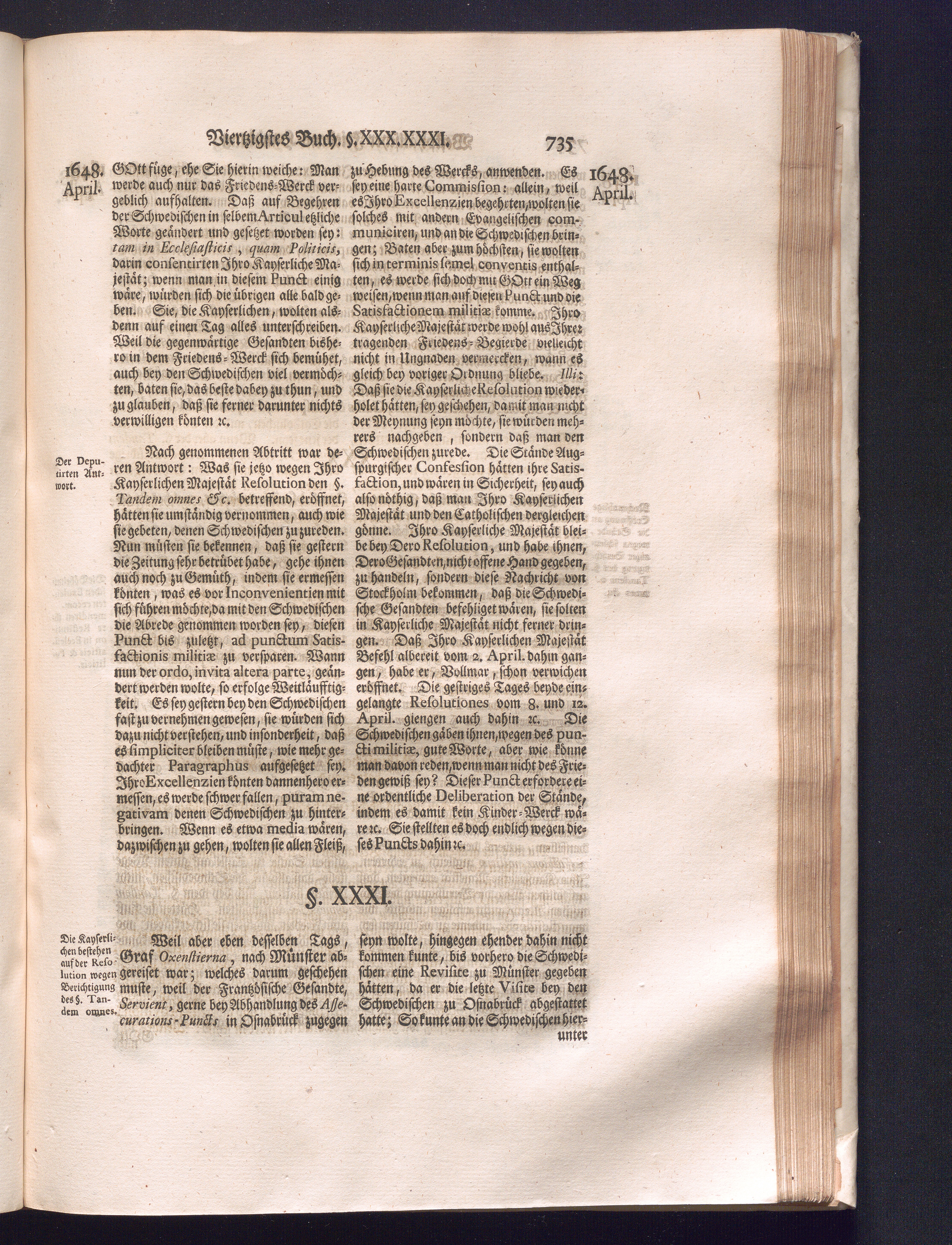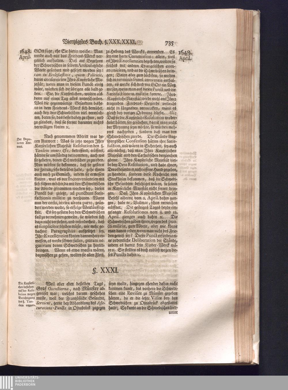 Fünffter Theil (1735) Worinnen enthalten, was vom Schluß des Jahrs 1647. biß in den Monath Junium des Jahrs 1648. zwischen Jhro Römisch-Kayserlichen Majestät, dann den Beyden Cronen Franckreich und Schweden, ingleichen des Heiligen Römischen Reichs Chur-Fürsten, Fürsten und Ständen, zu Oßnabrück und Münster gehandelt worden
