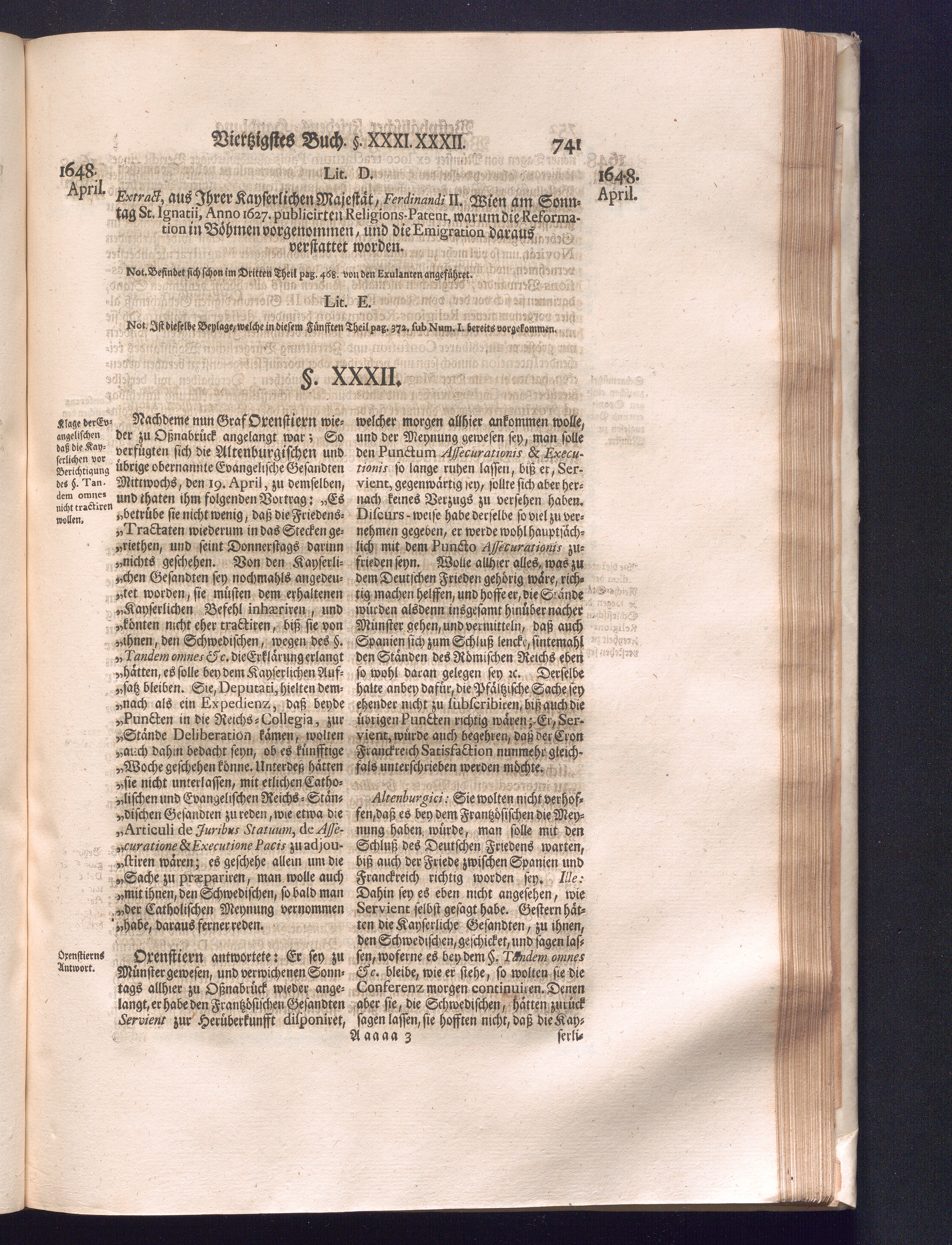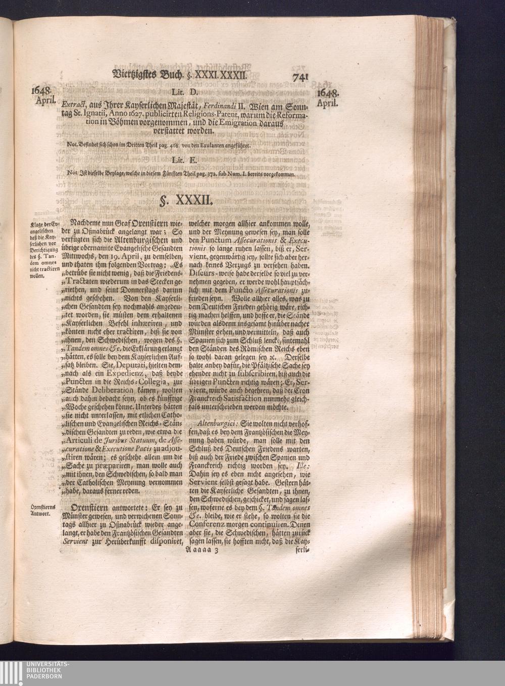 Fünffter Theil (1735) Worinnen enthalten, was vom Schluß des Jahrs 1647. biß in den Monath Junium des Jahrs 1648. zwischen Jhro Römisch-Kayserlichen Majestät, dann den Beyden Cronen Franckreich und Schweden, ingleichen des Heiligen Römischen Reichs Chur-Fürsten, Fürsten und Ständen, zu Oßnabrück und Münster gehandelt worden