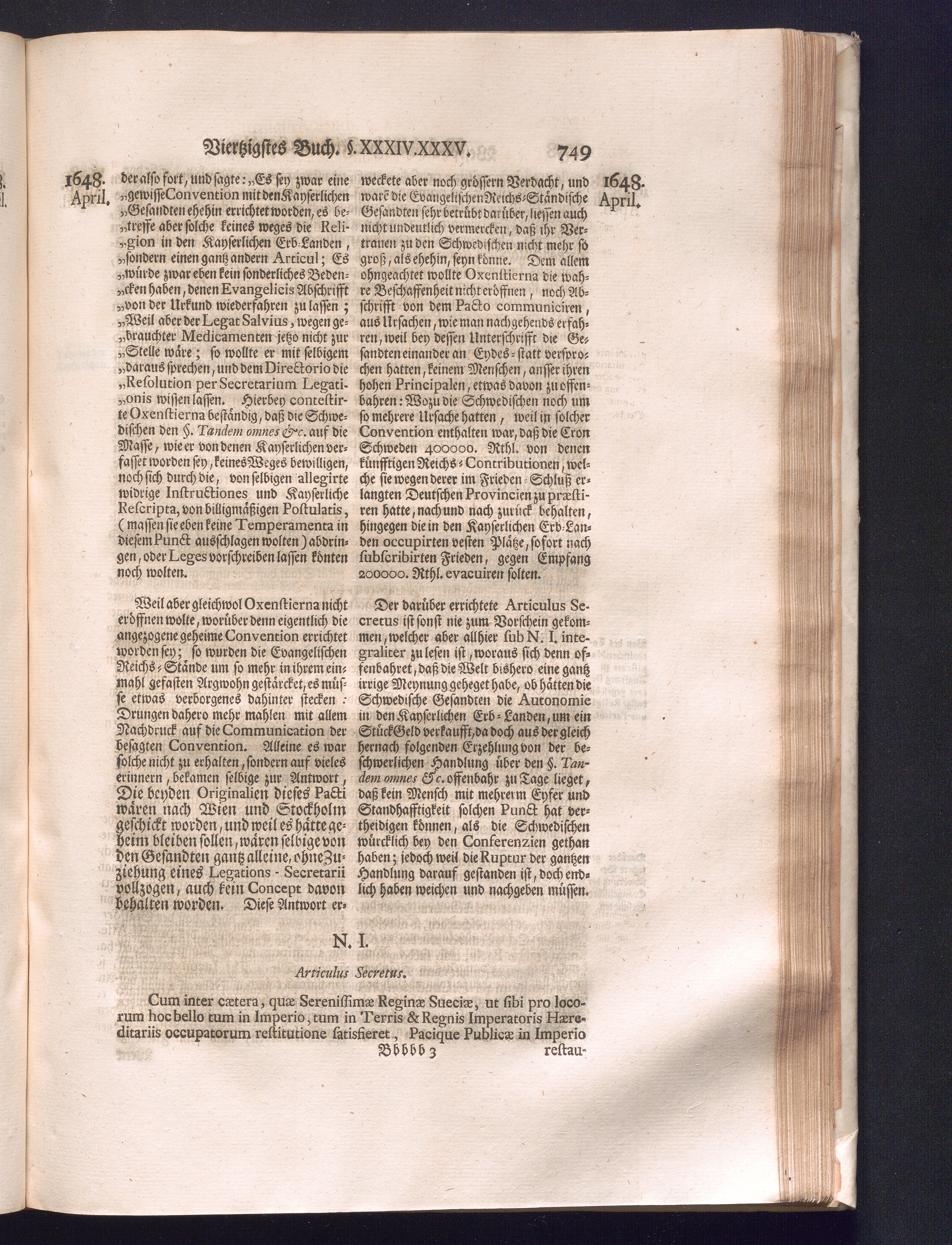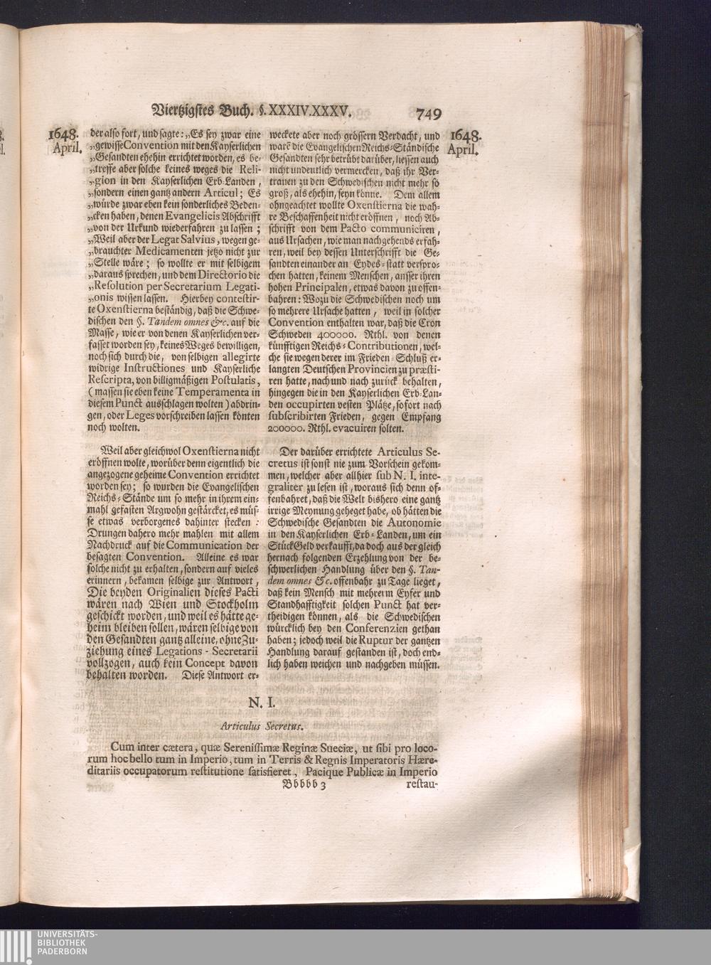 Fünffter Theil (1735) Worinnen enthalten, was vom Schluß des Jahrs 1647. biß in den Monath Junium des Jahrs 1648. zwischen Jhro Römisch-Kayserlichen Majestät, dann den Beyden Cronen Franckreich und Schweden, ingleichen des Heiligen Römischen Reichs Chur-Fürsten, Fürsten und Ständen, zu Oßnabrück und Münster gehandelt worden