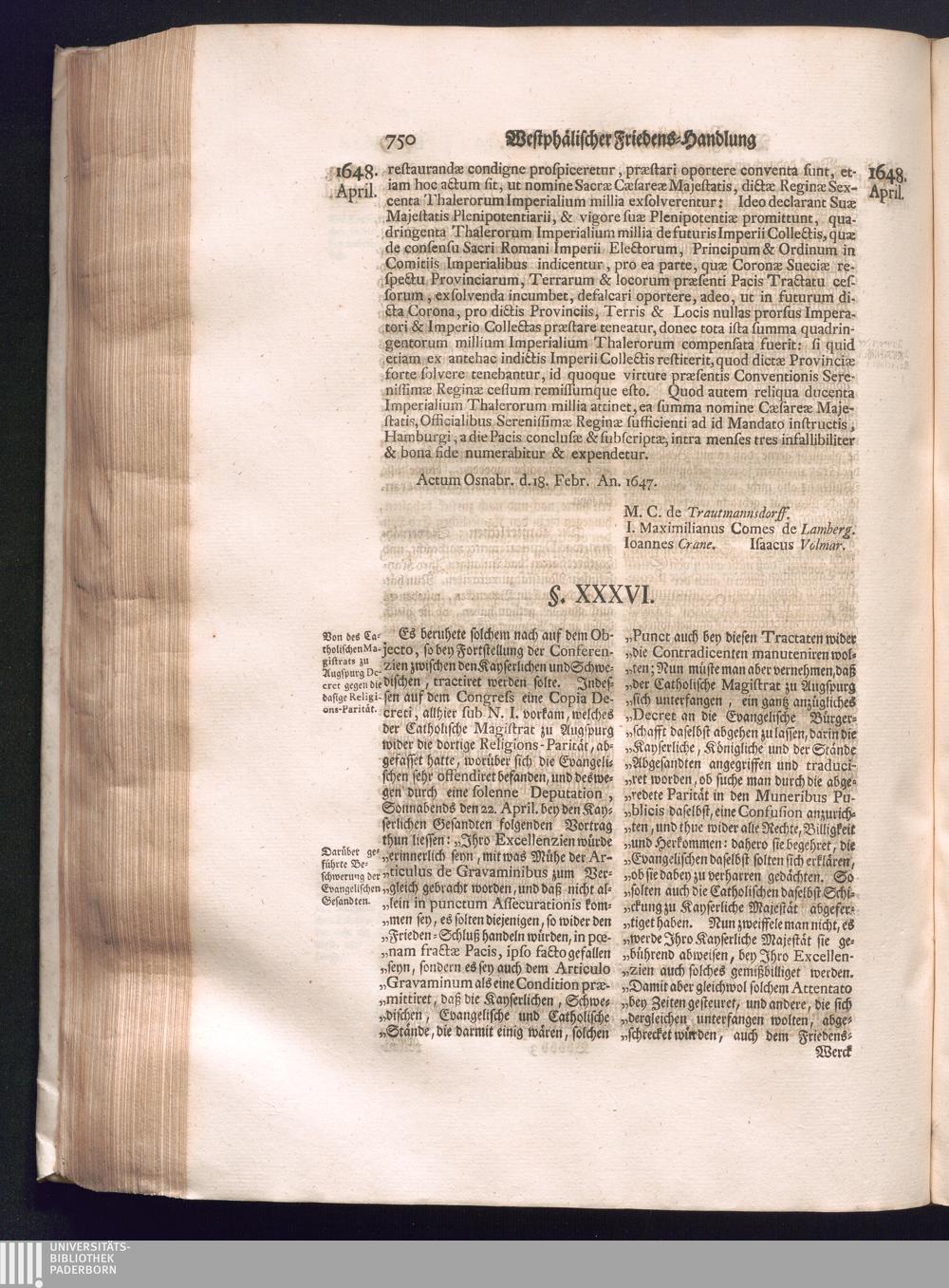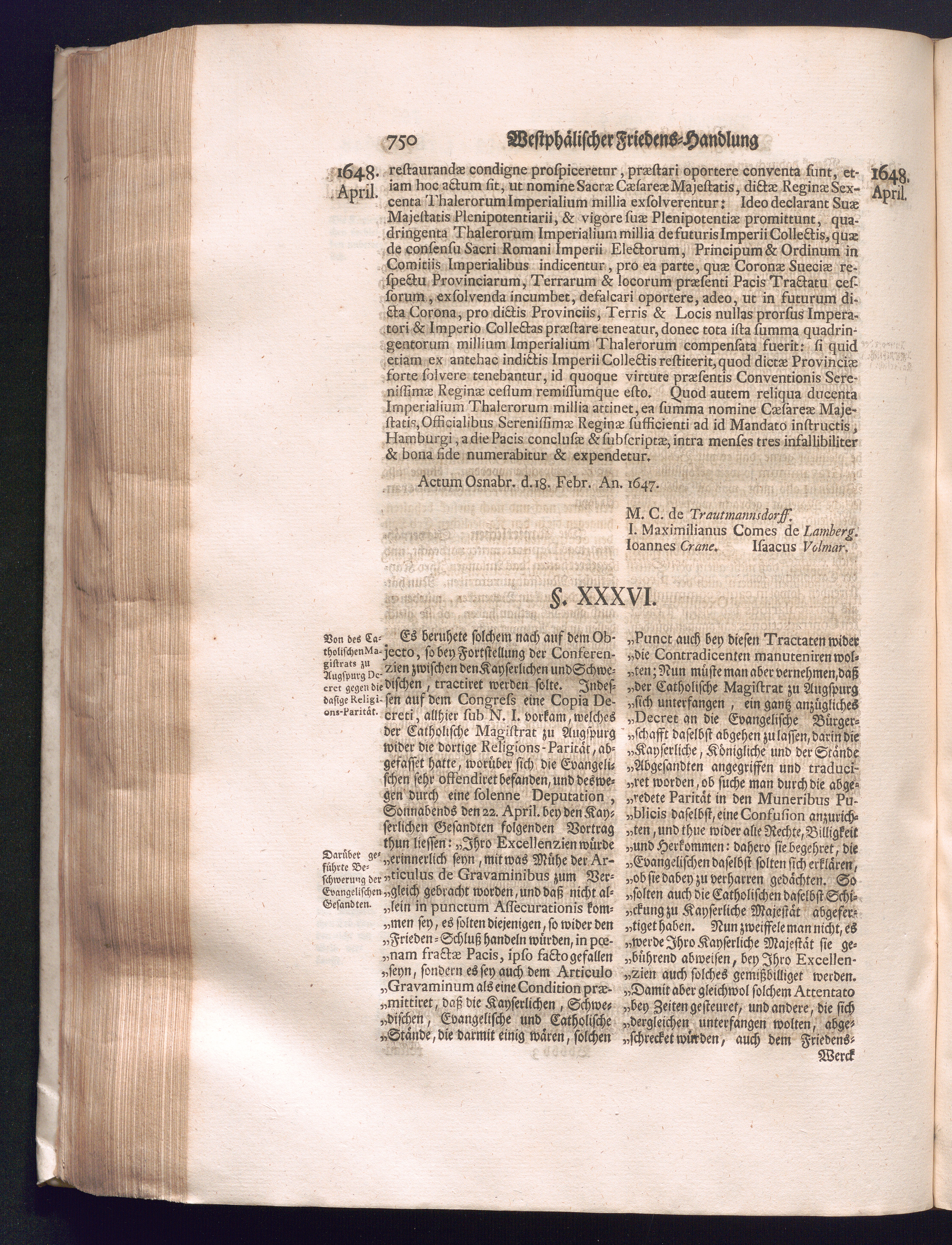 Fünffter Theil (1735) Worinnen enthalten, was vom Schluß des Jahrs 1647. biß in den Monath Junium des Jahrs 1648. zwischen Jhro Römisch-Kayserlichen Majestät, dann den Beyden Cronen Franckreich und Schweden, ingleichen des Heiligen Römischen Reichs Chur-Fürsten, Fürsten und Ständen, zu Oßnabrück und Münster gehandelt worden