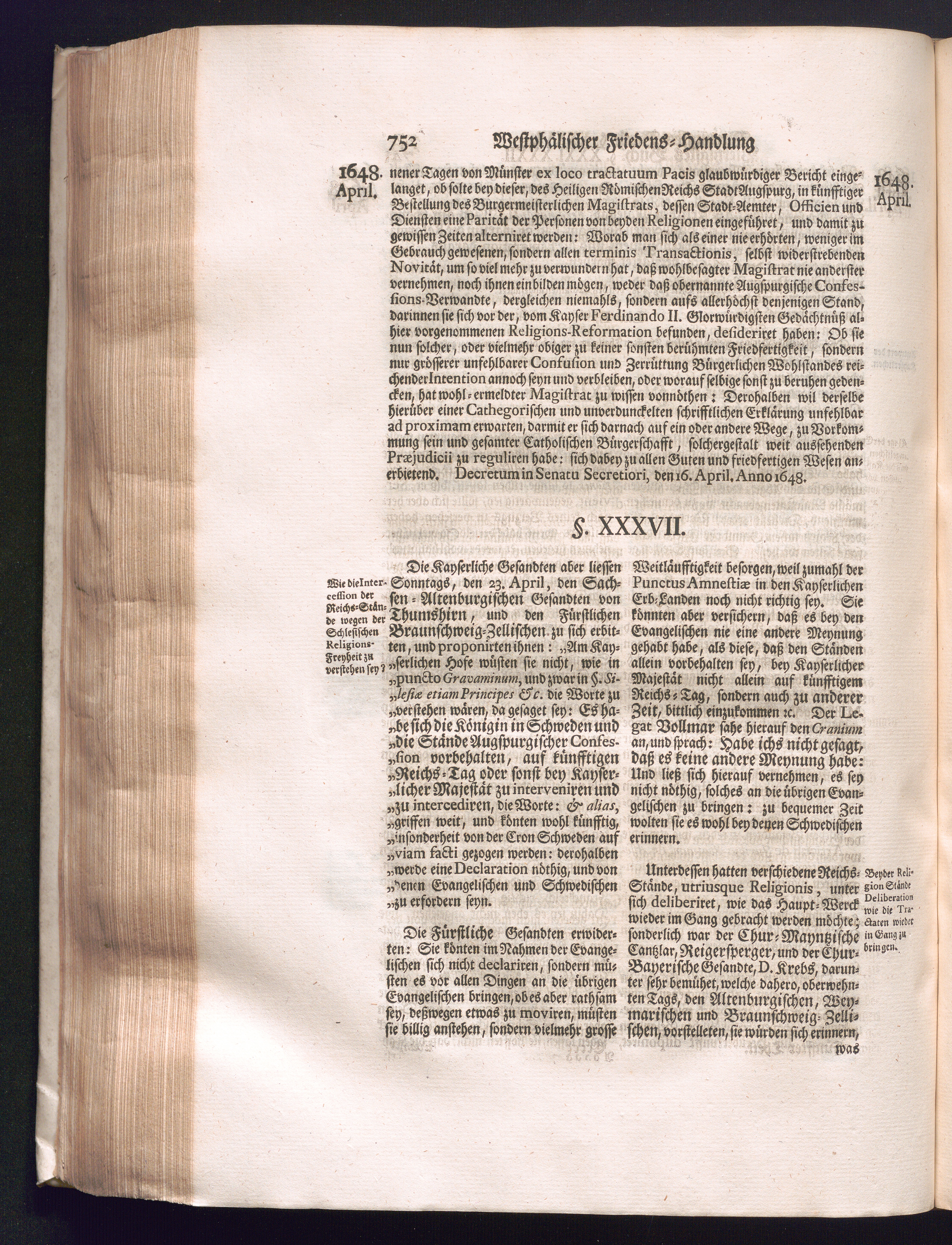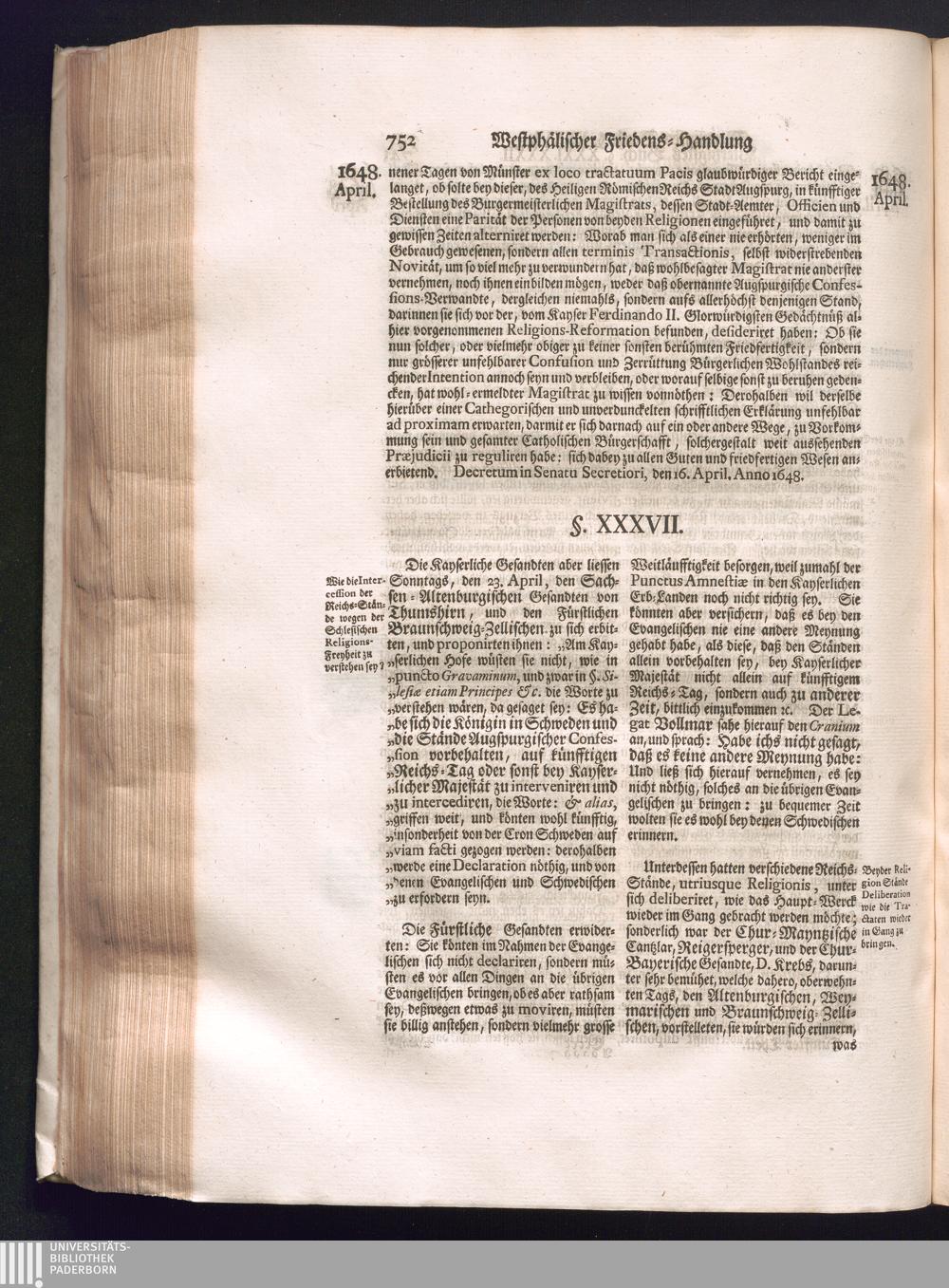 Fünffter Theil (1735) Worinnen enthalten, was vom Schluß des Jahrs 1647. biß in den Monath Junium des Jahrs 1648. zwischen Jhro Römisch-Kayserlichen Majestät, dann den Beyden Cronen Franckreich und Schweden, ingleichen des Heiligen Römischen Reichs Chur-Fürsten, Fürsten und Ständen, zu Oßnabrück und Münster gehandelt worden