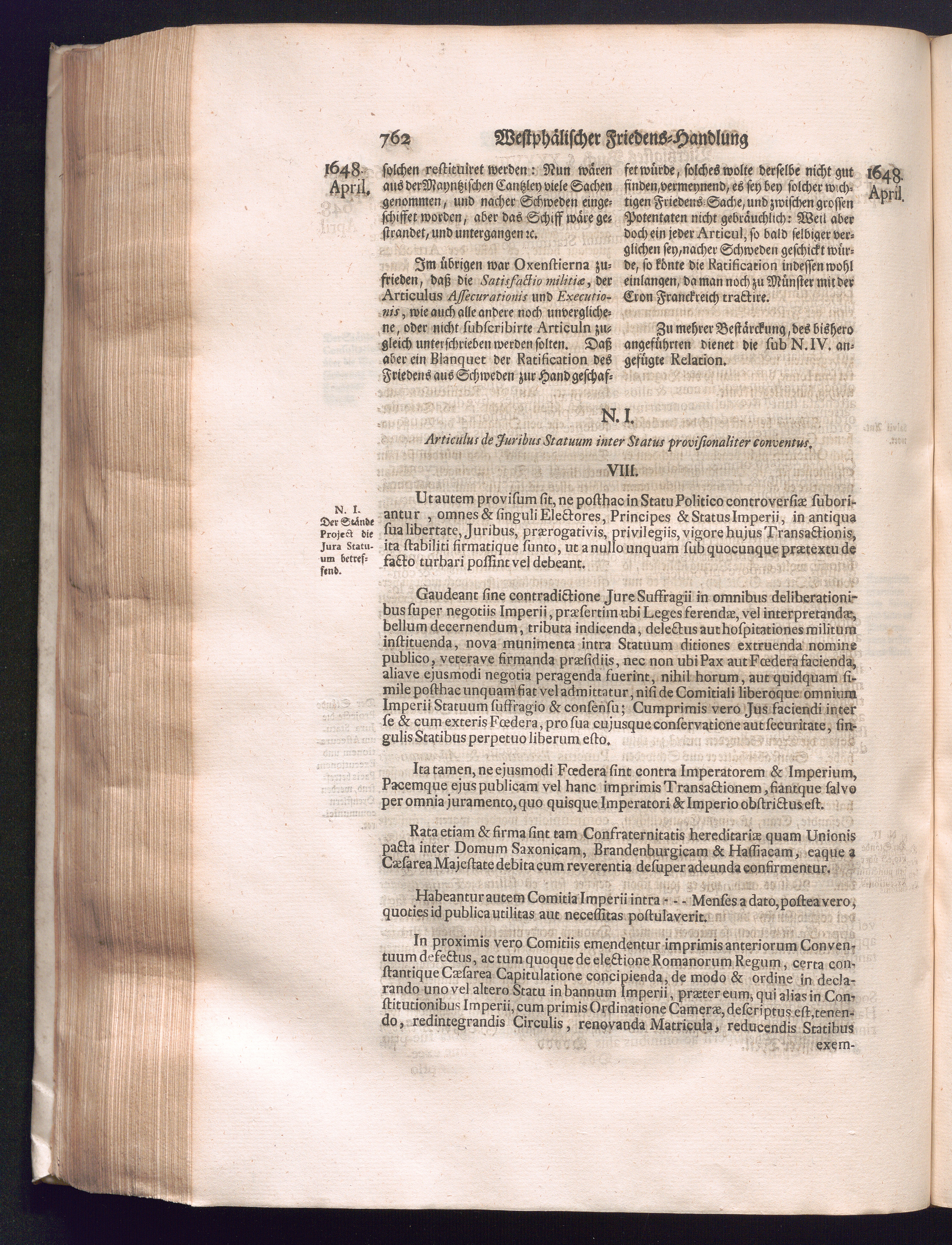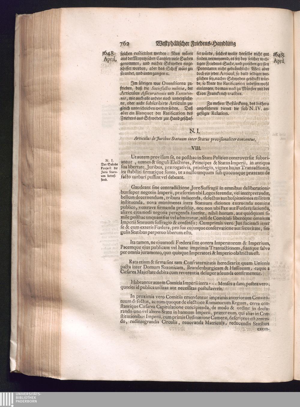 Fünffter Theil (1735) Worinnen enthalten, was vom Schluß des Jahrs 1647. biß in den Monath Junium des Jahrs 1648. zwischen Jhro Römisch-Kayserlichen Majestät, dann den Beyden Cronen Franckreich und Schweden, ingleichen des Heiligen Römischen Reichs Chur-Fürsten, Fürsten und Ständen, zu Oßnabrück und Münster gehandelt worden