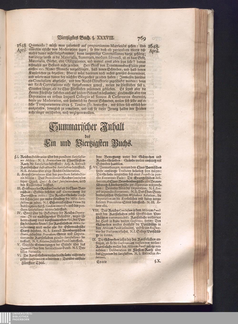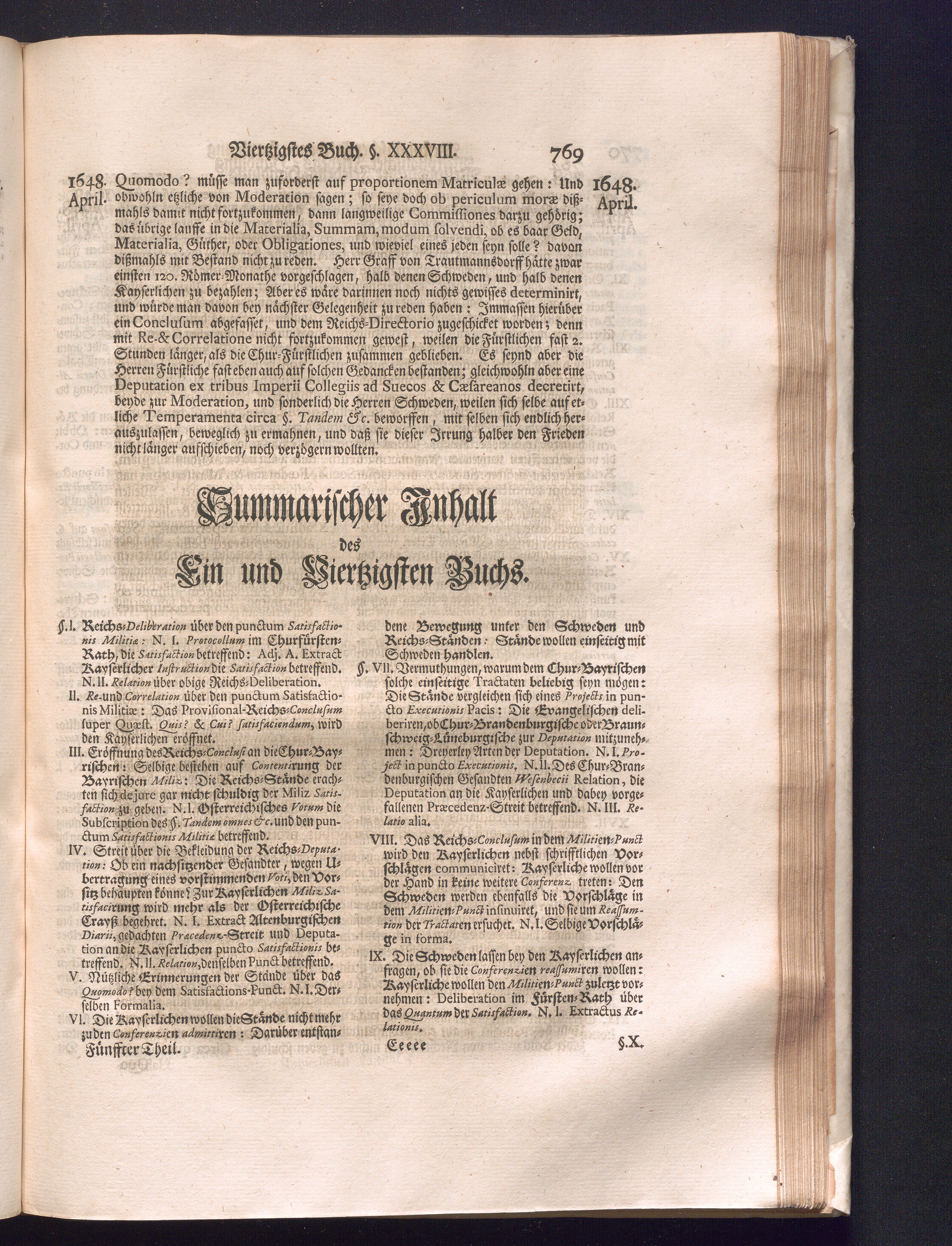 Fünffter Theil (1735) Worinnen enthalten, was vom Schluß des Jahrs 1647. biß in den Monath Junium des Jahrs 1648. zwischen Jhro Römisch-Kayserlichen Majestät, dann den Beyden Cronen Franckreich und Schweden, ingleichen des Heiligen Römischen Reichs Chur-Fürsten, Fürsten und Ständen, zu Oßnabrück und Münster gehandelt worden