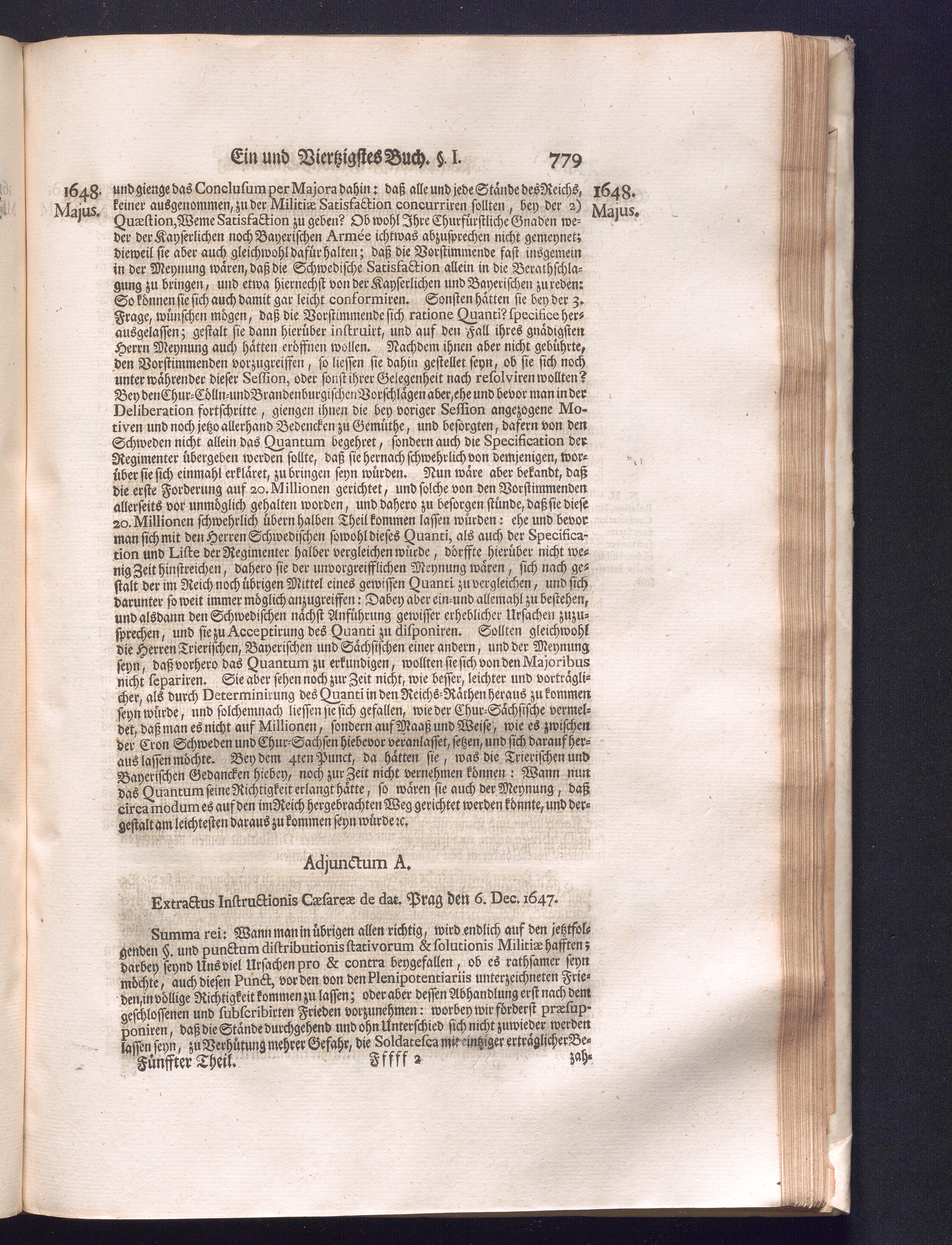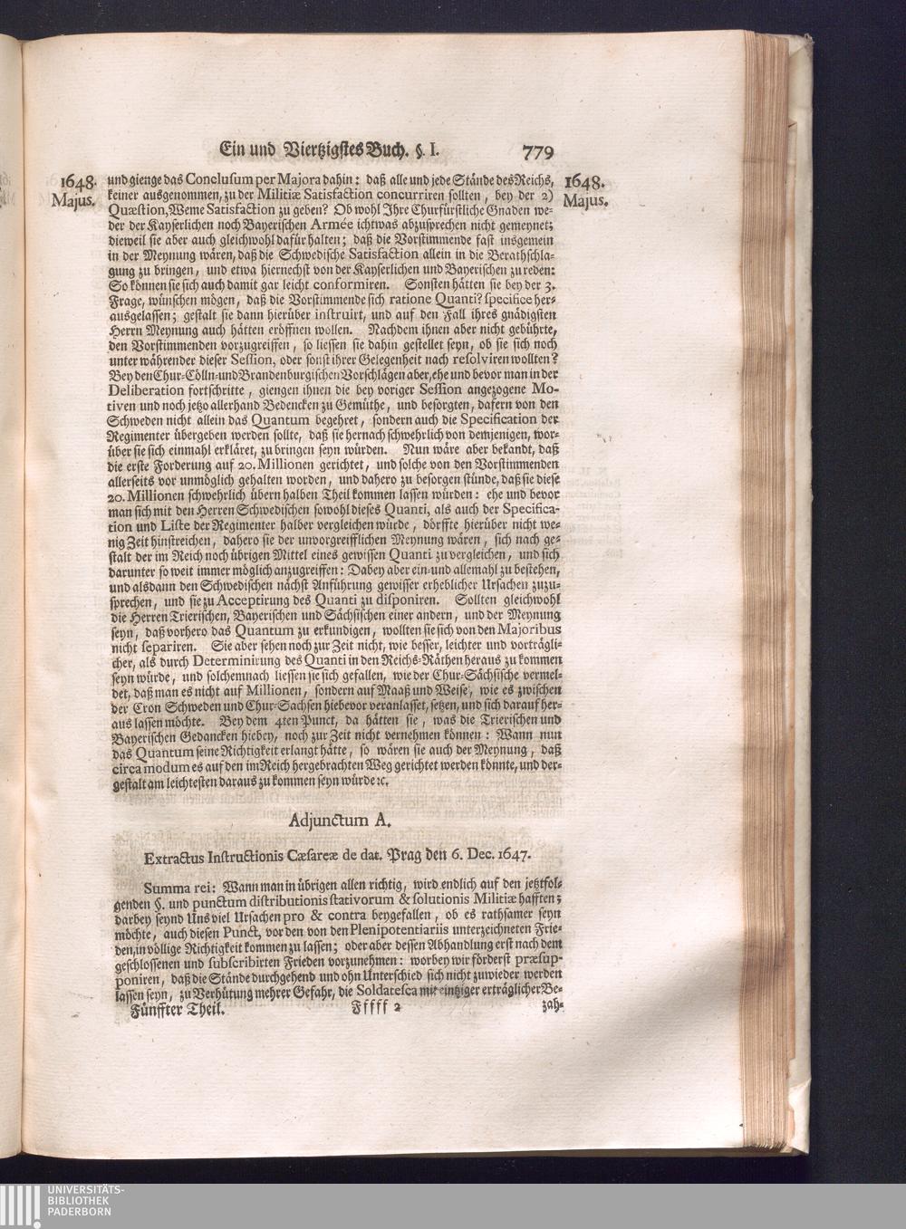 Fünffter Theil (1735) Worinnen enthalten, was vom Schluß des Jahrs 1647. biß in den Monath Junium des Jahrs 1648. zwischen Jhro Römisch-Kayserlichen Majestät, dann den Beyden Cronen Franckreich und Schweden, ingleichen des Heiligen Römischen Reichs Chur-Fürsten, Fürsten und Ständen, zu Oßnabrück und Münster gehandelt worden