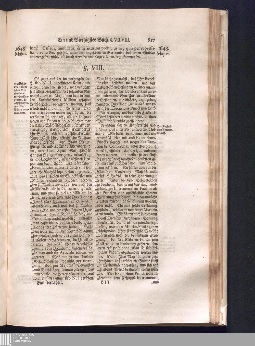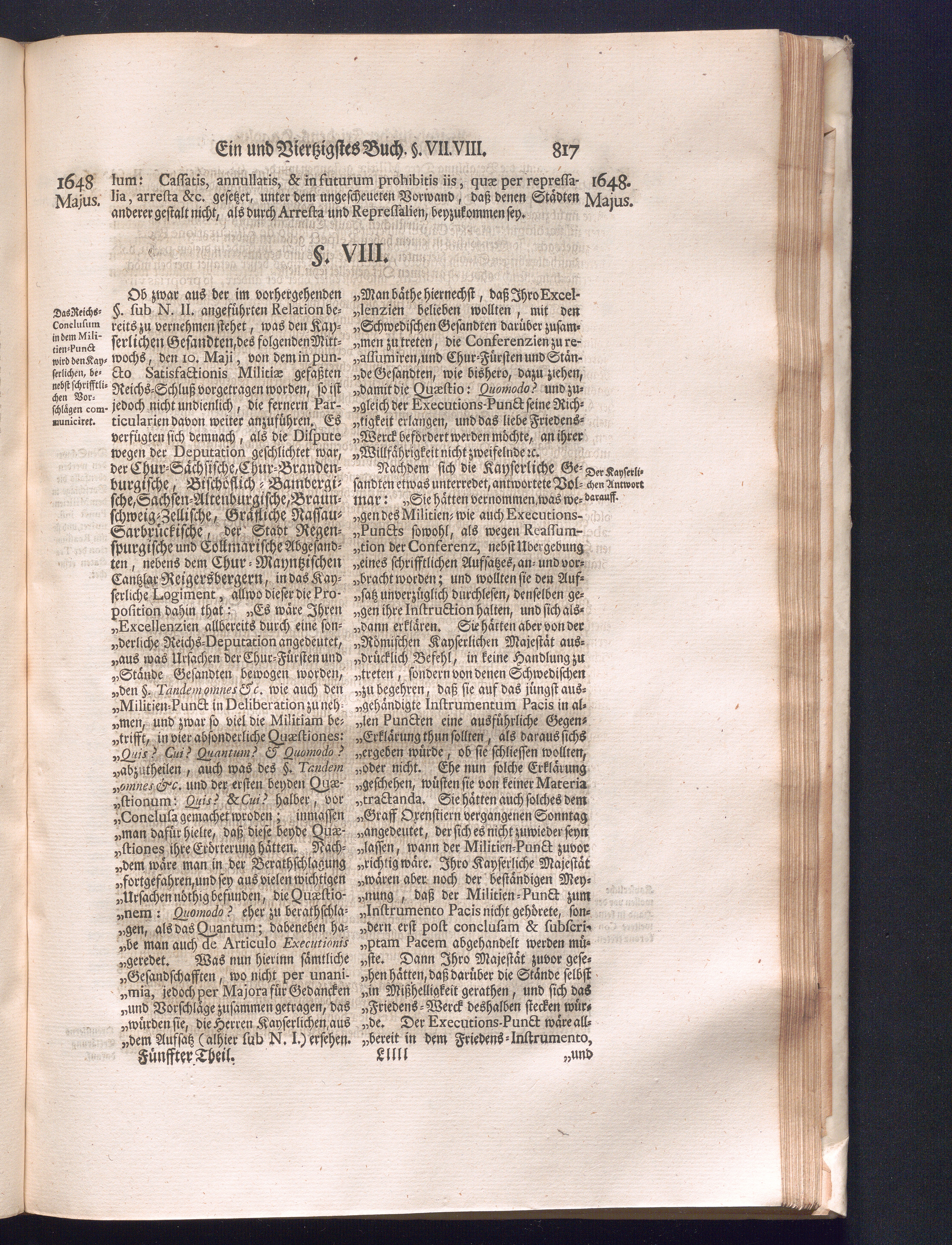 Fünffter Theil (1735) Worinnen enthalten, was vom Schluß des Jahrs 1647. biß in den Monath Junium des Jahrs 1648. zwischen Jhro Römisch-Kayserlichen Majestät, dann den Beyden Cronen Franckreich und Schweden, ingleichen des Heiligen Römischen Reichs Chur-Fürsten, Fürsten und Ständen, zu Oßnabrück und Münster gehandelt worden