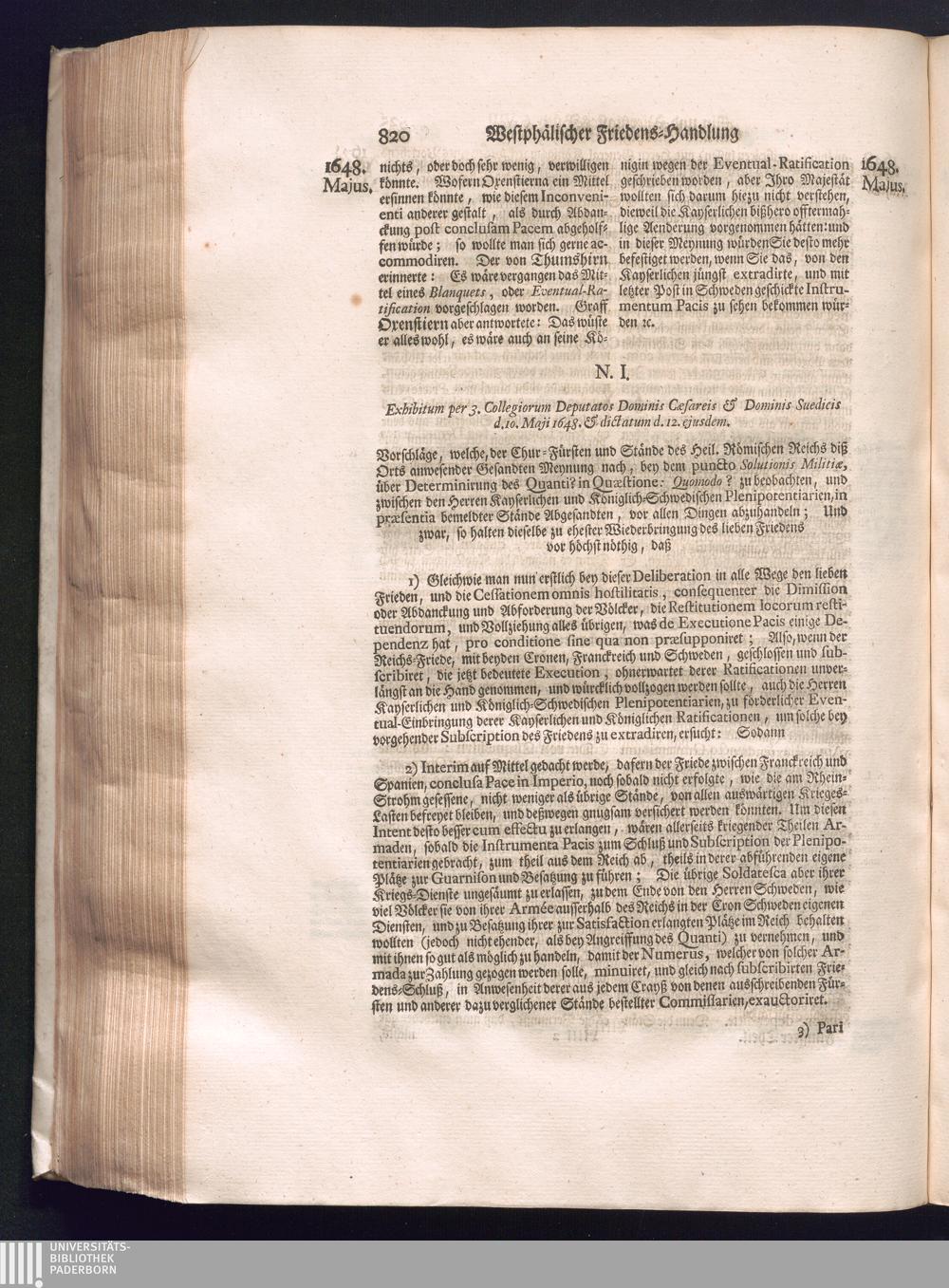 Fünffter Theil (1735) Worinnen enthalten, was vom Schluß des Jahrs 1647. biß in den Monath Junium des Jahrs 1648. zwischen Jhro Römisch-Kayserlichen Majestät, dann den Beyden Cronen Franckreich und Schweden, ingleichen des Heiligen Römischen Reichs Chur-Fürsten, Fürsten und Ständen, zu Oßnabrück und Münster gehandelt worden
