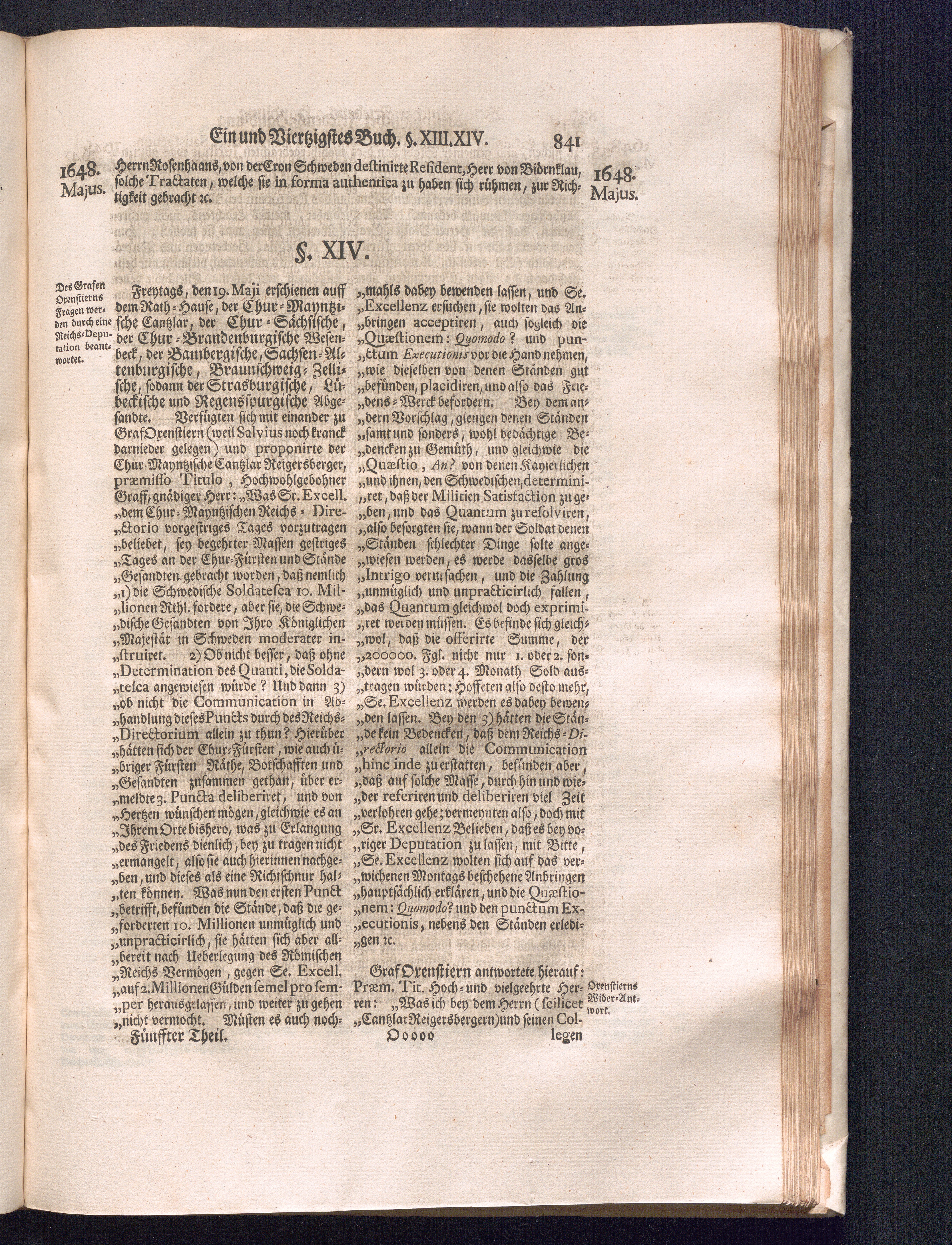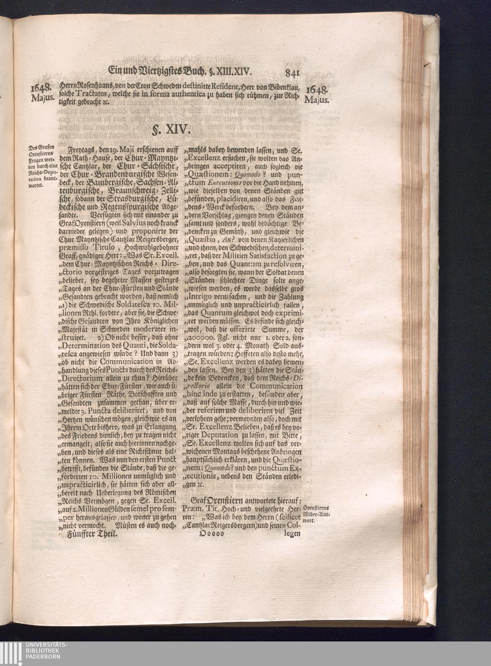 Fünffter Theil (1735) Worinnen enthalten, was vom Schluß des Jahrs 1647. biß in den Monath Junium des Jahrs 1648. zwischen Jhro Römisch-Kayserlichen Majestät, dann den Beyden Cronen Franckreich und Schweden, ingleichen des Heiligen Römischen Reichs Chur-Fürsten, Fürsten und Ständen, zu Oßnabrück und Münster gehandelt worden