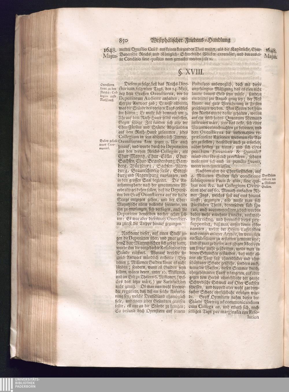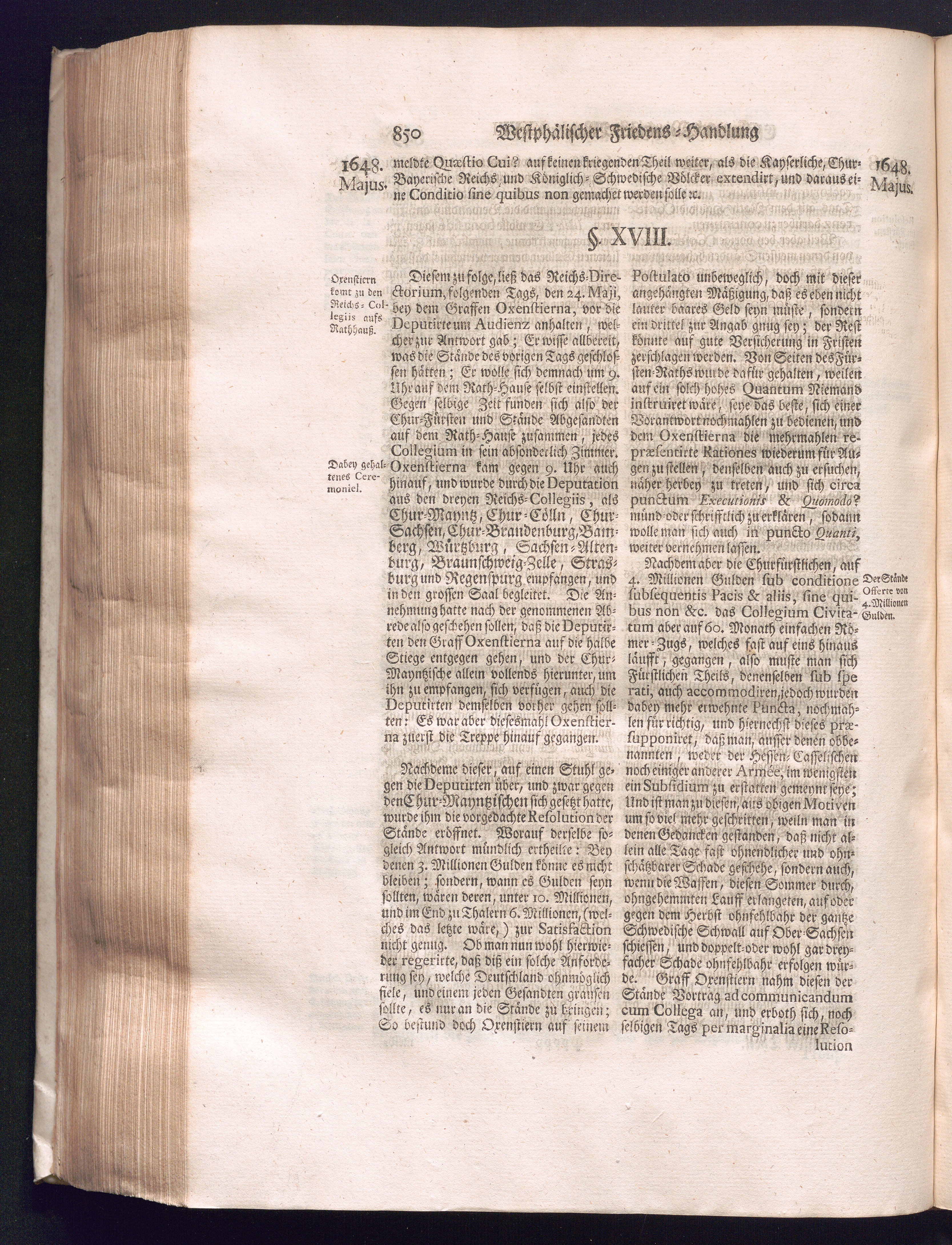Fünffter Theil (1735) Worinnen enthalten, was vom Schluß des Jahrs 1647. biß in den Monath Junium des Jahrs 1648. zwischen Jhro Römisch-Kayserlichen Majestät, dann den Beyden Cronen Franckreich und Schweden, ingleichen des Heiligen Römischen Reichs Chur-Fürsten, Fürsten und Ständen, zu Oßnabrück und Münster gehandelt worden