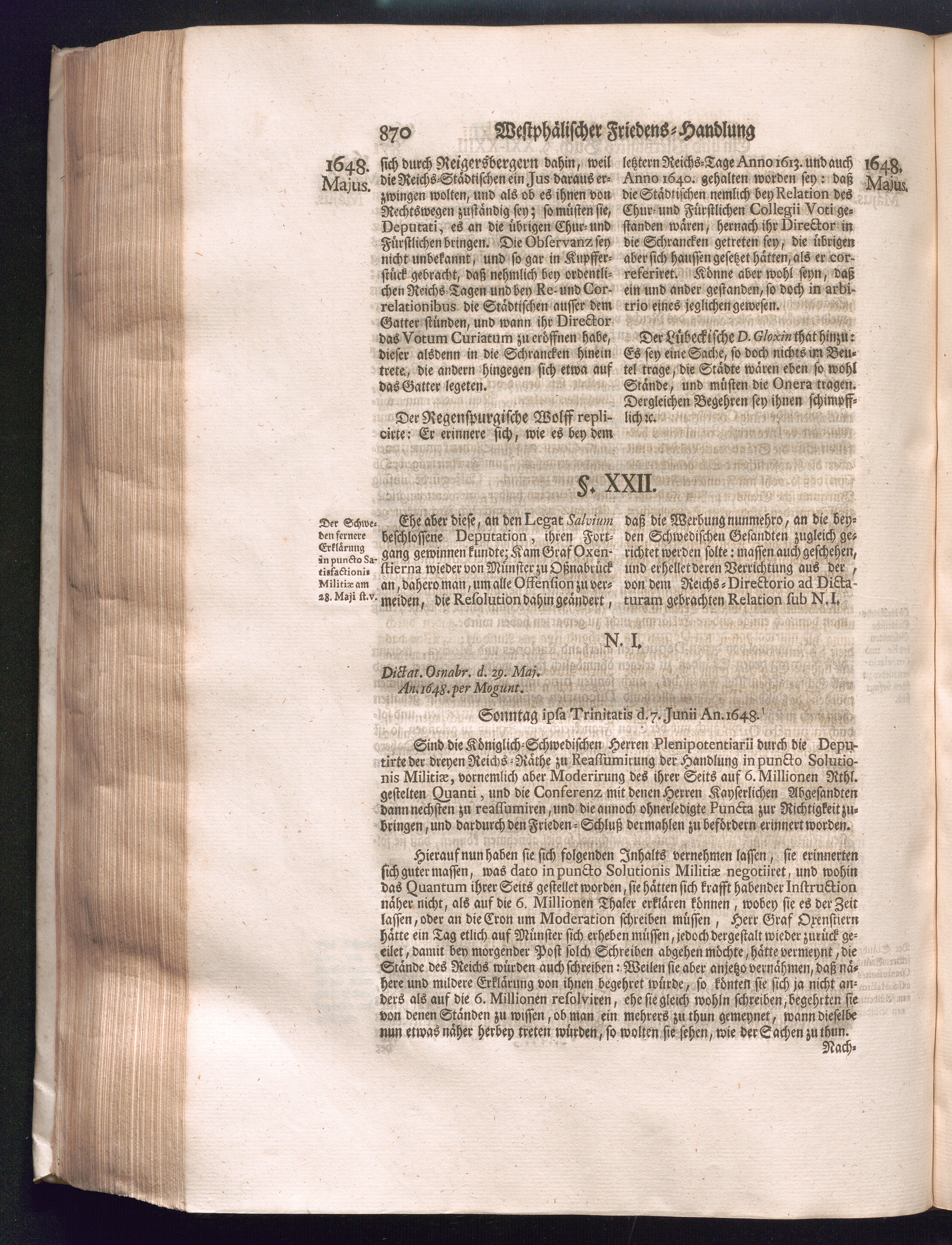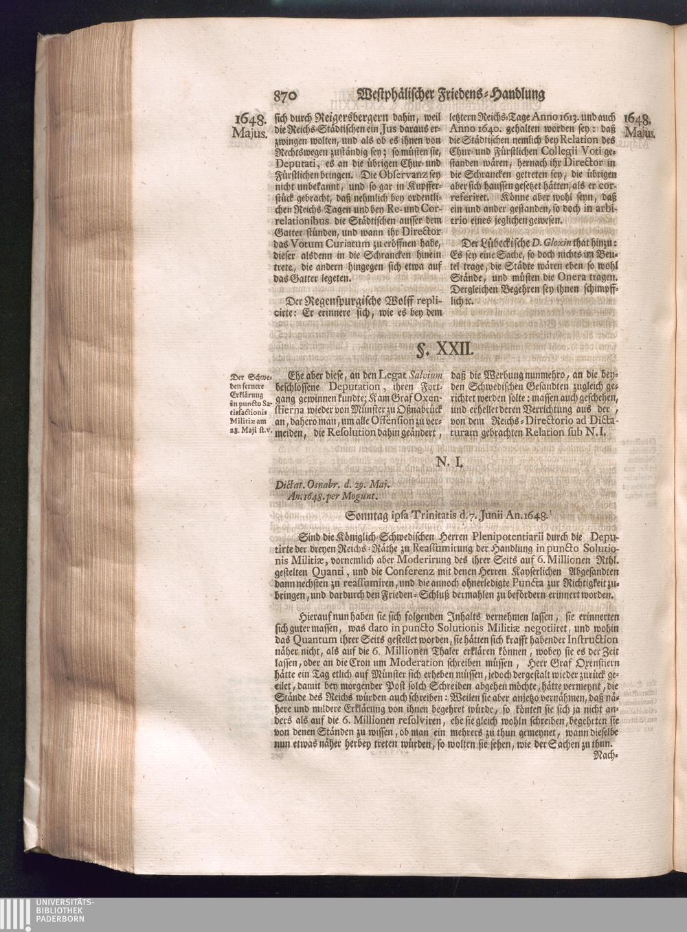 Fünffter Theil (1735) Worinnen enthalten, was vom Schluß des Jahrs 1647. biß in den Monath Junium des Jahrs 1648. zwischen Jhro Römisch-Kayserlichen Majestät, dann den Beyden Cronen Franckreich und Schweden, ingleichen des Heiligen Römischen Reichs Chur-Fürsten, Fürsten und Ständen, zu Oßnabrück und Münster gehandelt worden