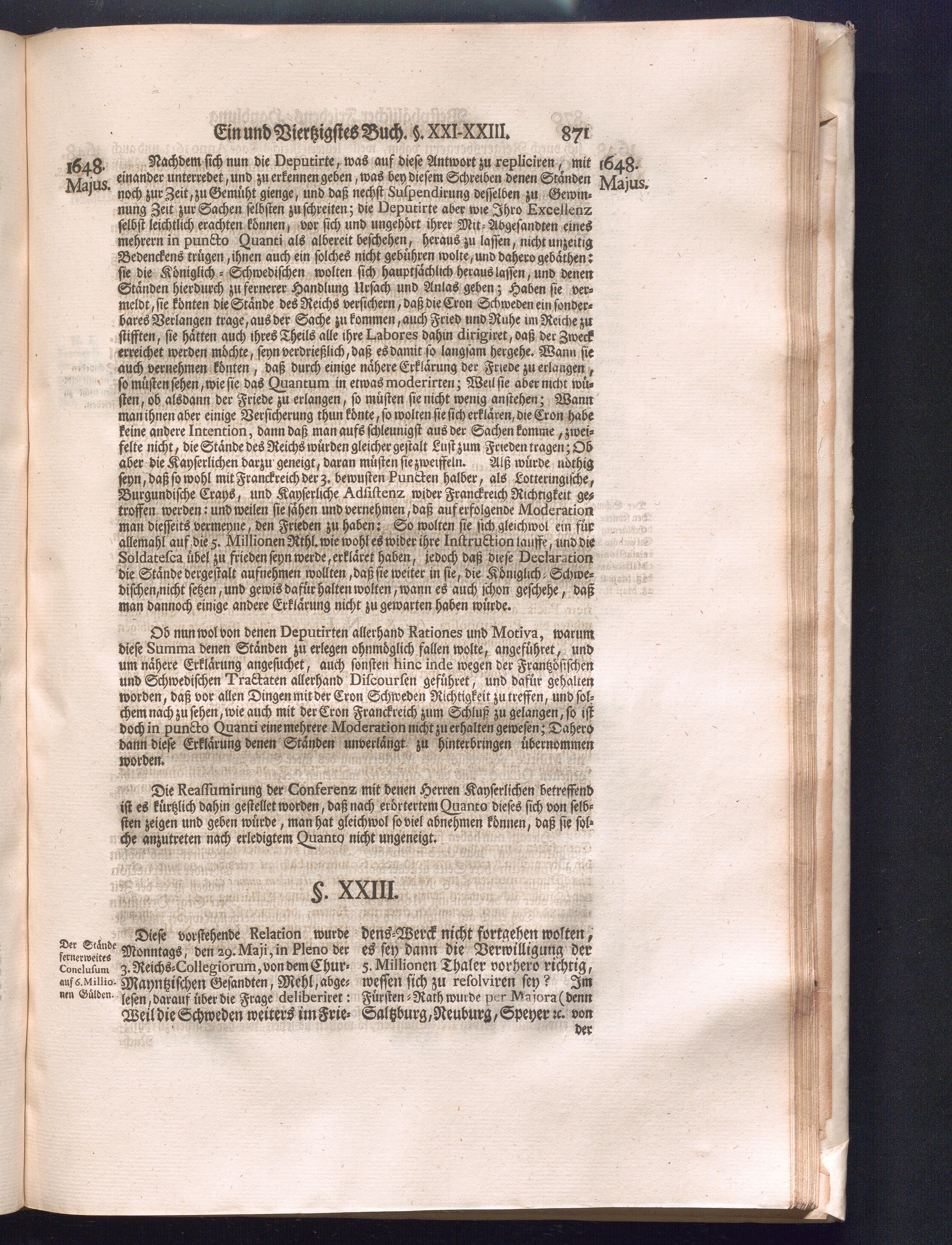 Fünffter Theil (1735) Worinnen enthalten, was vom Schluß des Jahrs 1647. biß in den Monath Junium des Jahrs 1648. zwischen Jhro Römisch-Kayserlichen Majestät, dann den Beyden Cronen Franckreich und Schweden, ingleichen des Heiligen Römischen Reichs Chur-Fürsten, Fürsten und Ständen, zu Oßnabrück und Münster gehandelt worden