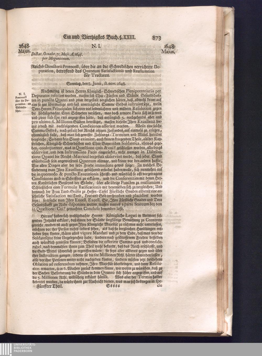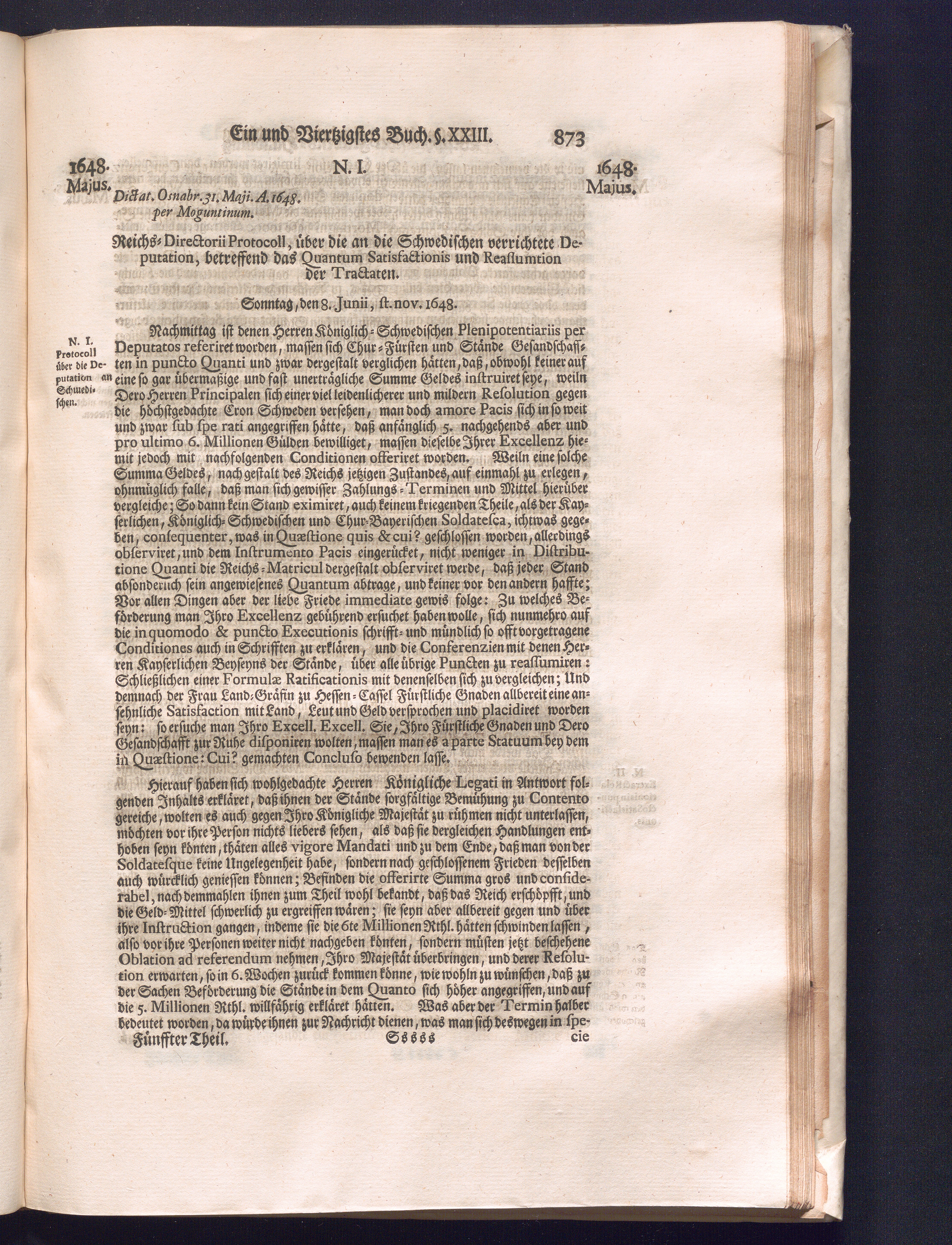 Fünffter Theil (1735) Worinnen enthalten, was vom Schluß des Jahrs 1647. biß in den Monath Junium des Jahrs 1648. zwischen Jhro Römisch-Kayserlichen Majestät, dann den Beyden Cronen Franckreich und Schweden, ingleichen des Heiligen Römischen Reichs Chur-Fürsten, Fürsten und Ständen, zu Oßnabrück und Münster gehandelt worden