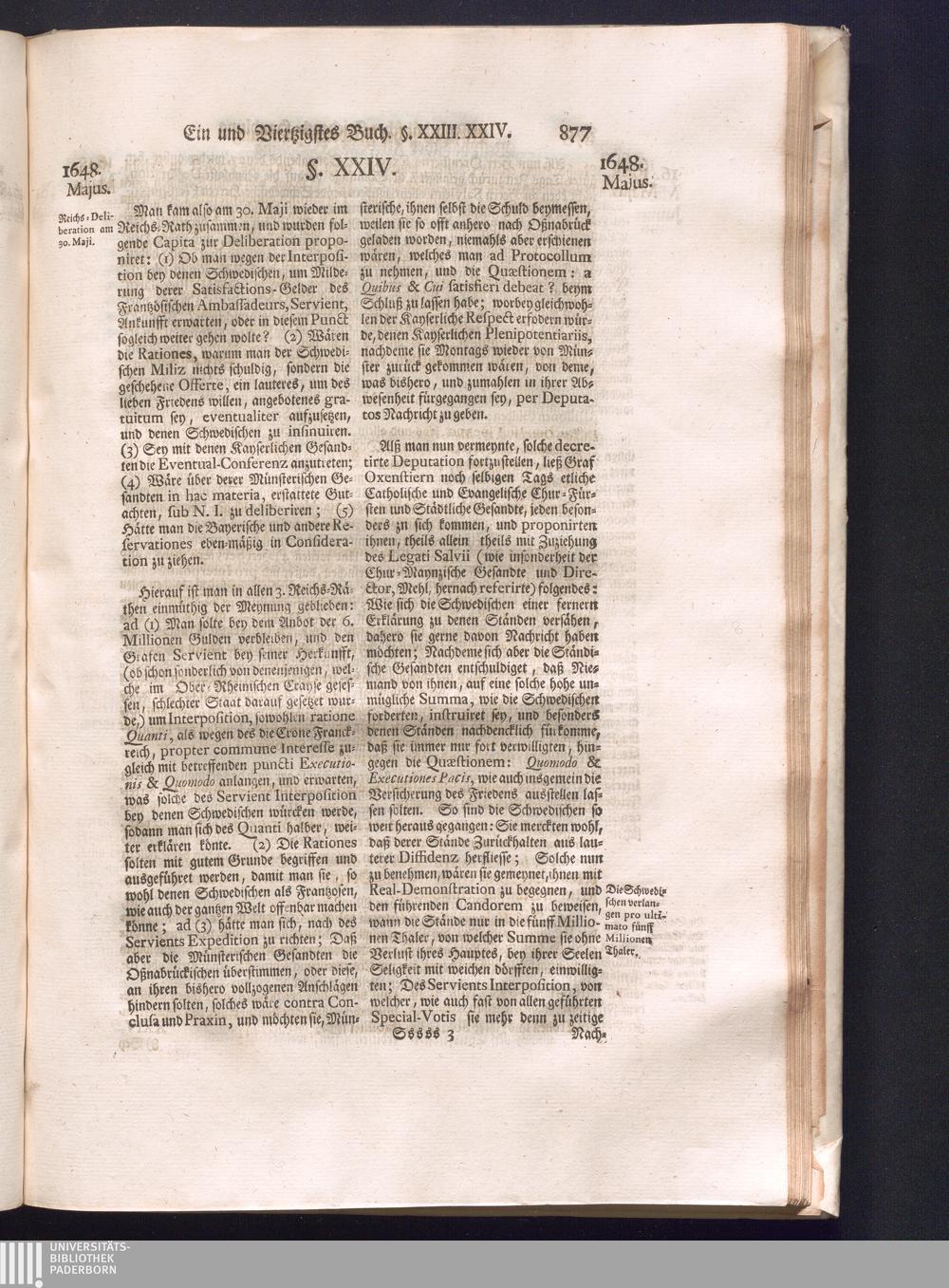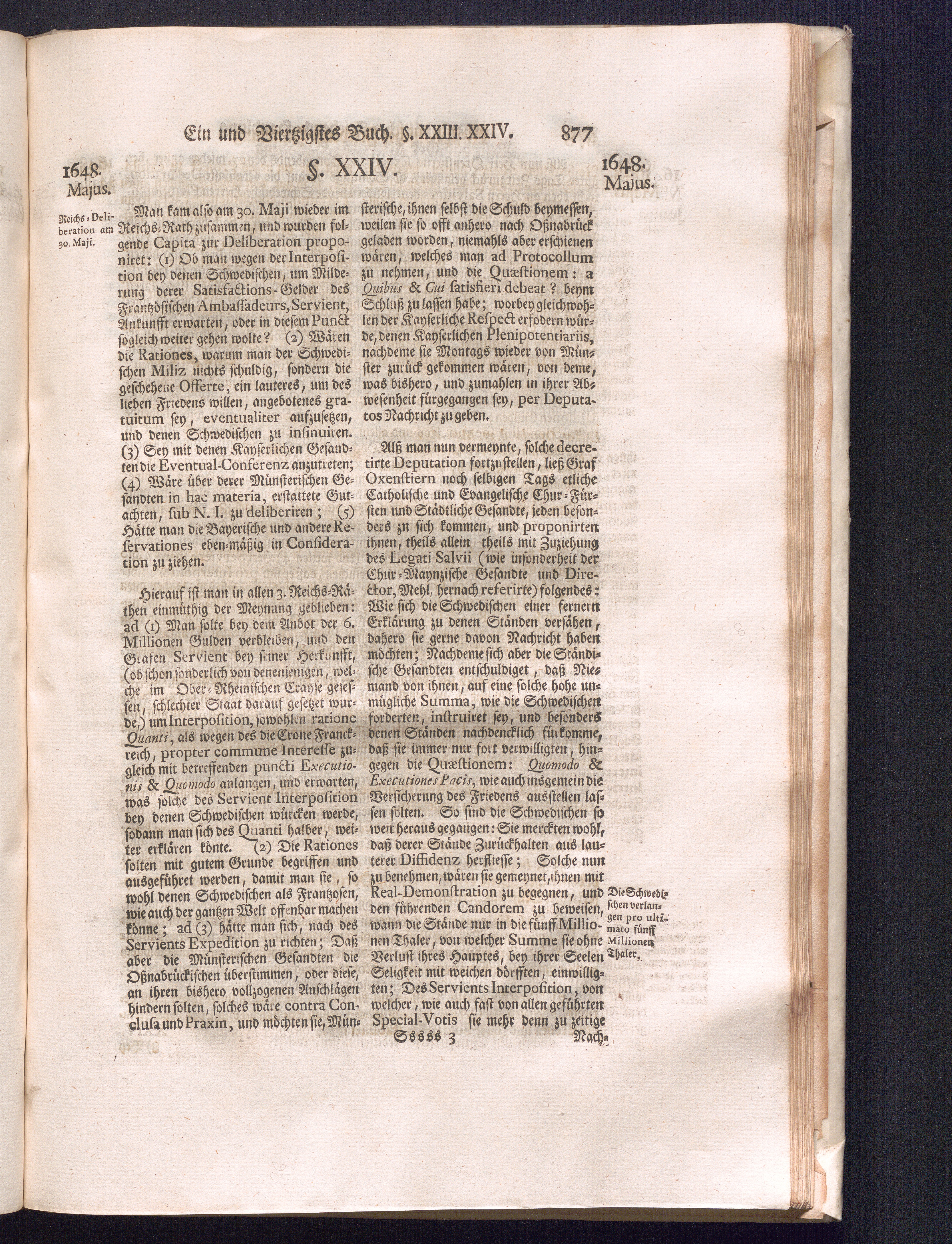 Fünffter Theil (1735) Worinnen enthalten, was vom Schluß des Jahrs 1647. biß in den Monath Junium des Jahrs 1648. zwischen Jhro Römisch-Kayserlichen Majestät, dann den Beyden Cronen Franckreich und Schweden, ingleichen des Heiligen Römischen Reichs Chur-Fürsten, Fürsten und Ständen, zu Oßnabrück und Münster gehandelt worden