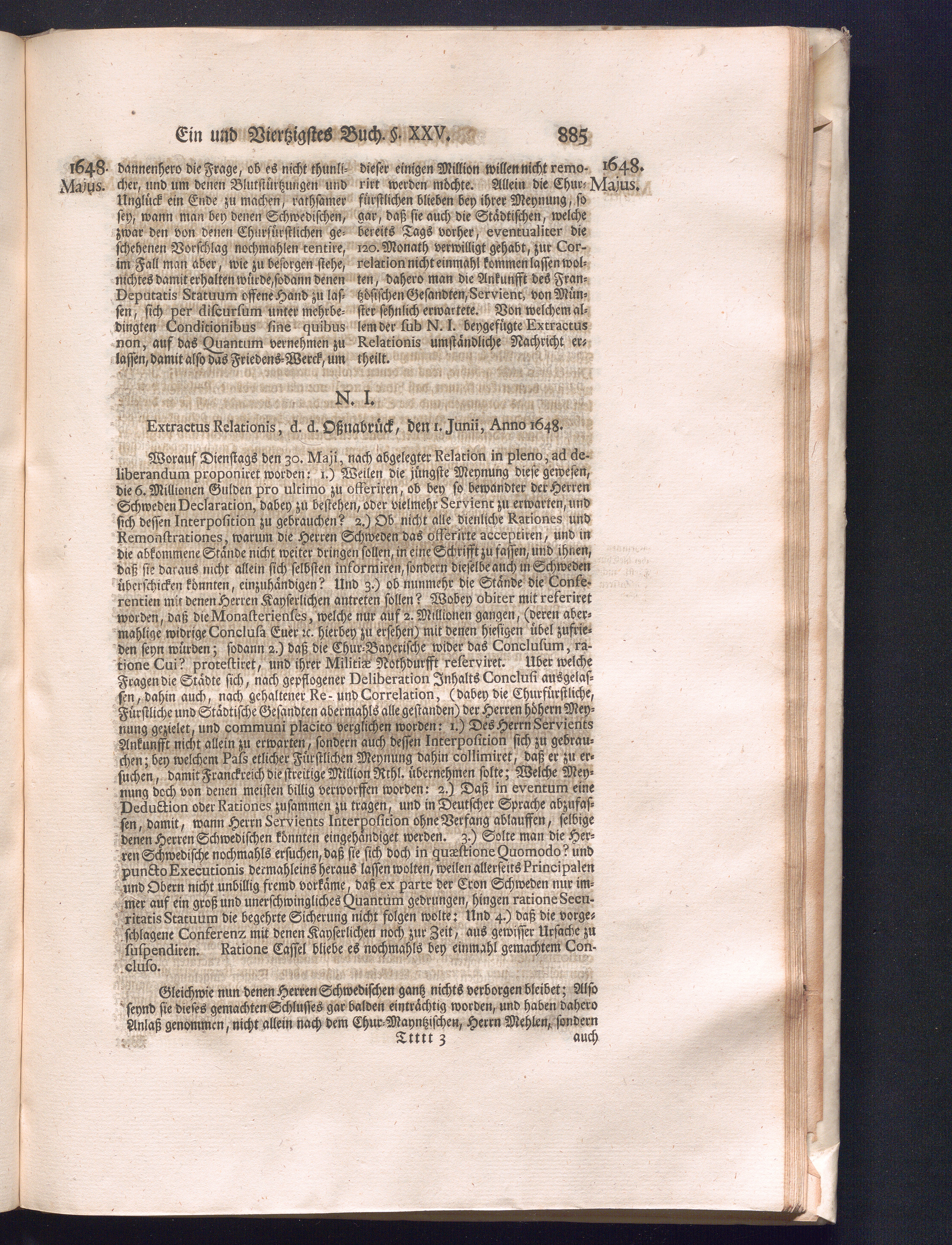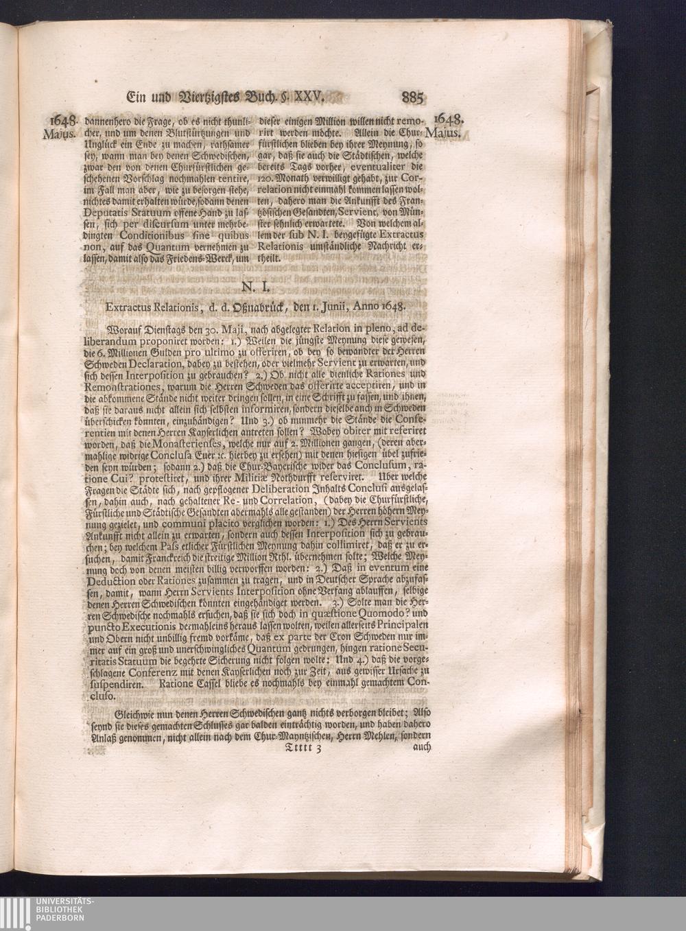 Fünffter Theil (1735) Worinnen enthalten, was vom Schluß des Jahrs 1647. biß in den Monath Junium des Jahrs 1648. zwischen Jhro Römisch-Kayserlichen Majestät, dann den Beyden Cronen Franckreich und Schweden, ingleichen des Heiligen Römischen Reichs Chur-Fürsten, Fürsten und Ständen, zu Oßnabrück und Münster gehandelt worden