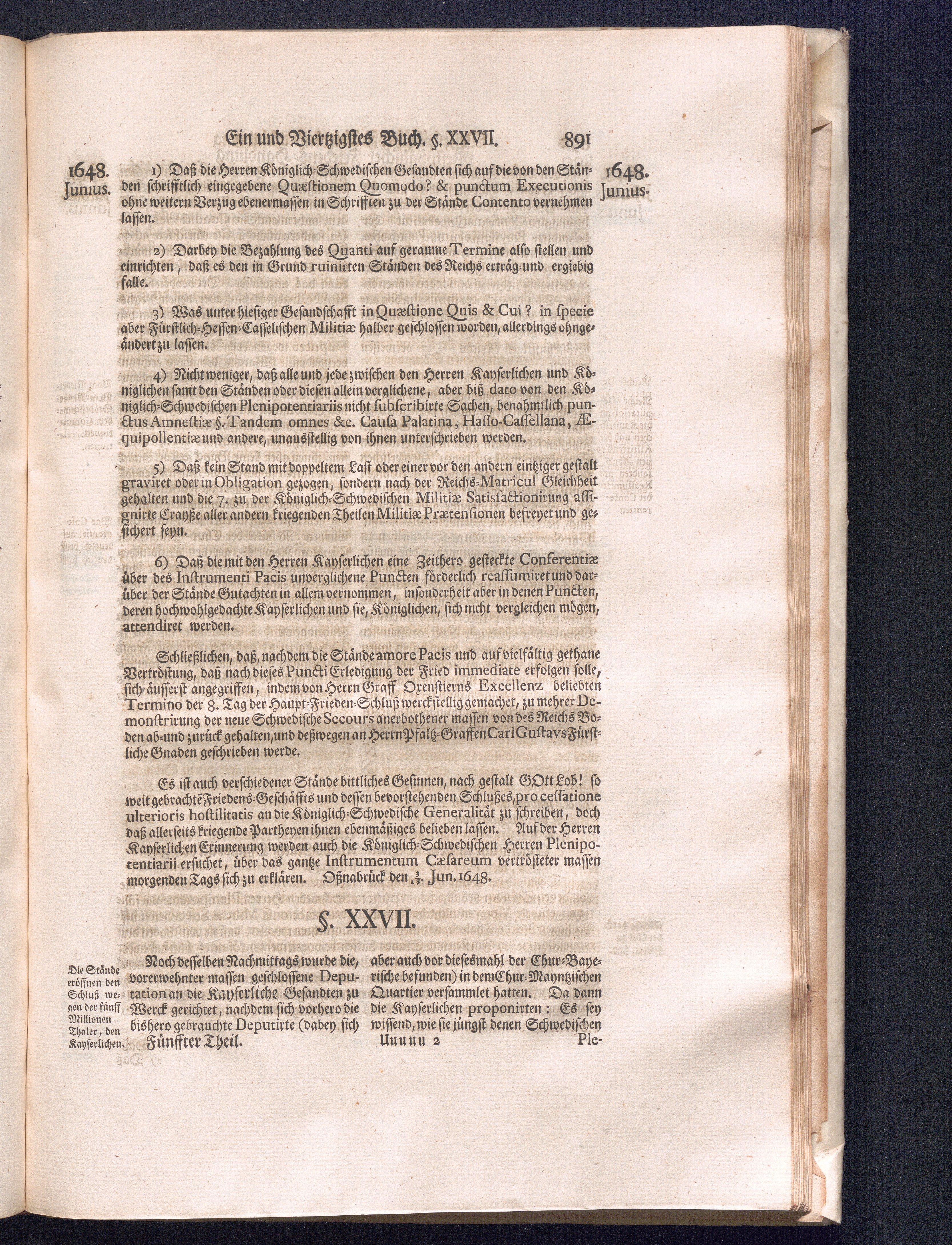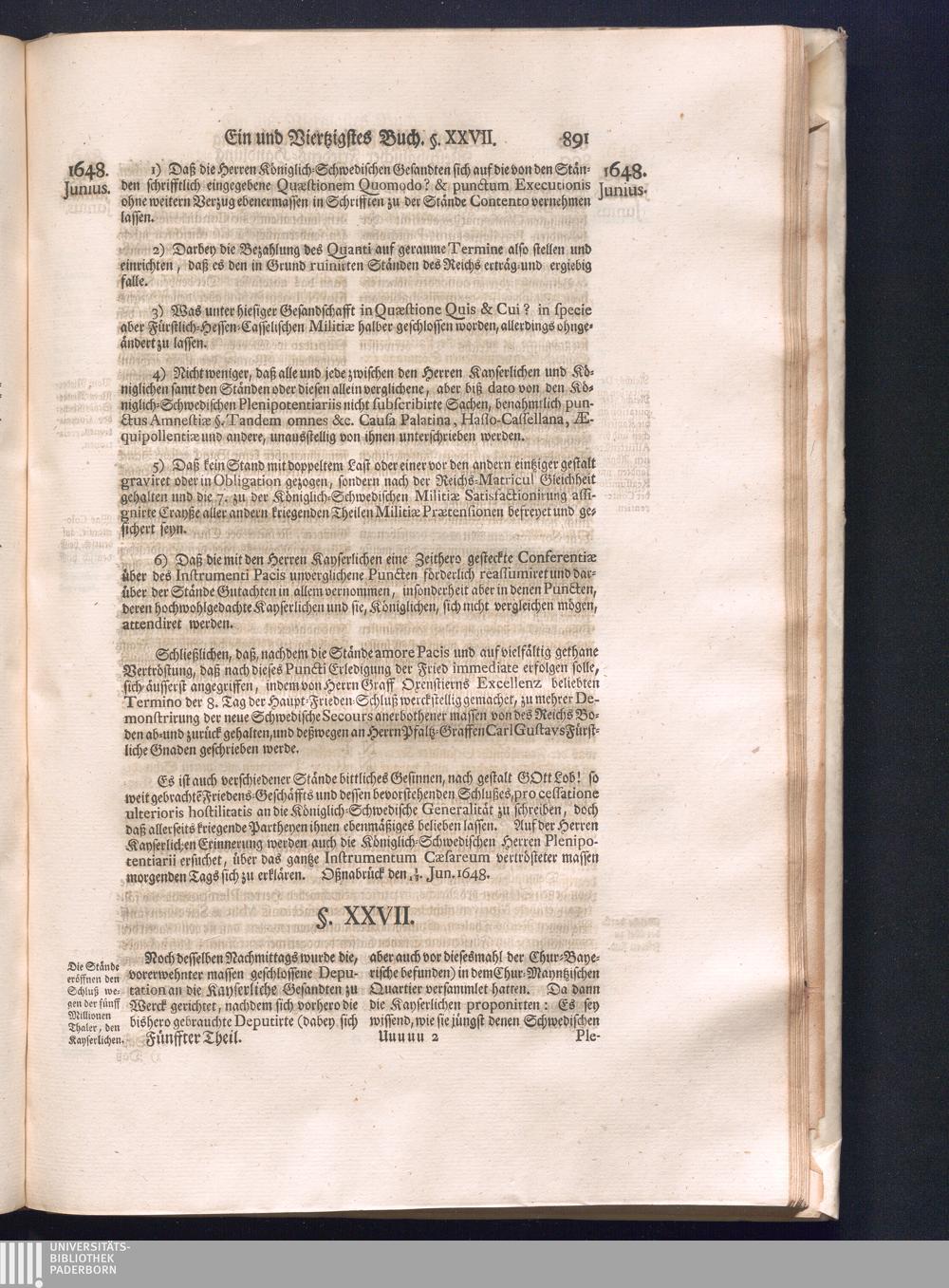 Fünffter Theil (1735) Worinnen enthalten, was vom Schluß des Jahrs 1647. biß in den Monath Junium des Jahrs 1648. zwischen Jhro Römisch-Kayserlichen Majestät, dann den Beyden Cronen Franckreich und Schweden, ingleichen des Heiligen Römischen Reichs Chur-Fürsten, Fürsten und Ständen, zu Oßnabrück und Münster gehandelt worden