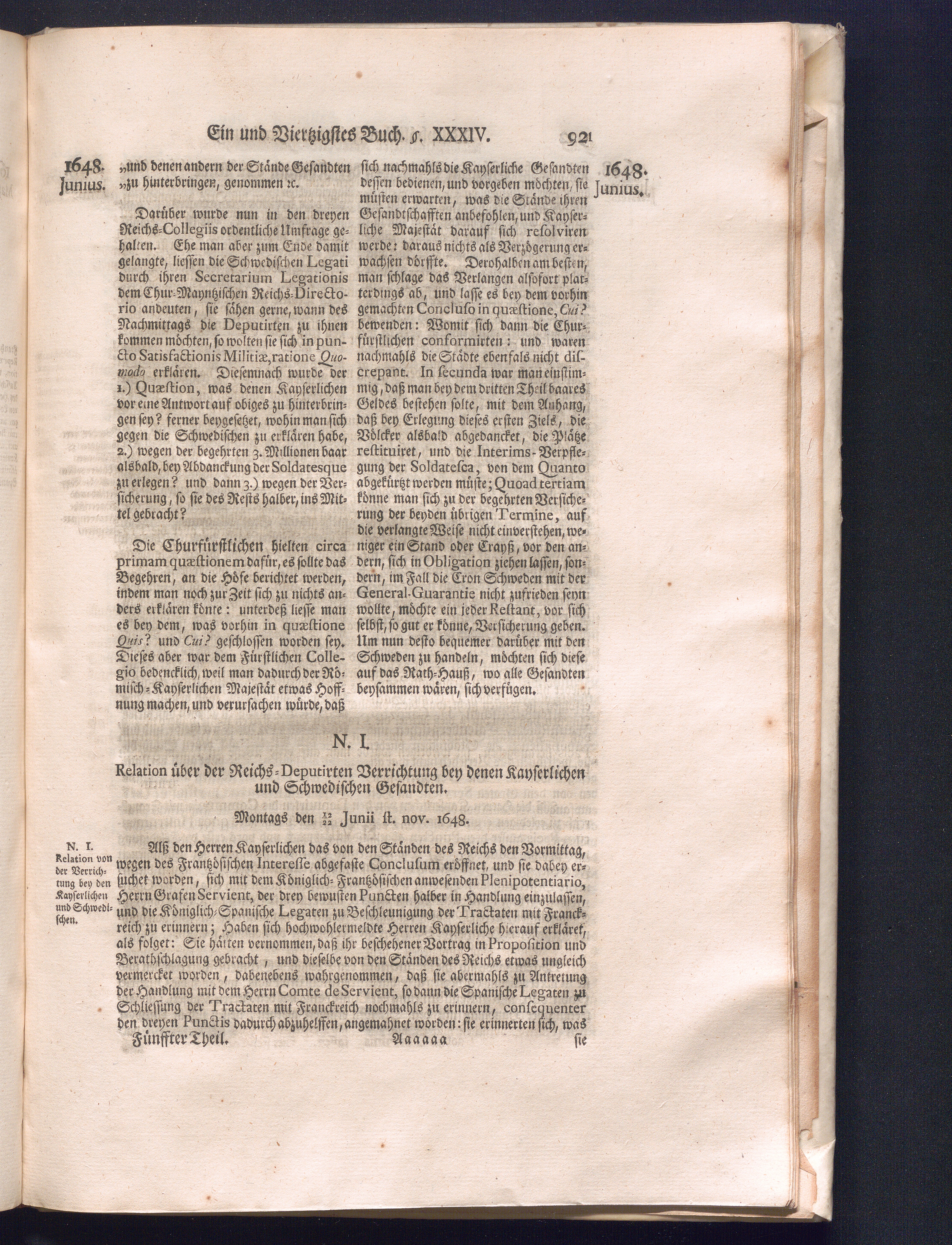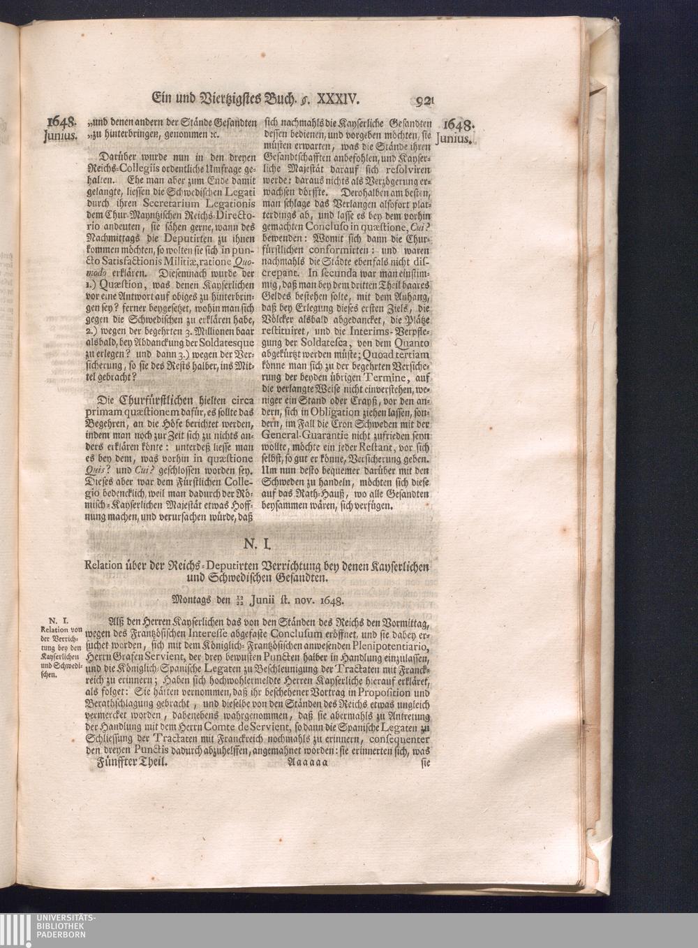 Fünffter Theil (1735) Worinnen enthalten, was vom Schluß des Jahrs 1647. biß in den Monath Junium des Jahrs 1648. zwischen Jhro Römisch-Kayserlichen Majestät, dann den Beyden Cronen Franckreich und Schweden, ingleichen des Heiligen Römischen Reichs Chur-Fürsten, Fürsten und Ständen, zu Oßnabrück und Münster gehandelt worden