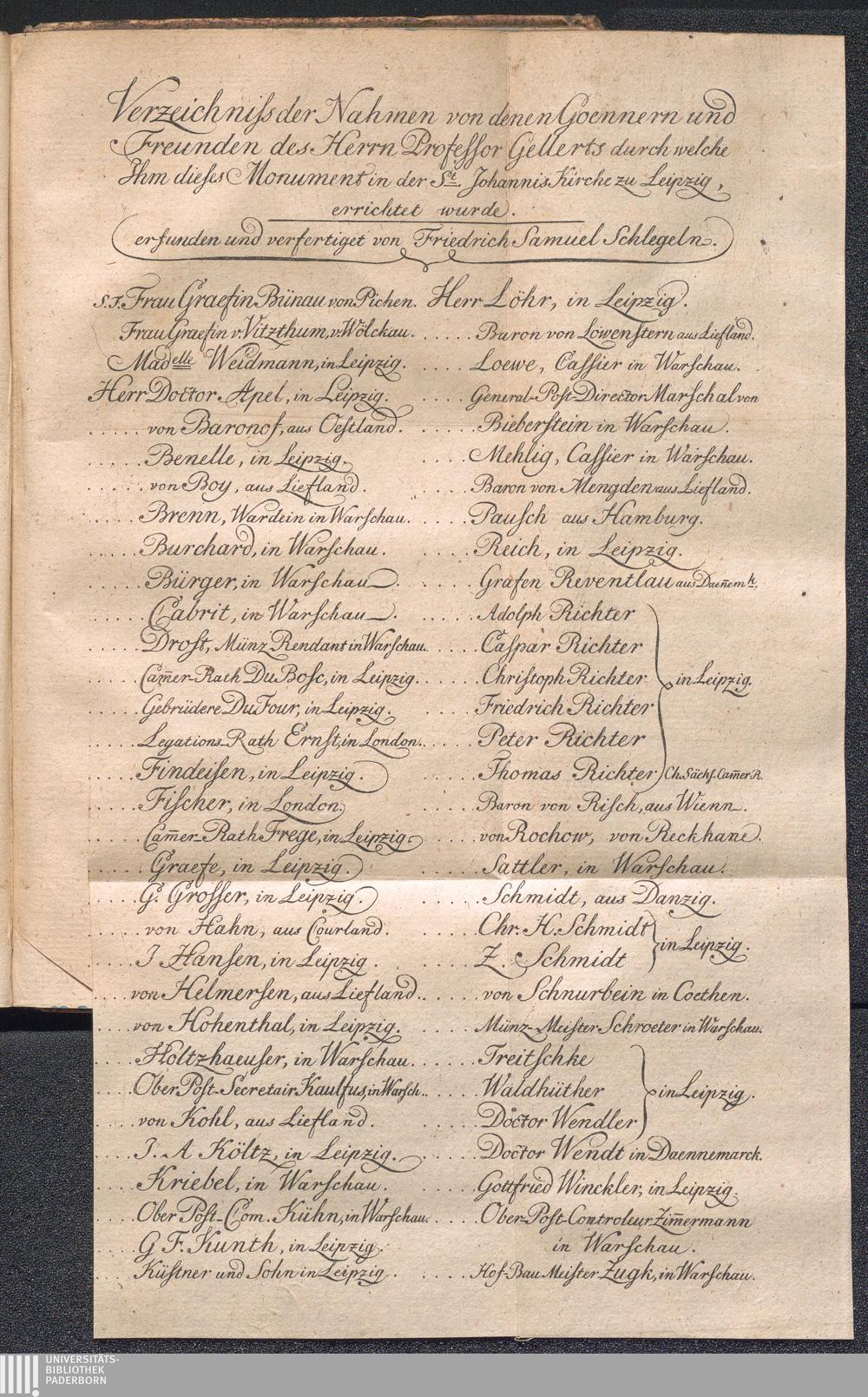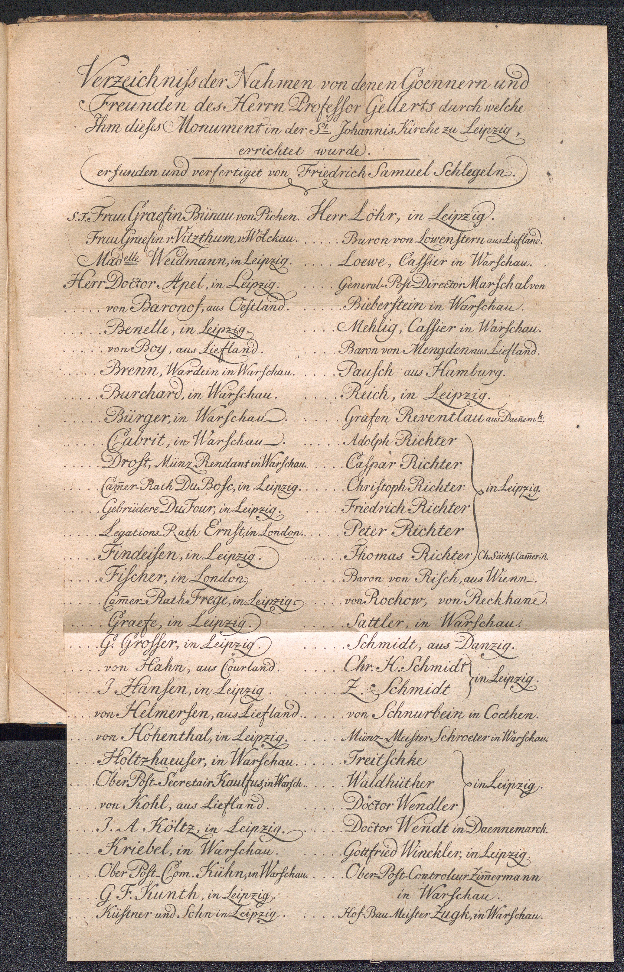 Verzeichniss der Nahmen von denen Goennern und Freunden des Herr Professor Gellerts[...]