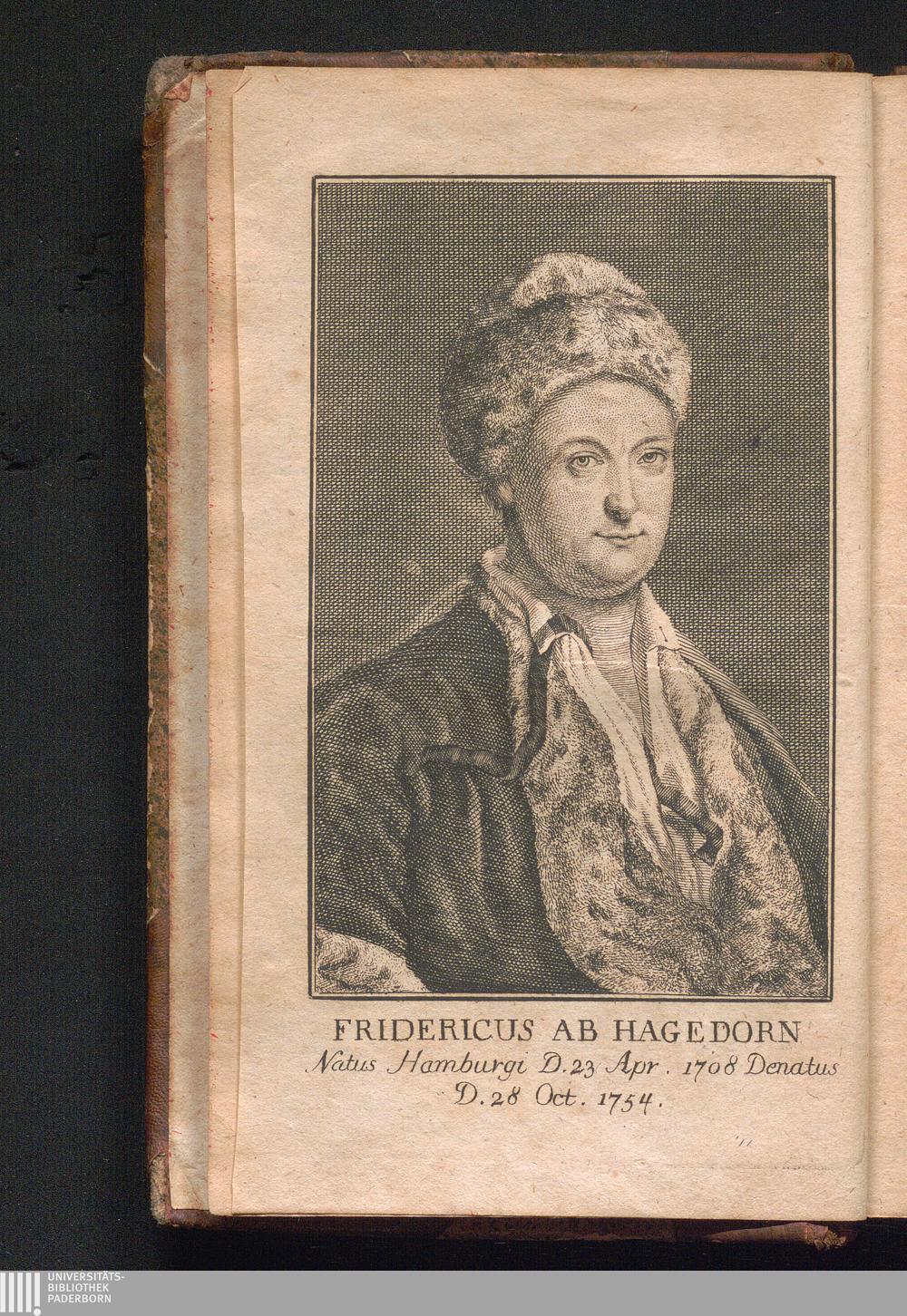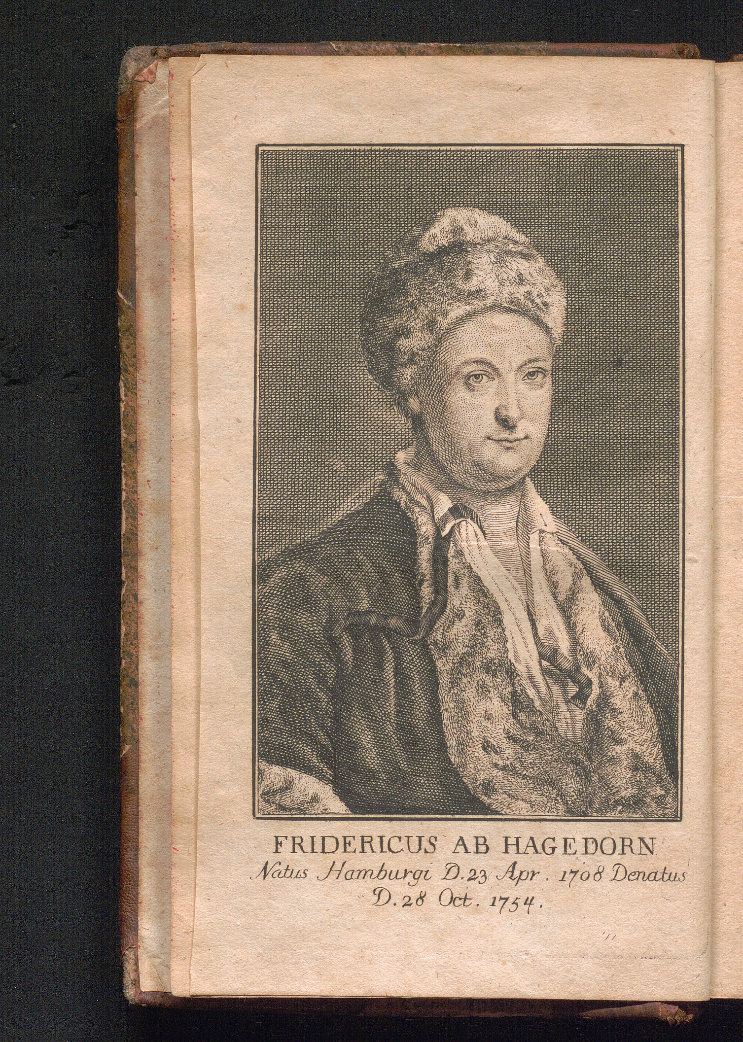 Fridericus Ab Hagedorn Natus Hamburgi D. 23. Apr. 1708 Denatus D. 28 Oct. 1754.