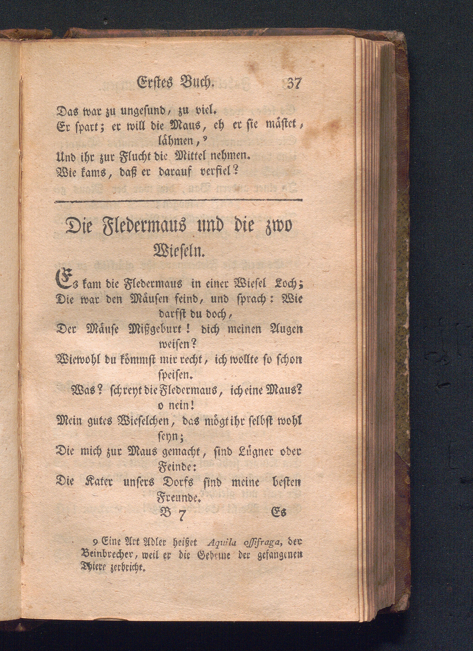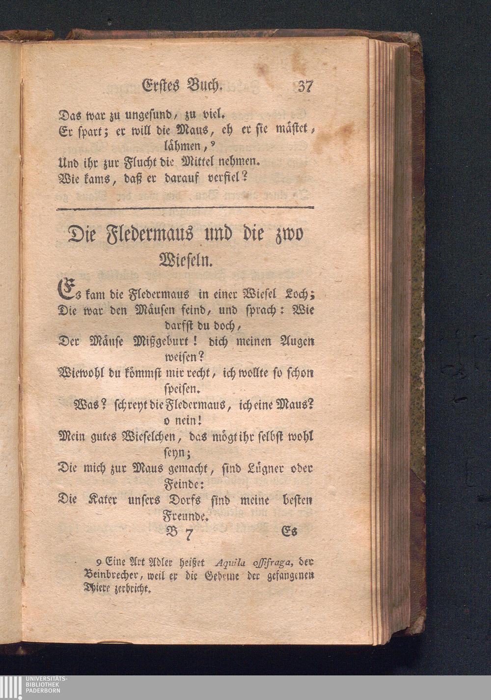 Die Fledermaus und die zwo Wieseln. S. Aesopi Fab. n. 109. La Fontaine, F. 27. und[...]