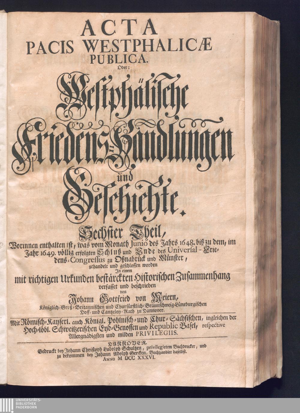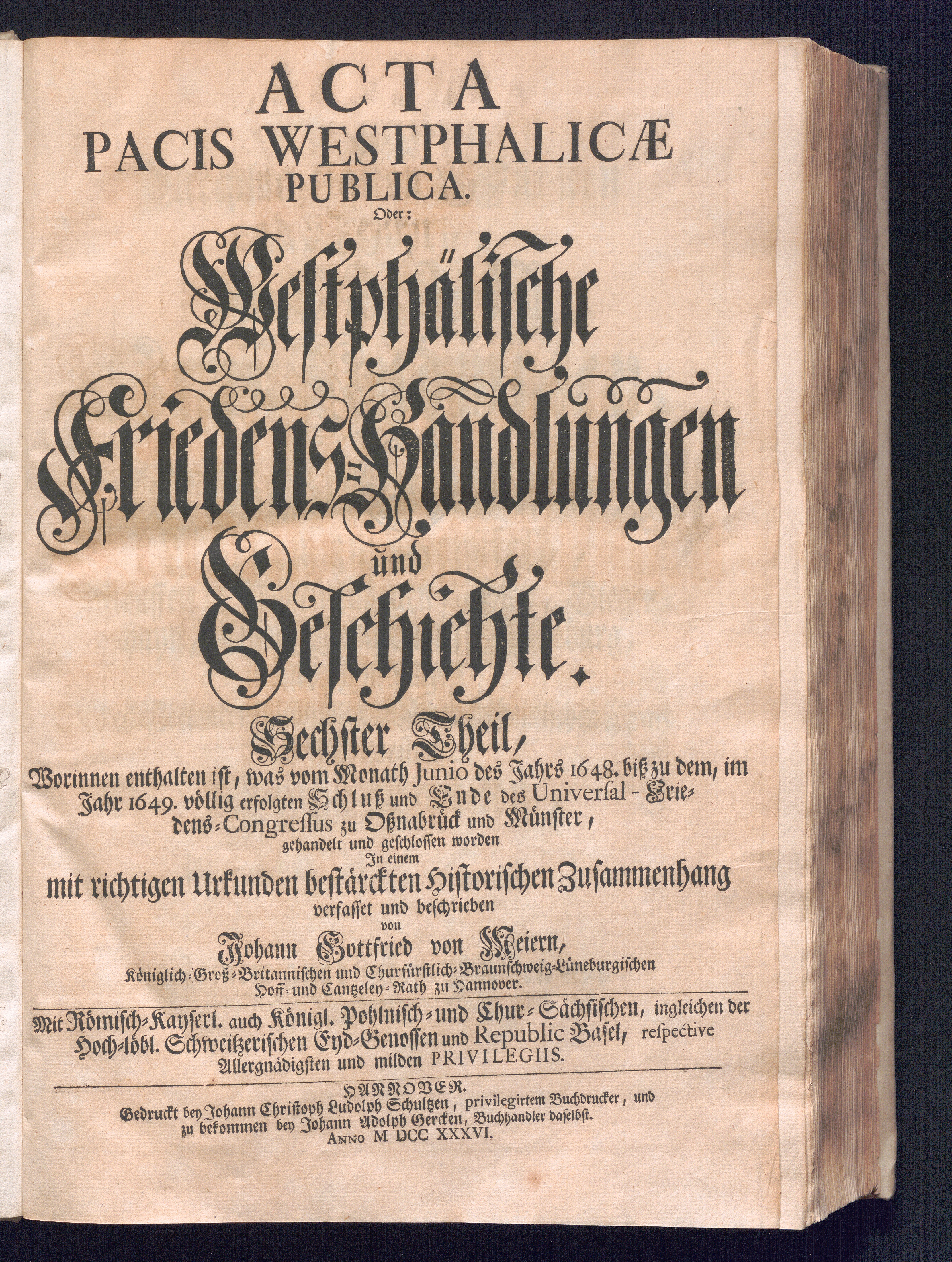 Sechster Theil (1736) Worinnen enthalten ist, was vom Monath Junio des Jahrs 1648. biß zu dem, im Jahr 1649. völlig erfolgten Schluß und Ende des Universal-Friedens-Congressus zu Oßnabrück und Münster, gehandelt und geschlossen worden