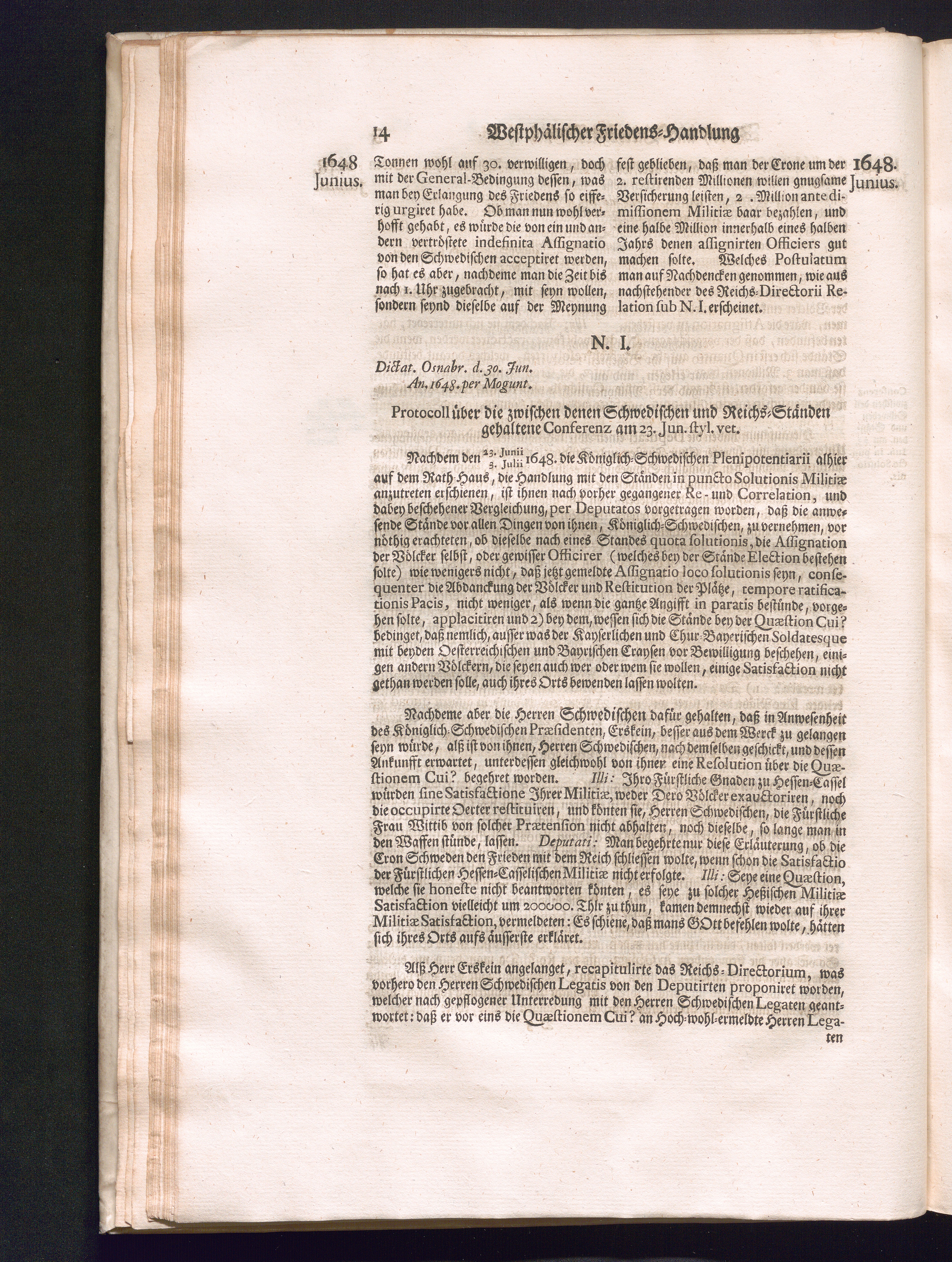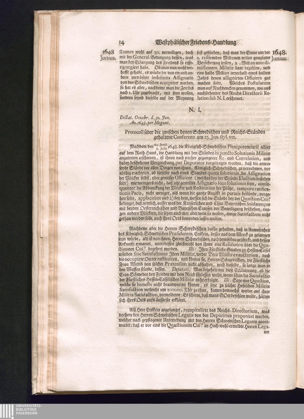 Sechster Theil (1736) Worinnen enthalten ist, was vom Monath Junio des Jahrs 1648. biß zu dem, im Jahr 1649. völlig erfolgten Schluß und Ende des Universal-Friedens-Congressus zu Oßnabrück und Münster, gehandelt und geschlossen worden