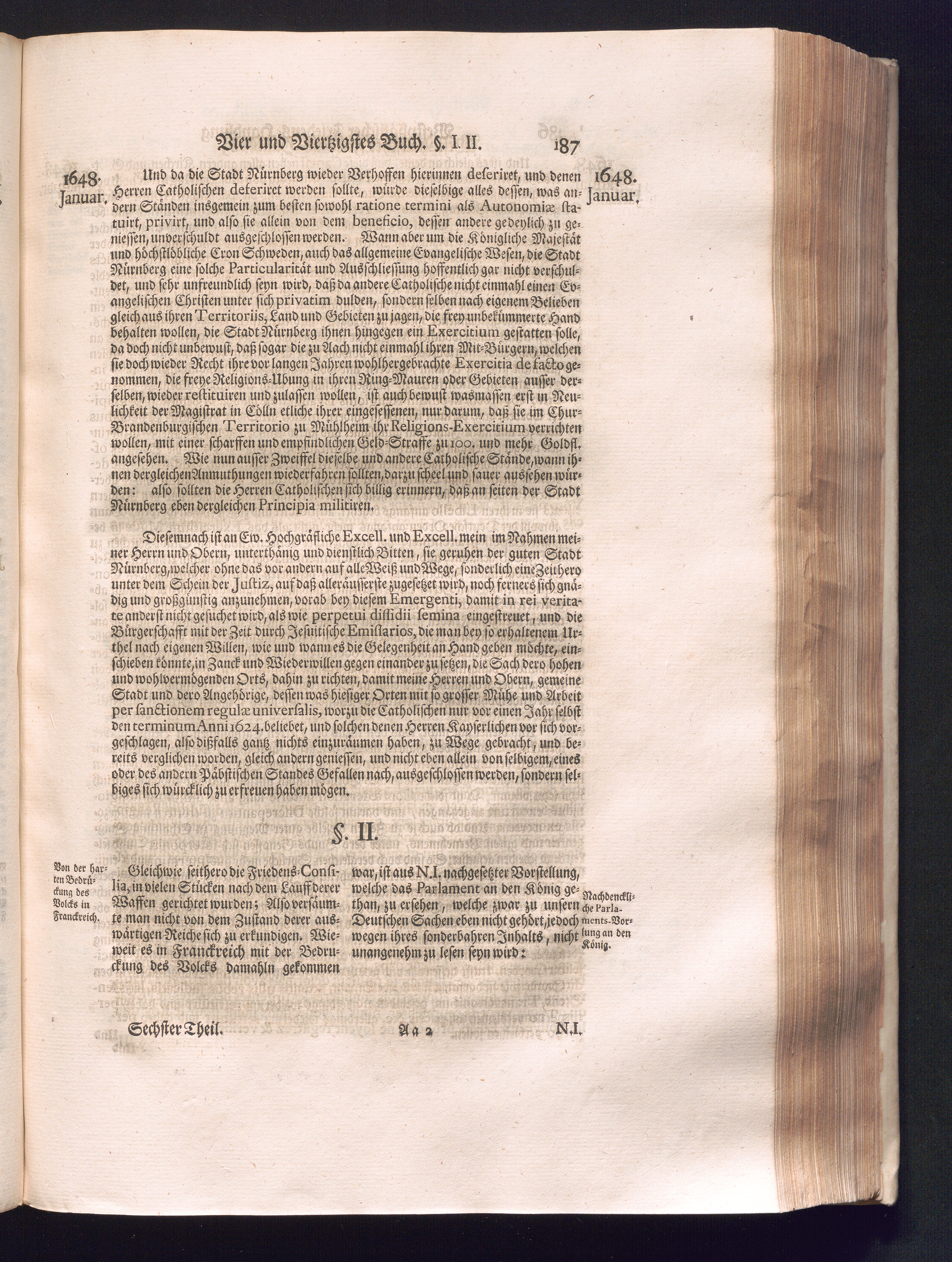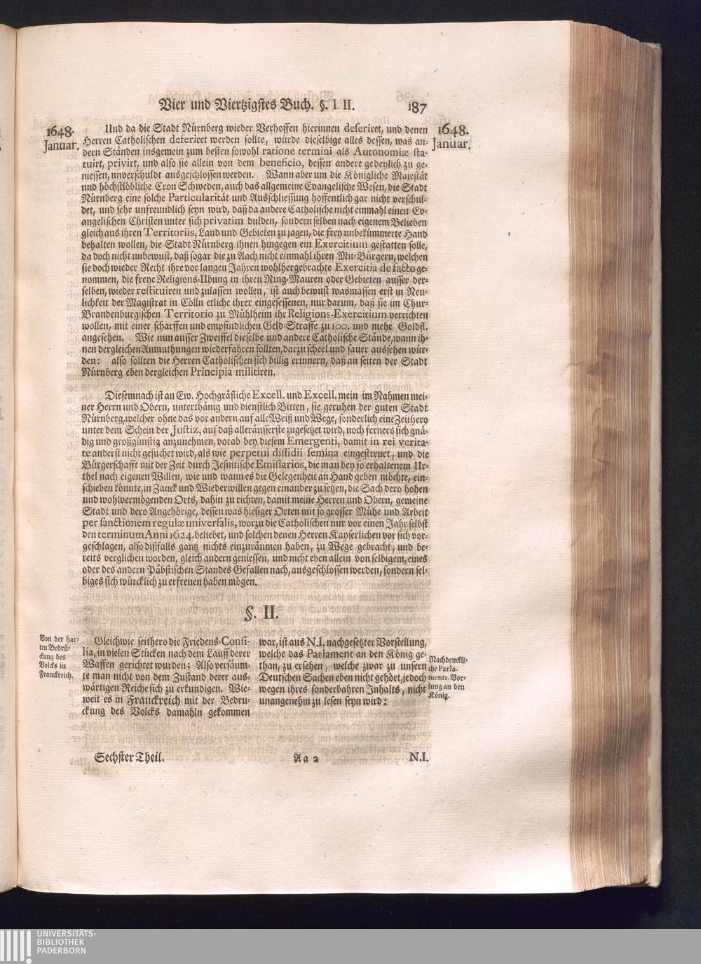 Sechster Theil (1736) Worinnen enthalten ist, was vom Monath Junio des Jahrs 1648. biß zu dem, im Jahr 1649. völlig erfolgten Schluß und Ende des Universal-Friedens-Congressus zu Oßnabrück und Münster, gehandelt und geschlossen worden