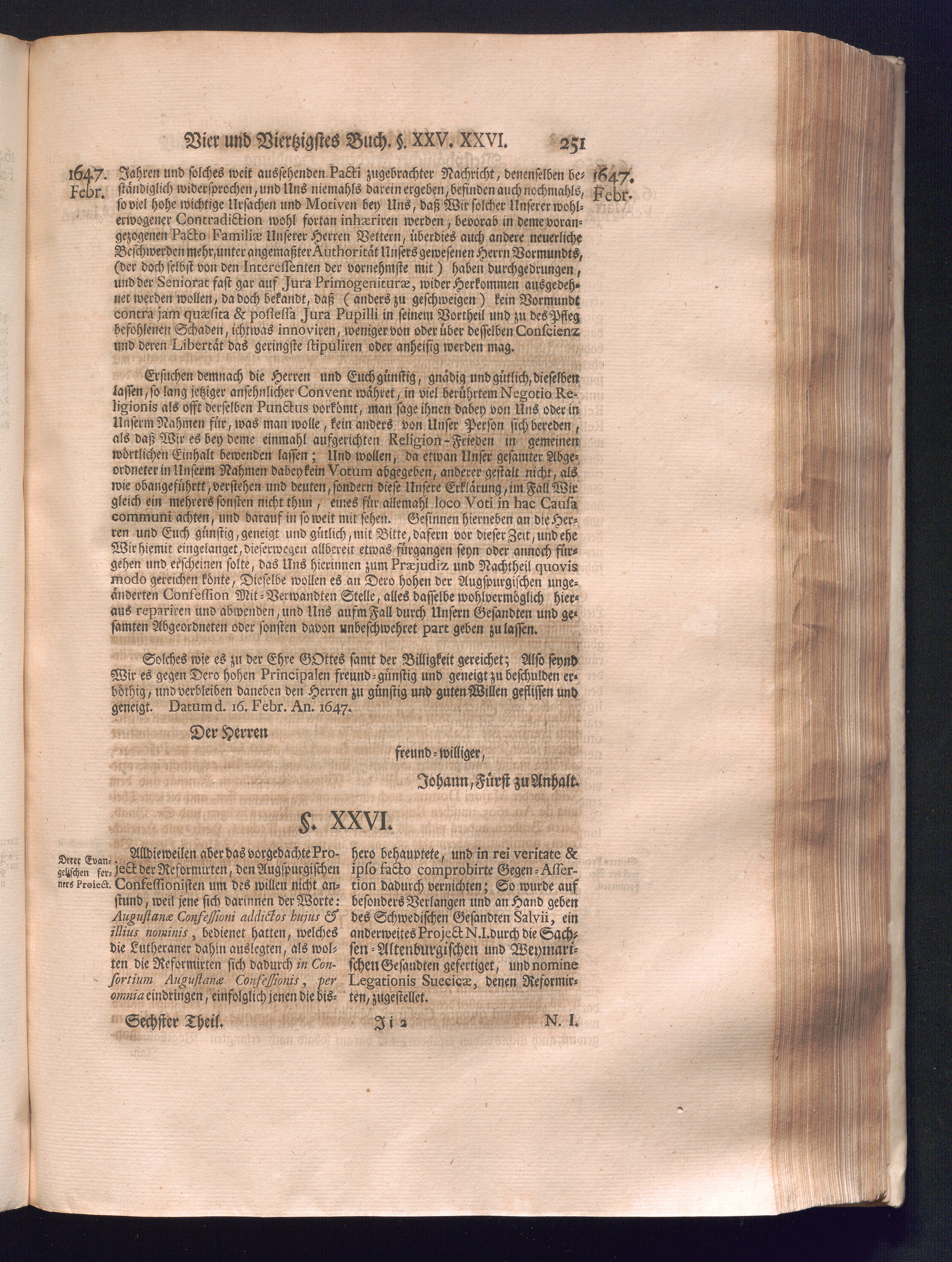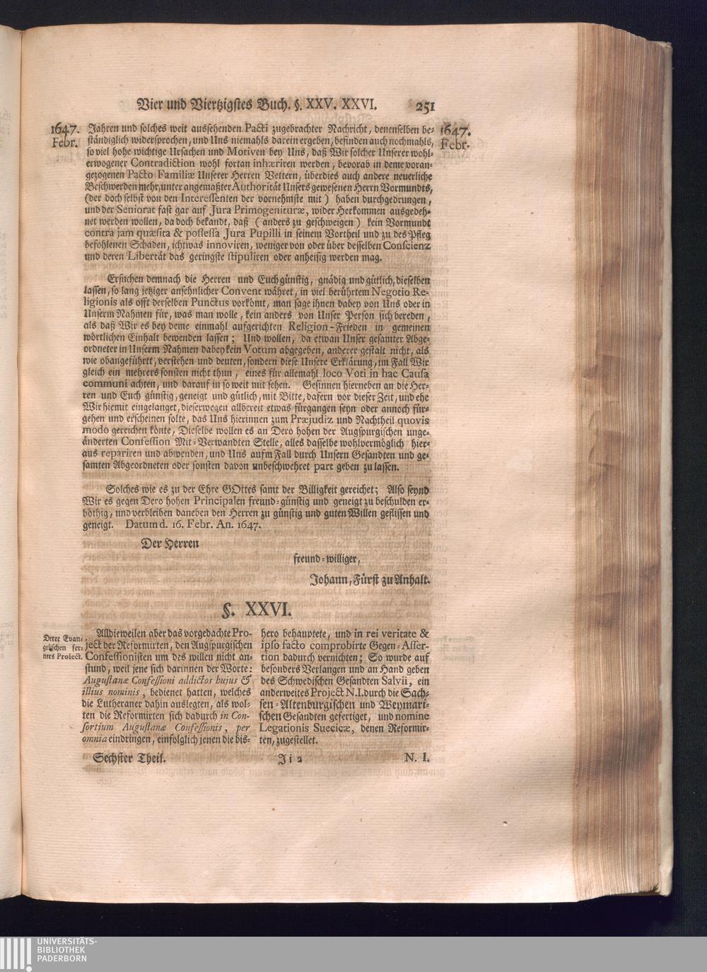 Sechster Theil (1736) Worinnen enthalten ist, was vom Monath Junio des Jahrs 1648. biß zu dem, im Jahr 1649. völlig erfolgten Schluß und Ende des Universal-Friedens-Congressus zu Oßnabrück und Münster, gehandelt und geschlossen worden