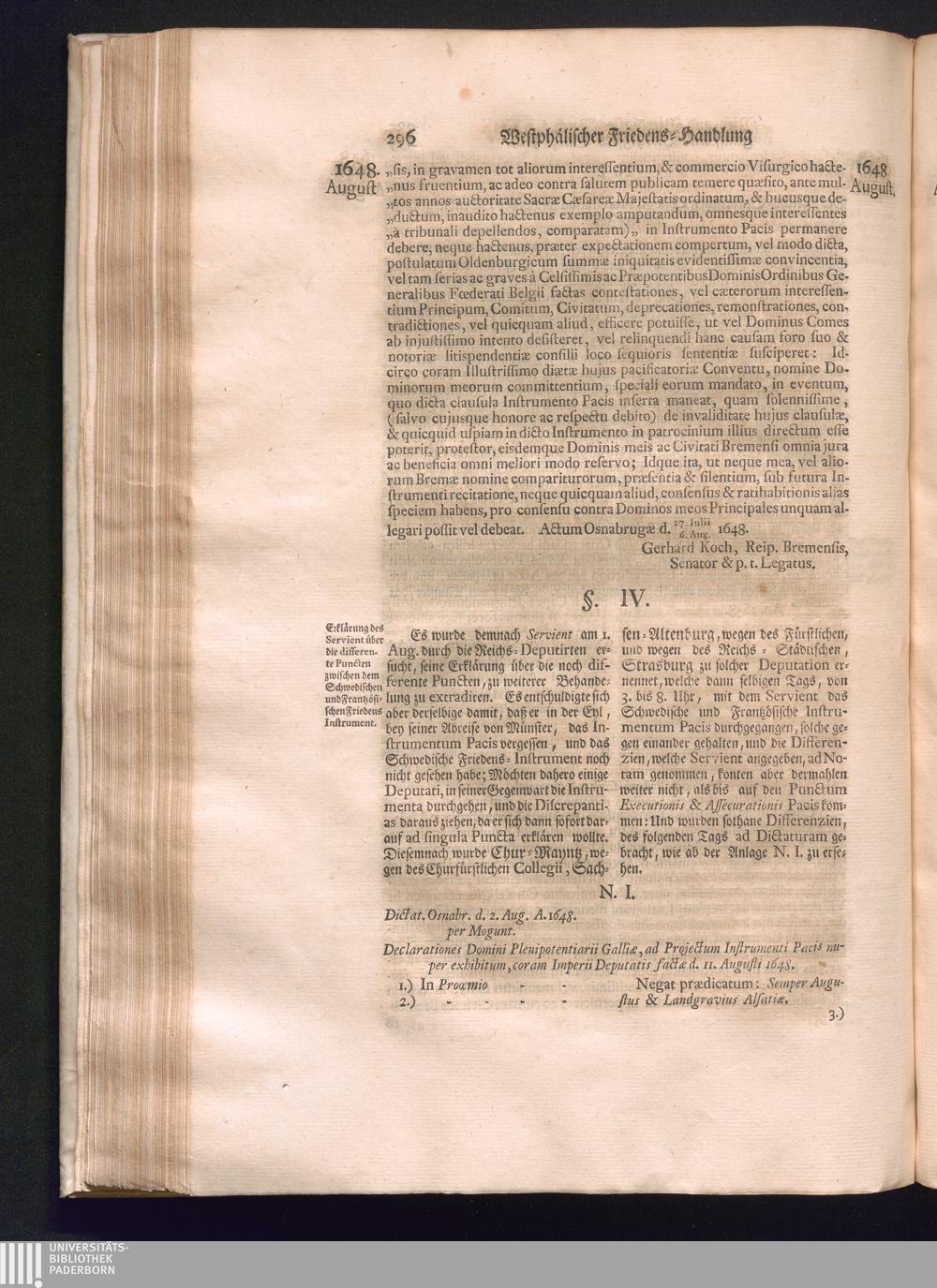Sechster Theil (1736) Worinnen enthalten ist, was vom Monath Junio des Jahrs 1648. biß zu dem, im Jahr 1649. völlig erfolgten Schluß und Ende des Universal-Friedens-Congressus zu Oßnabrück und Münster, gehandelt und geschlossen worden
