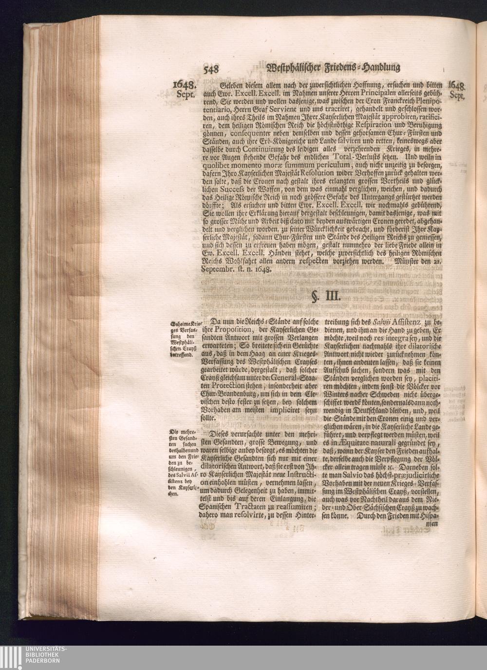 Sechster Theil (1736) Worinnen enthalten ist, was vom Monath Junio des Jahrs 1648. biß zu dem, im Jahr 1649. völlig erfolgten Schluß und Ende des Universal-Friedens-Congressus zu Oßnabrück und Münster, gehandelt und geschlossen worden