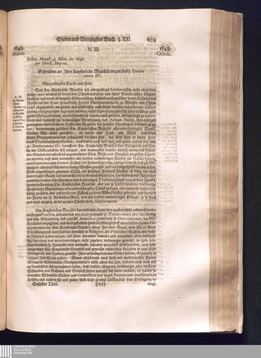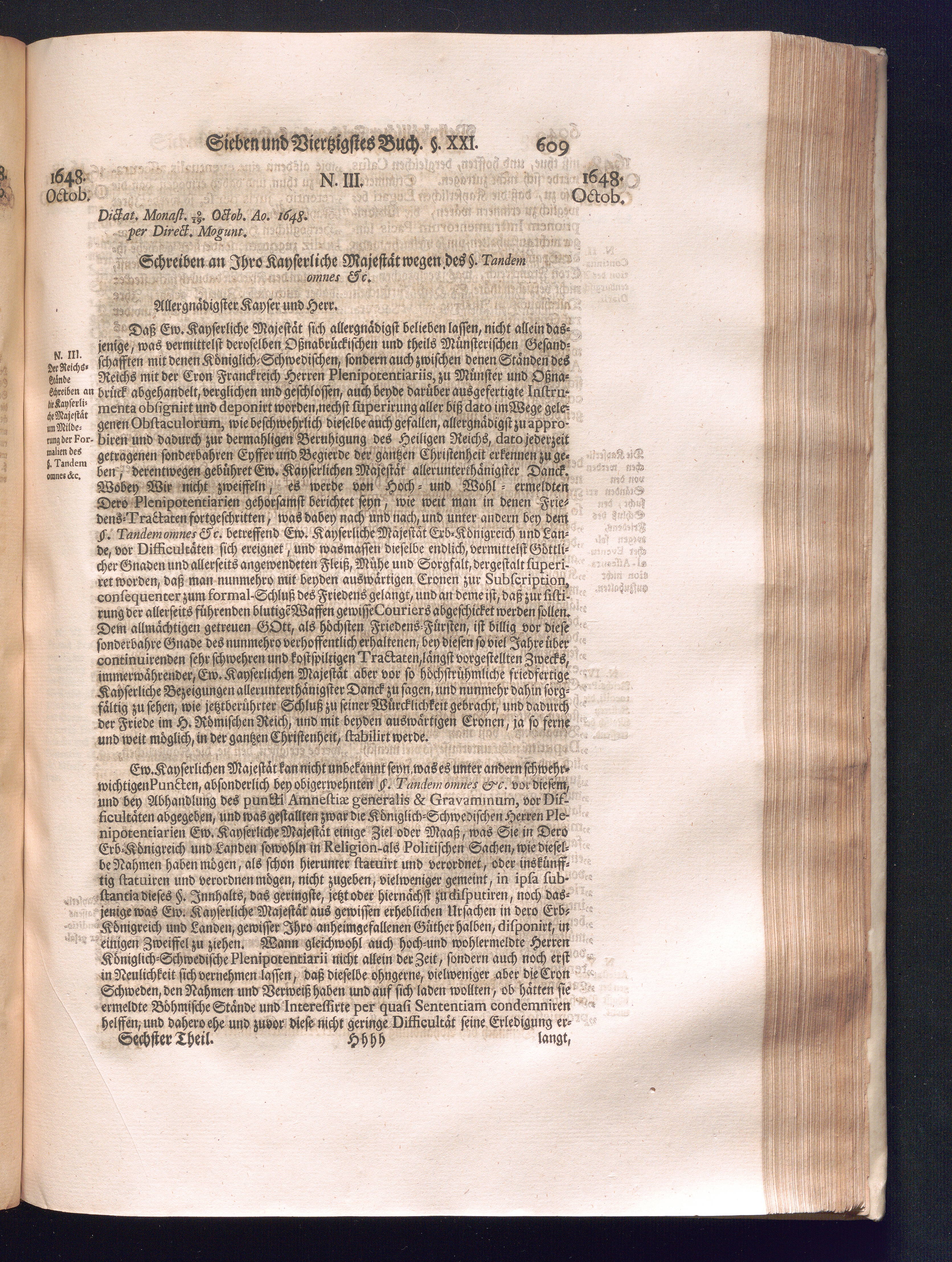 Sechster Theil (1736) Worinnen enthalten ist, was vom Monath Junio des Jahrs 1648. biß zu dem, im Jahr 1649. völlig erfolgten Schluß und Ende des Universal-Friedens-Congressus zu Oßnabrück und Münster, gehandelt und geschlossen worden