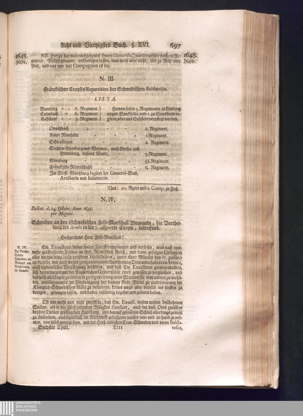 Sechster Theil (1736) Worinnen enthalten ist, was vom Monath Junio des Jahrs 1648. biß zu dem, im Jahr 1649. völlig erfolgten Schluß und Ende des Universal-Friedens-Congressus zu Oßnabrück und Münster, gehandelt und geschlossen worden