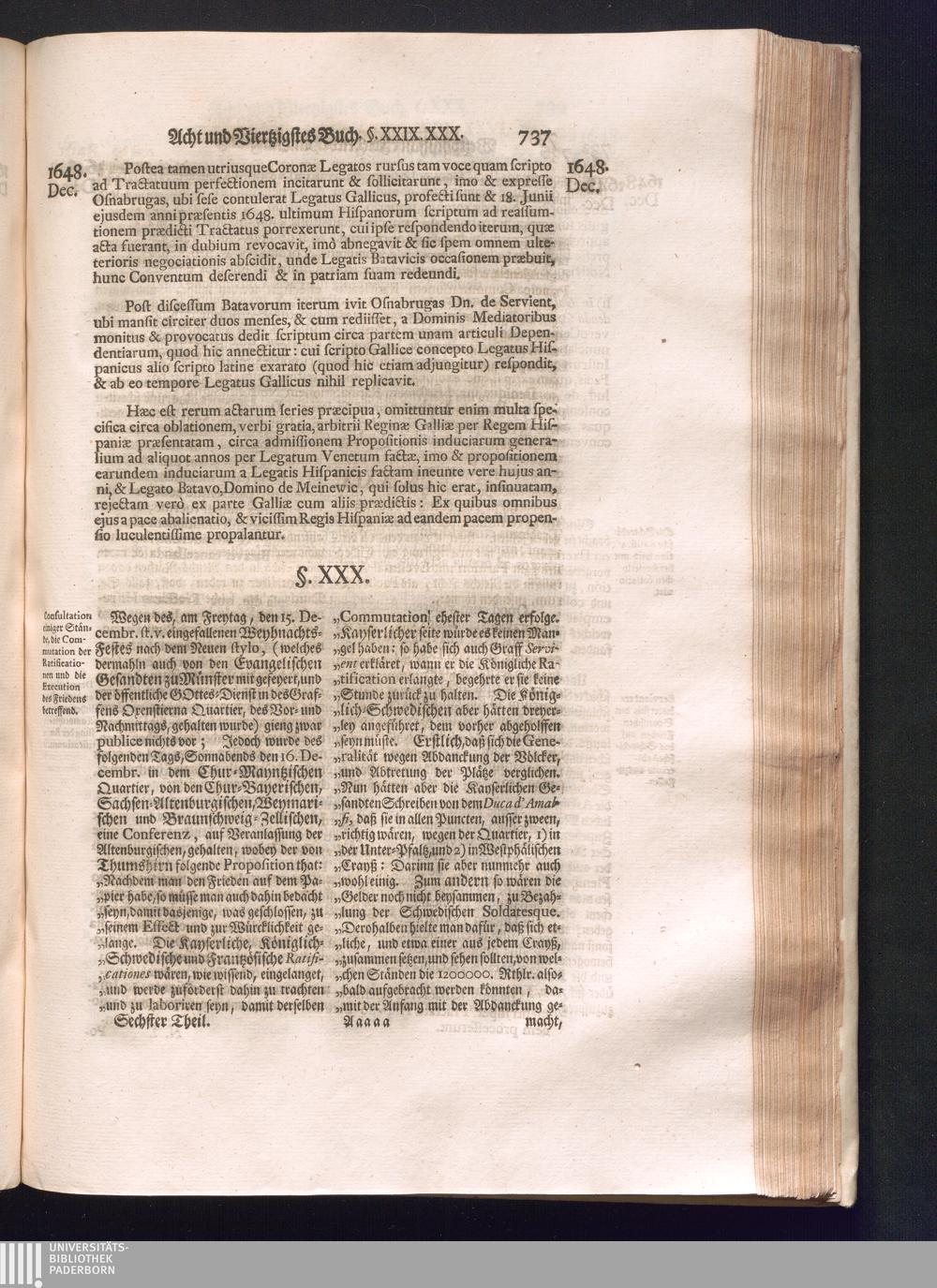 Sechster Theil (1736) Worinnen enthalten ist, was vom Monath Junio des Jahrs 1648. biß zu dem, im Jahr 1649. völlig erfolgten Schluß und Ende des Universal-Friedens-Congressus zu Oßnabrück und Münster, gehandelt und geschlossen worden