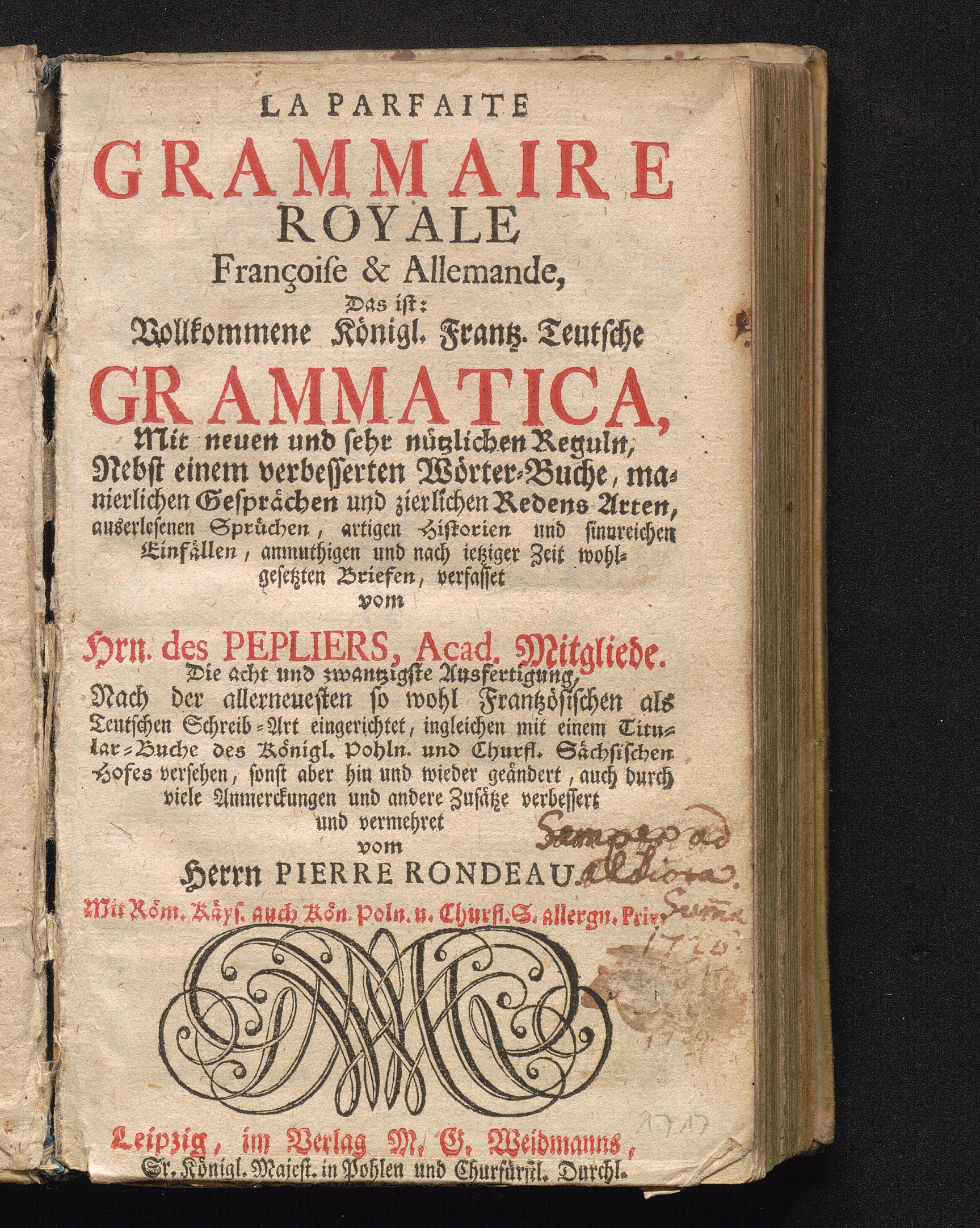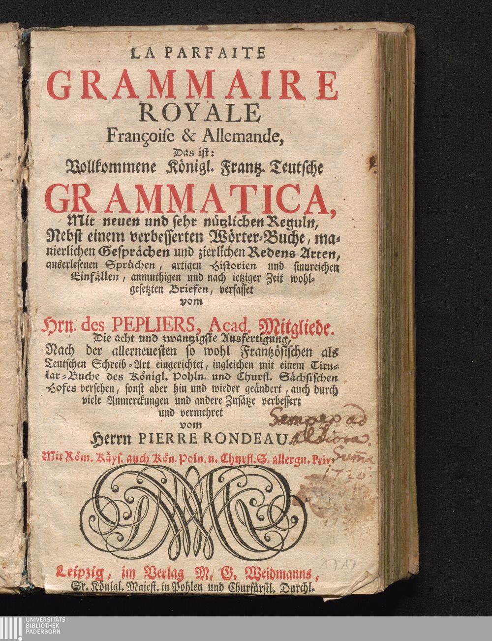 La Parfaite Grammaire Royale Françoise & Allemande, Das ist: Vollkomene Königl. Frantz. Teutsche Grammatica, : Mit neuen und sehr nützlichen Reguln, Nebst einem verbesserten Wörter-Buche, manierlichen Gesprächen und zierlichen Redens Arten, auserlesenen Sprüchen, artigen Historien und sinnreichen Einfällen, anmuthigen und nach ietziger Zeit wohlgesetzen Briefen / verfasset vom Hrn. des Pepliers, Acad. Mitgliede